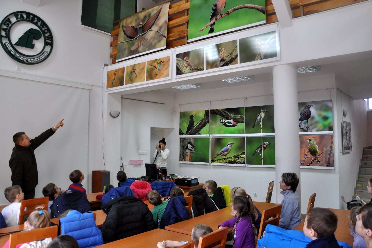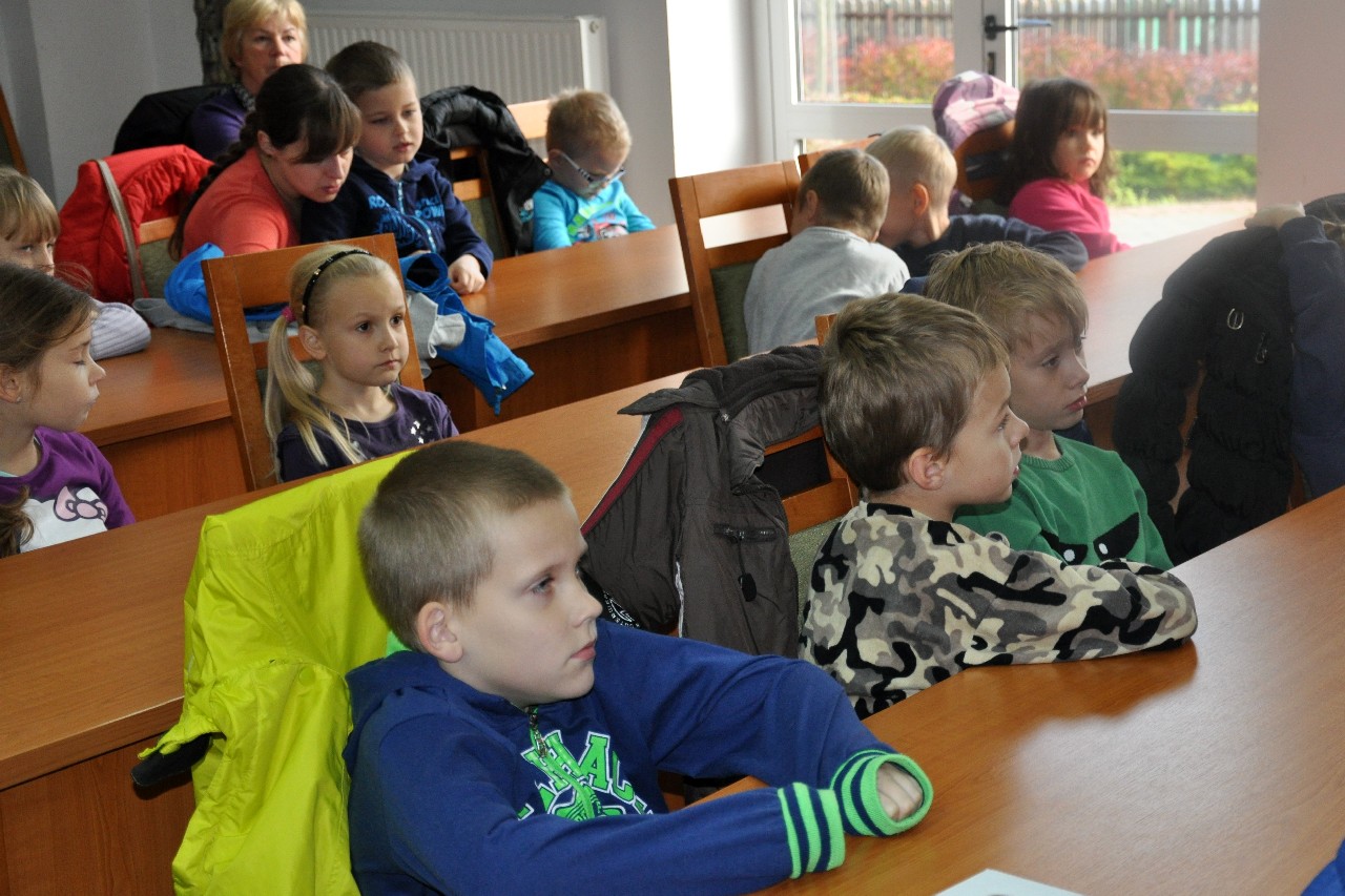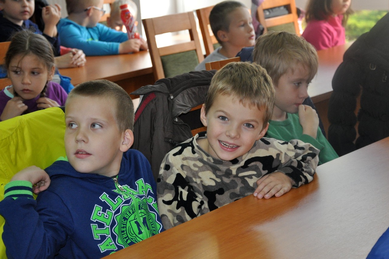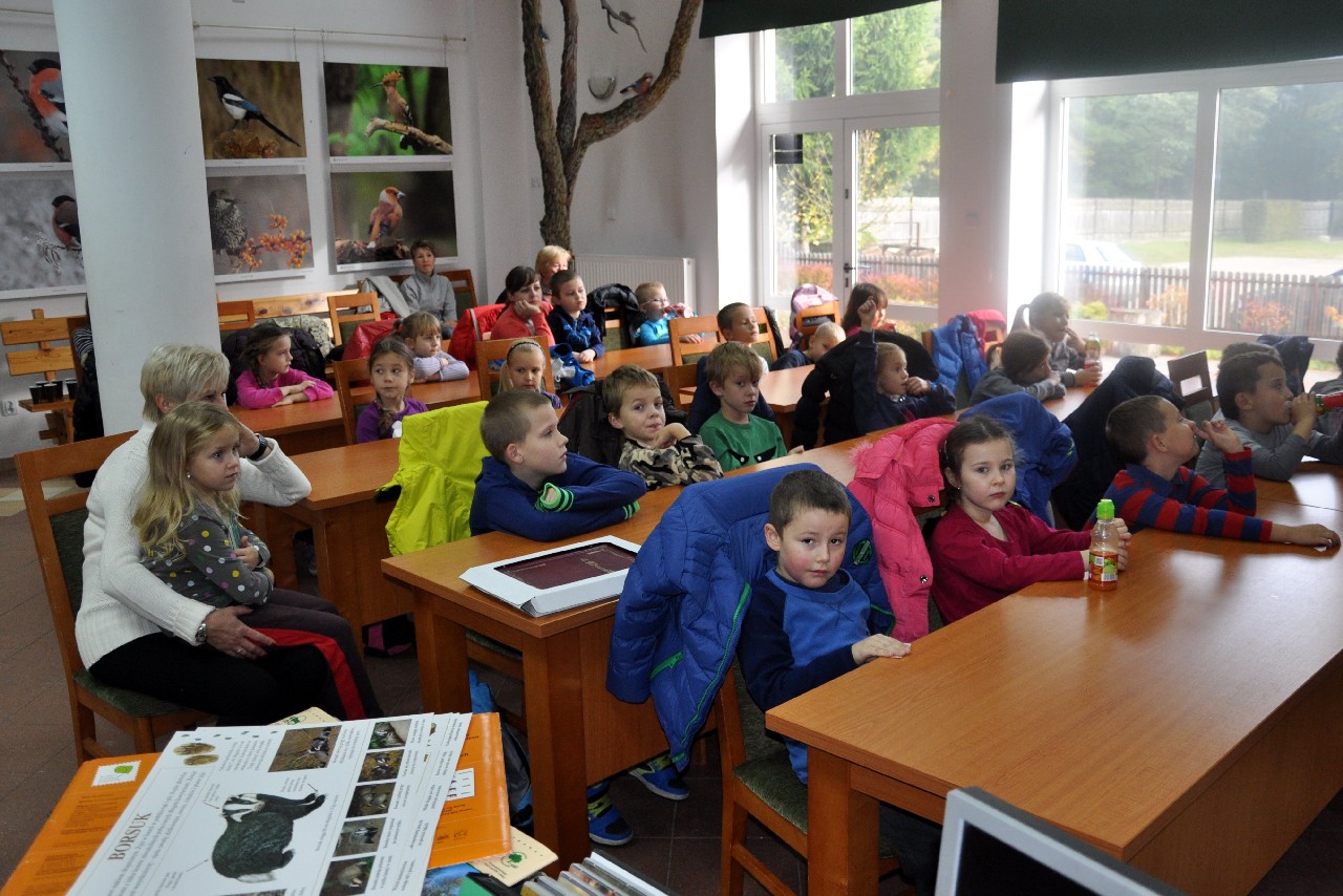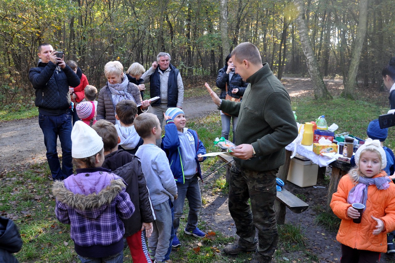 dzieciom fascynujący świat roślin i zwierząt leśnych. Wszyscy byli pod ogromnym wrażeniem - kiedy oglądając film o lesie - słuchali również odgłosów leśnej zwierzyny. Następnie, spacerując leśnymi ścieżkami, dzieci szukały darów jesieni, obserwowały ptaki przez lornetkę, rozpoznawały znane gatunki drzew i krzewów, które o tej porze roku są niezwykle malownicze. Lupa z kolei pozwoliła na podglądanie maleńkich żuczków w ściółce leśnej, drobnych roślinek i obserwację kory drzew. Uczniowie świetnie bawili się też uczestnicząc w różnych konkursach wiedzy o lesie, oraz wesołych zabawach – z nagrodami. Największą jednak frajdą było samodzielne pieczenie kiełbasek w ognisku, przygotowanym przez rodziców. Kiełbaski smakowały wybornie, tak samo jak pieczony chlebek. Na zakończenie spotkania dzieci wręczyły Panu Leśniczemu podziękowanie za wspaniałą lekcję „żywej przyrody” oraz drobny upominek / wykonany przez Mamę naszego kolegi, za co bardzo Dziękujemy!/. kolei dzieci otrzymały książeczki – przewodniki po lesie, które wykorzystają na zajęciach w szkole. Pełni wiedzy o lesie i niezapomnianych wrażeń dzieci – też pieszo - wróciły do szkoły.
