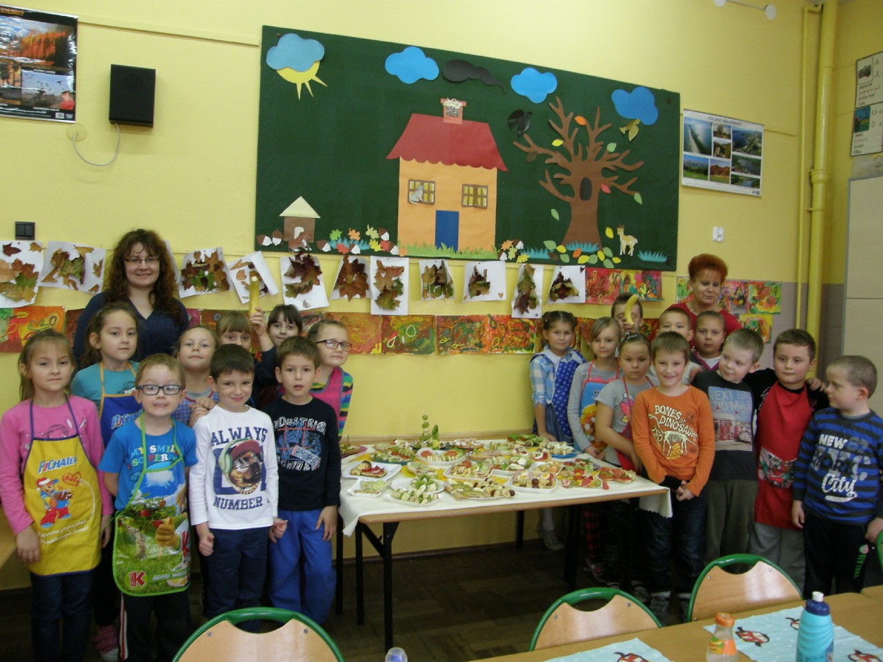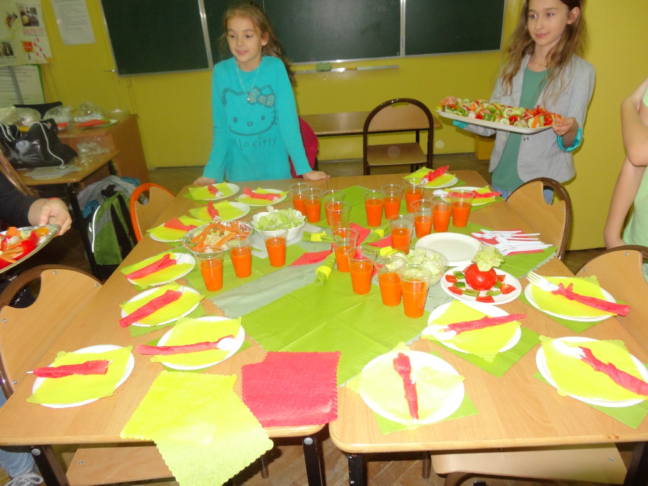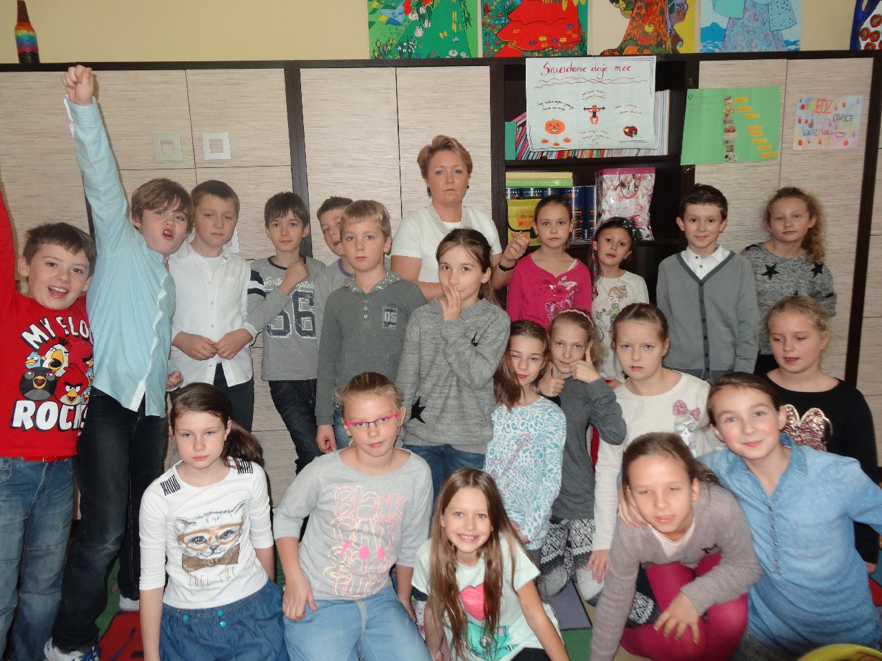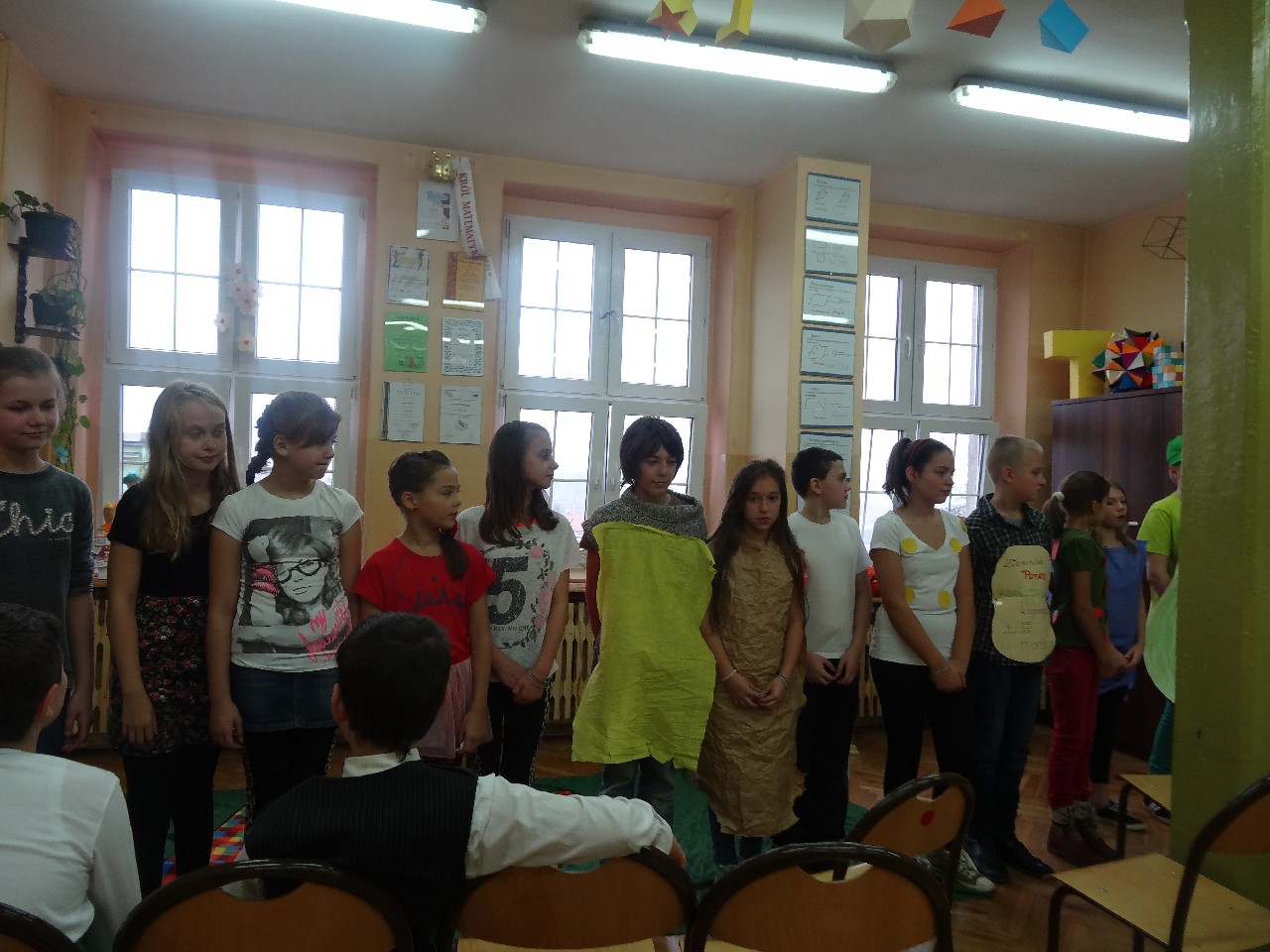 Podzieleni na grupy przyrządziliśmy pełnoziarnisty chleb z warzywami takimi jak: pomidory, sałata, rzodkiewki oraz szczypiorek. Dodaliśmy również jajka, twarożek, ser, a także wędlinę. Najważniejsze, żeby było zdrowo! Uczennice: Weronika Dziamara i Agata Drabina przeczytały fraszkę Jana Kochanowskiego pt. Na zdrowie. Po 45 minutach przystroiliśmy stoły i udaliśmy się zobaczyć jakimi posiłkami zaskoczą nas inne klasy. Nie zawiedliśmy się, tam również było apetycznie. Po dzwonku wróciliśmy do swoich stolików i oczekiwaliśmy na komisję. Po jej wizycie skonsumowaliśmy kromki. Później rozwiązaliśmy krzyżówki, wykreślanki i zapisaliśmy przepisy na sałatki. Nasza sala wyglądała pięknie. Kolorowe obrusy, papierowe talerzyki, serwetki, aż cieszyły oczy. Następnie poszliśmy częstować innych uczniów, a przewodnicząca klasy wraz z członkinią Samorządu Uczniowskiego rozdały nauczycielom jabłka. Po jakimś czasie z żalem serca musieliśmy schować kanapki, sprzątnąć stoły i klasę oraz udać się na kolejną lekcję. Wszystkim nam się podobało, a posiłek bardzo smakował. Będziemy czekać na taką akcję za rok. Jest to wspaniały pomysł zachęcać uczniów, zarówno małych jak i dużych do zdrowego stylu życia.