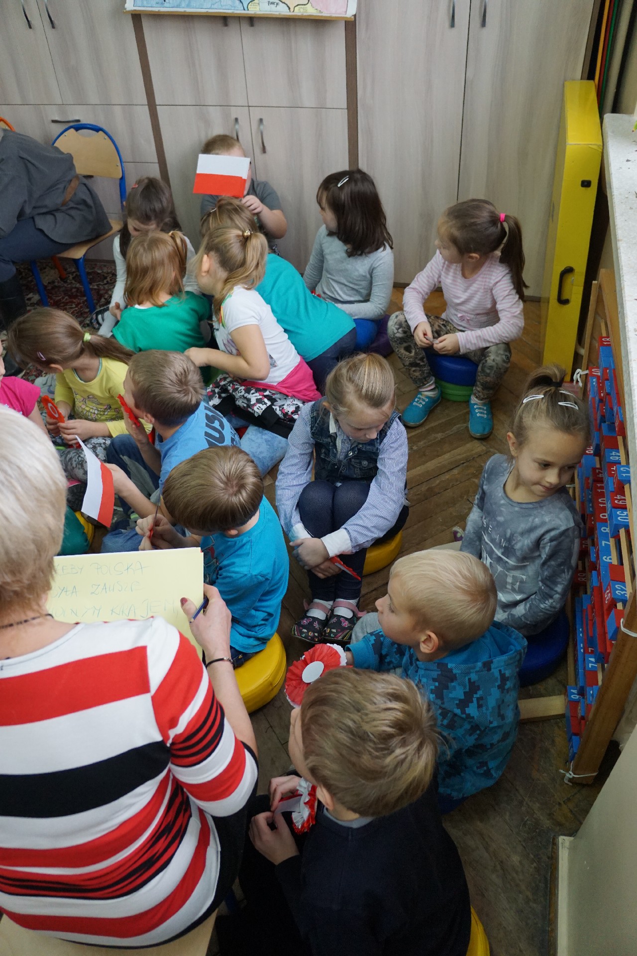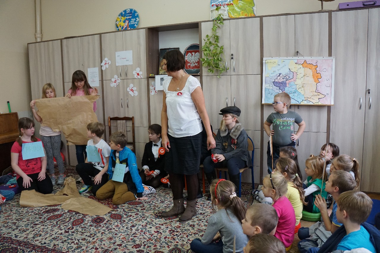Dnia 12 listopada 2014 roku klasa 4d i 5e razem z panią Bożeną Mielczarek odwiedziły pierwszaków z klasy 1e, których opiekunem jest pani Elżbieta Frasunkiewicz. Celem spotkania było zapoznanie pierwszoklasistów ze znaczeniem Narodowego Święta Niepodległości, które obchodzimy 11 listopada. W wspólnych zajęciach uczestniczyły również pani wicedyrektor Krystyna Morek, pani Elżbieta Nowak i rodzice.