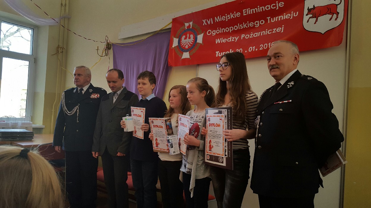 W dniu 30 stycznia 2016r. w siedzibie OSP w Turku odbyły się XVI miejskie eliminacje Ogólnopolskiego Turnieju Wiedzy Pożarniczej „Młodzież zapobiega pożarom”. Szkołę Podstawową Nr 1 reprezentował Wojciech Werbiński z klasy 6e, którego opiekunem jest pani Irena Dominiak. Uzyskał on najlepszy wynik w mieście w kategorii szkół podstawowych i tym samym zakwalifikował się do etapu powiatowego. Jest to turniej w którym należy wykazać się znajomością specjalistycznej wiedzy o pożarnictwie, dlatego tylko prawdziwi pasjonaci zajmują najwyżasze lokaty. Tym bardziej gratulujemy naszemu uczniowi i życzymy sukcesu w kolejnych etapach.