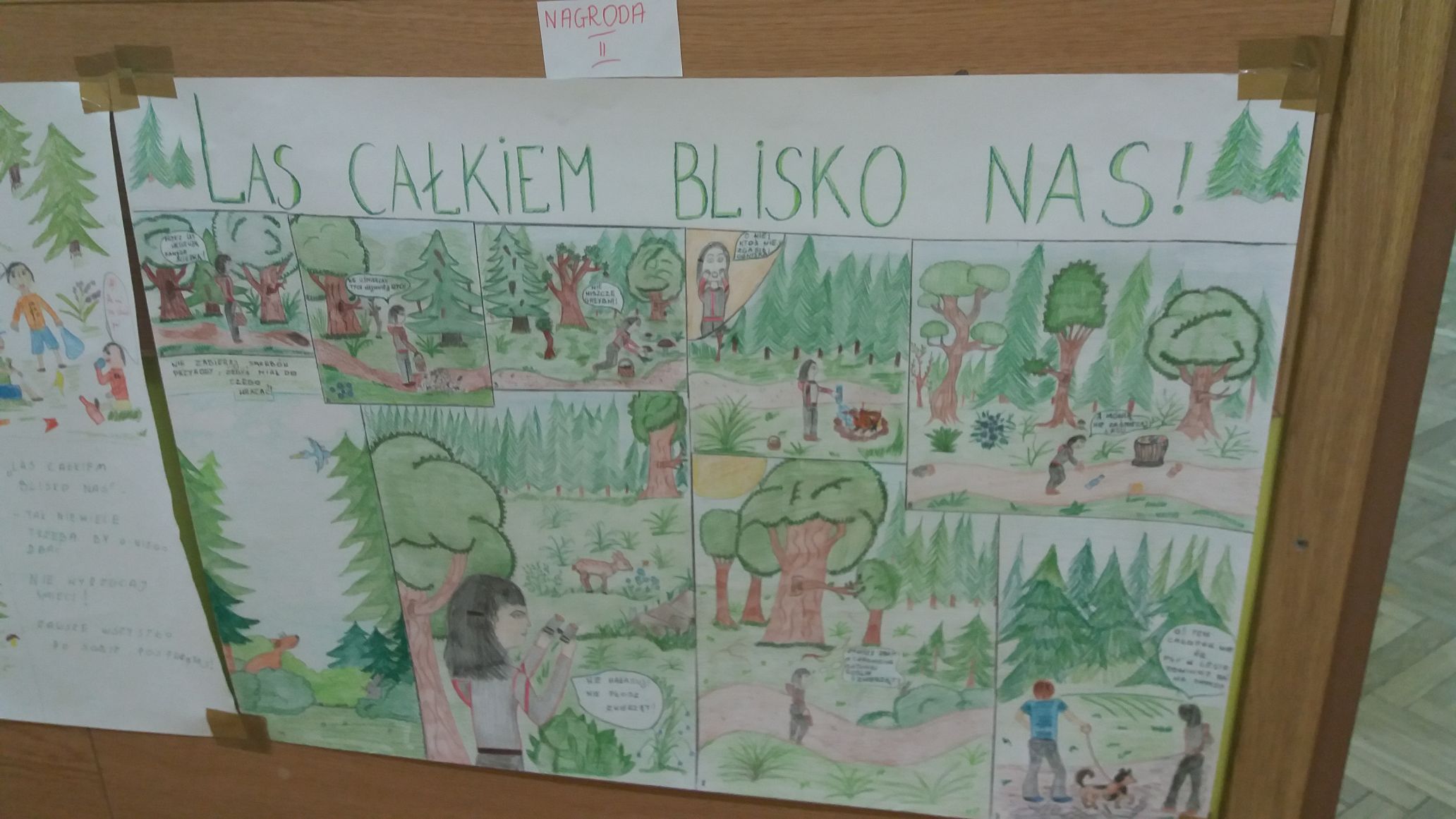 22 kwietnia co roku obchodzimy Międzynarodowy Dzień Ziemi z tej okazji klasy 4-6 wzięły udział w szkolnym konkursie „Las całkiem blisko nas”. Celem konkursu było promowanie postaw ekologicznych wśród uczniów i rodziców oraz zachęcenie do spędzania wolnego czasu w gronie rodziny na świeżym powietrzu i w lesie. Każdy uczestnik konkursu miał do wykonania komiks. Prace były bardzo piękne, wymagające dużego nakładu czasu i poświęcenia. W konkursie wygrali: I miejsce Mateusz Szczesiak z kl. 4a, II miejsce Aleksandra Smolińska z kl.4 a, III miejsce ex aequo zajęli Radosław Kałużny z kl. 6b i Mateusz Bergandy z kl.4a . Wszystkim uczniom serdecznie gratulujemy.