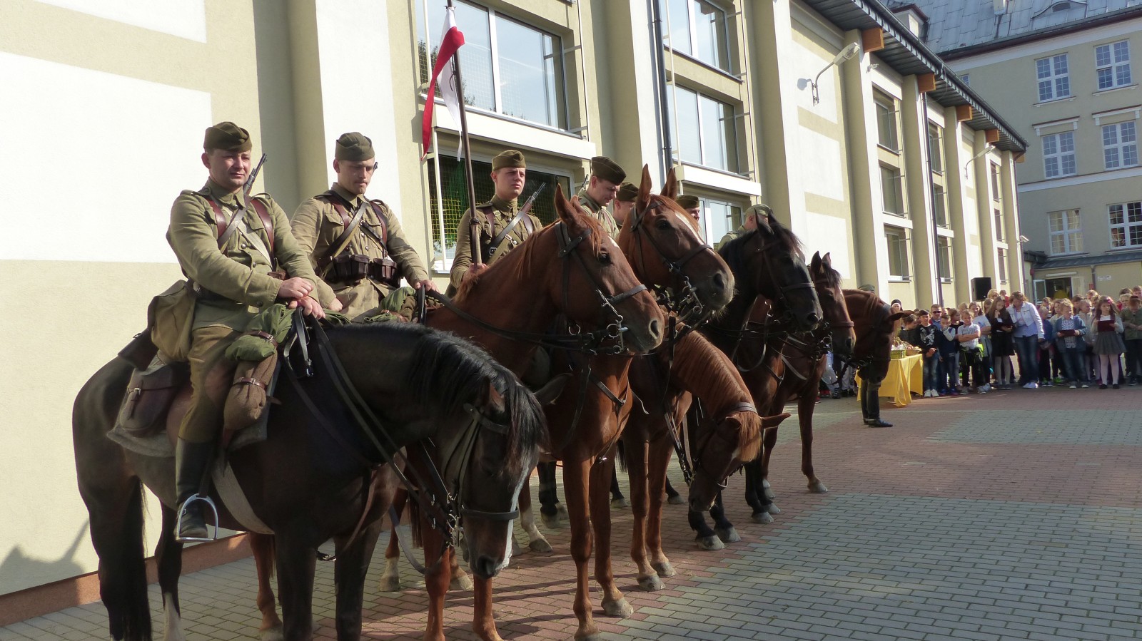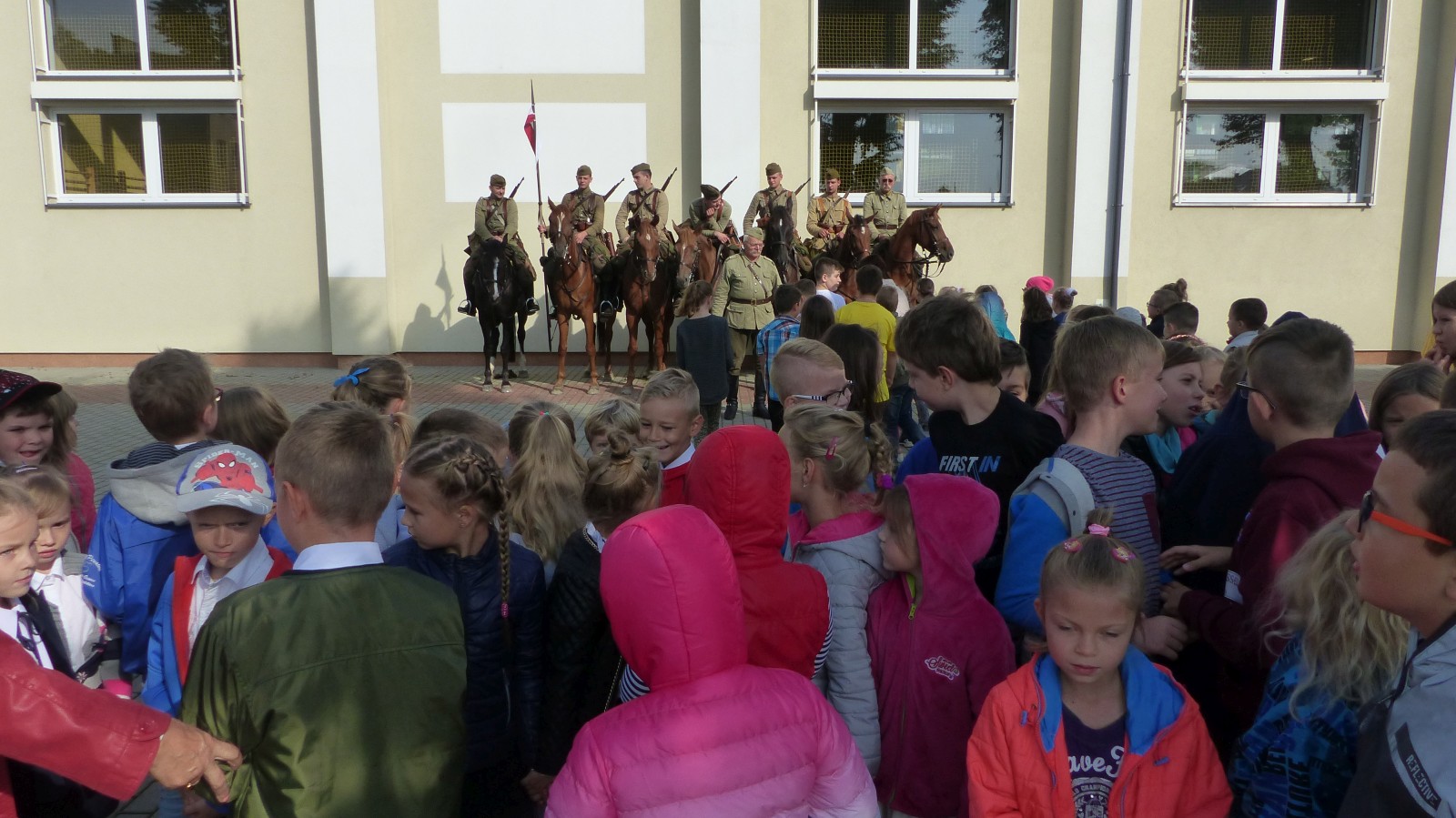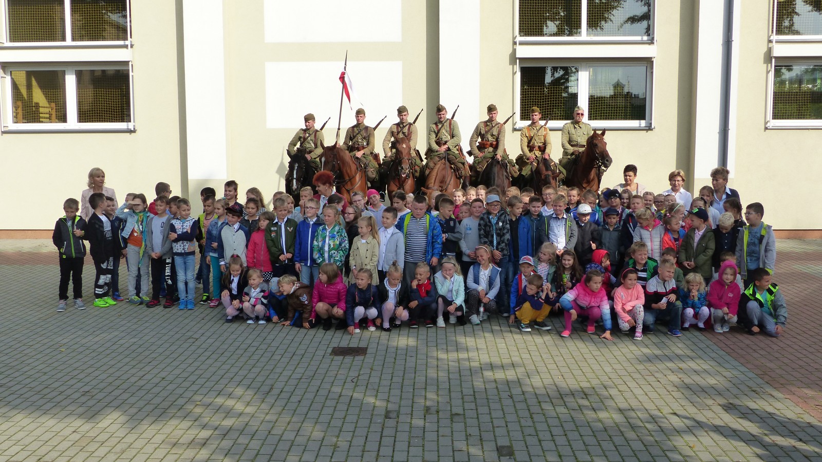 Na szkolnym boisku zgromadzili się uczniowie i nauczyciele, by spotkać się ze swoimi niecodziennymi gośćmi. Spotkanie prowadzili uczniowie klasy 4d Maja Walas i Bartosz Dziamara. Wszystkim spodobały się występy muzyczne klasy 4d oraz Basi Malety i Julii Ziemiańskiej, które zaśpiewały ułańskie pieśni.