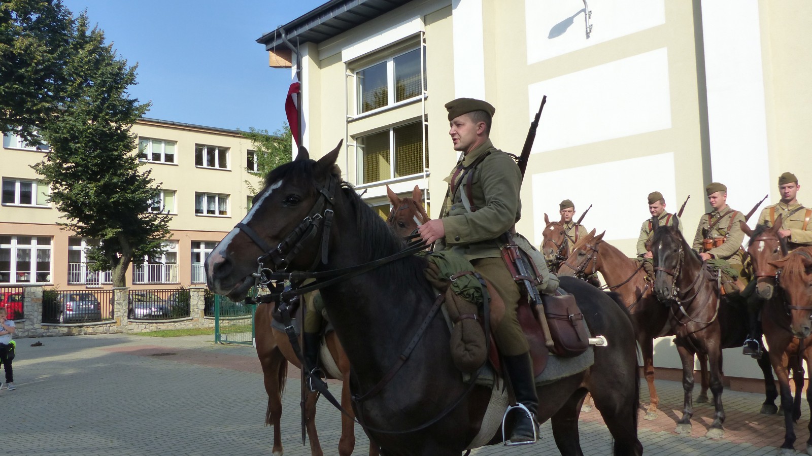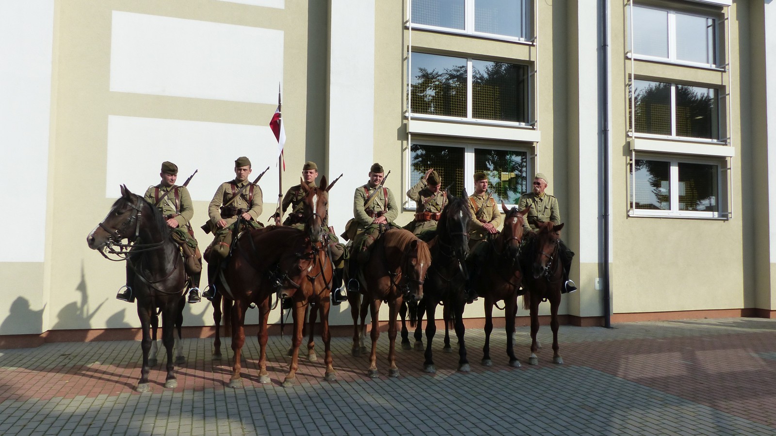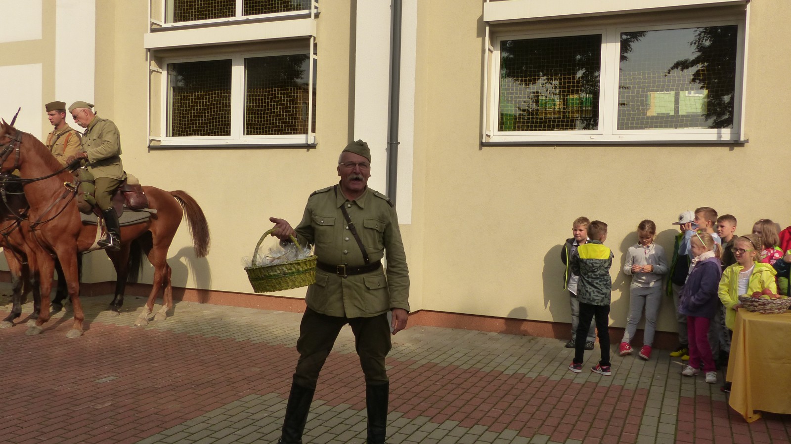 Na szkolnym boisku zgromadzili się uczniowie i nauczyciele, by spotkać się ze swoimi niecodziennymi gośćmi. Spotkanie prowadzili uczniowie klasy 4d Maja Walas i Bartosz Dziamara. Wszystkim spodobały się występy muzyczne klasy 4d oraz Basi Malety i Julii Ziemiańskiej, które zaśpiewały ułańskie pieśni.