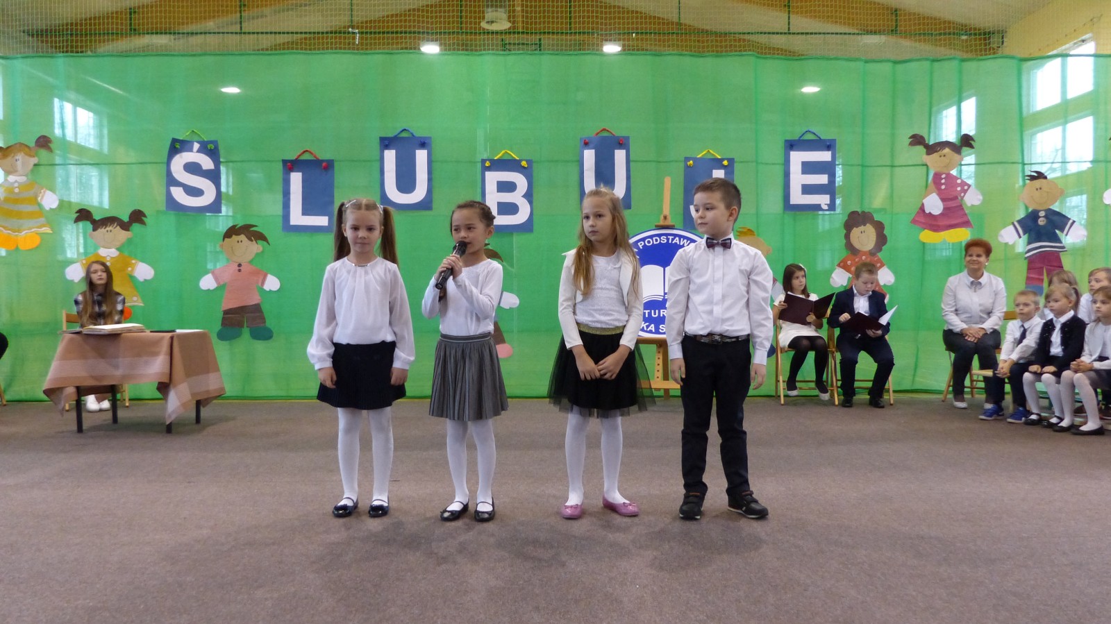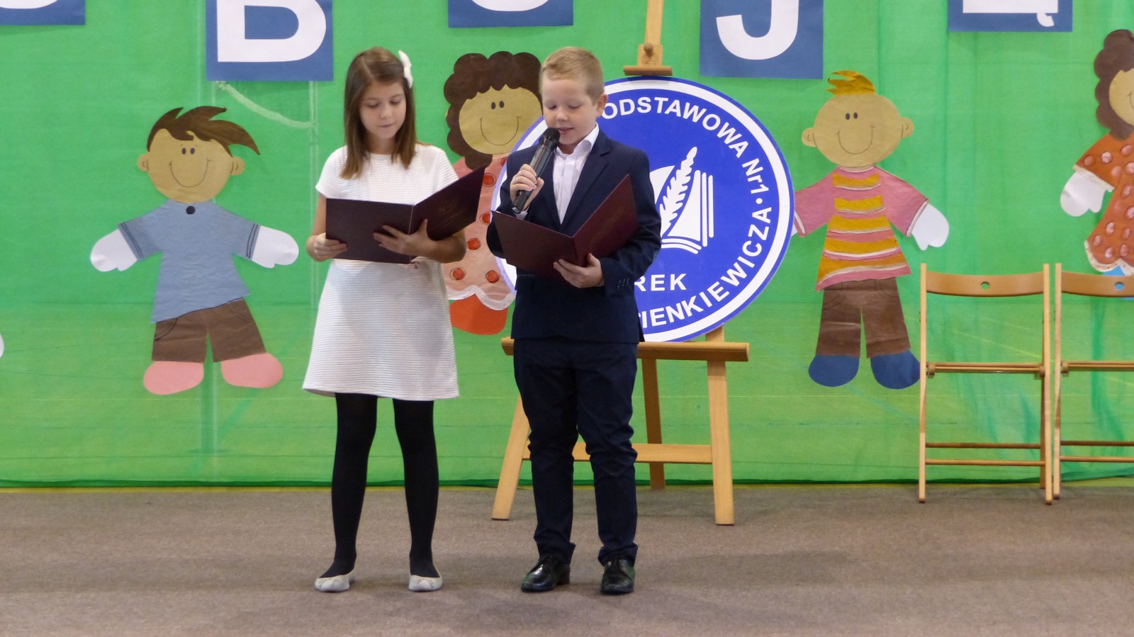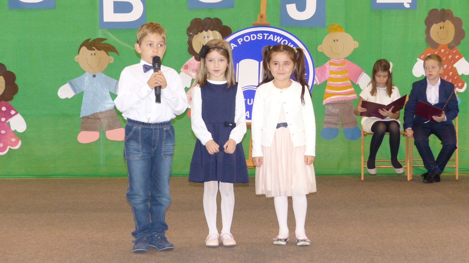 Oprócz części oficjalnej i poważnej była też część rozrywkowa. Dzieci śpiewały piosenki i recytowały wiersze. Uczniowie z klasy drugiej serdecznie powitały młodszych kolegów w szkole. Pod koniec uroczystości dla wszystkich zgromadzonych zaśpiewała uczennica piątej klasy Paula Biskup. Wszyscy mogli podziwiać jej talent rozwijany w naszej szkole i nagradzany wielokrotnie na różnych krajowych i międzynarodowych festiwalach.