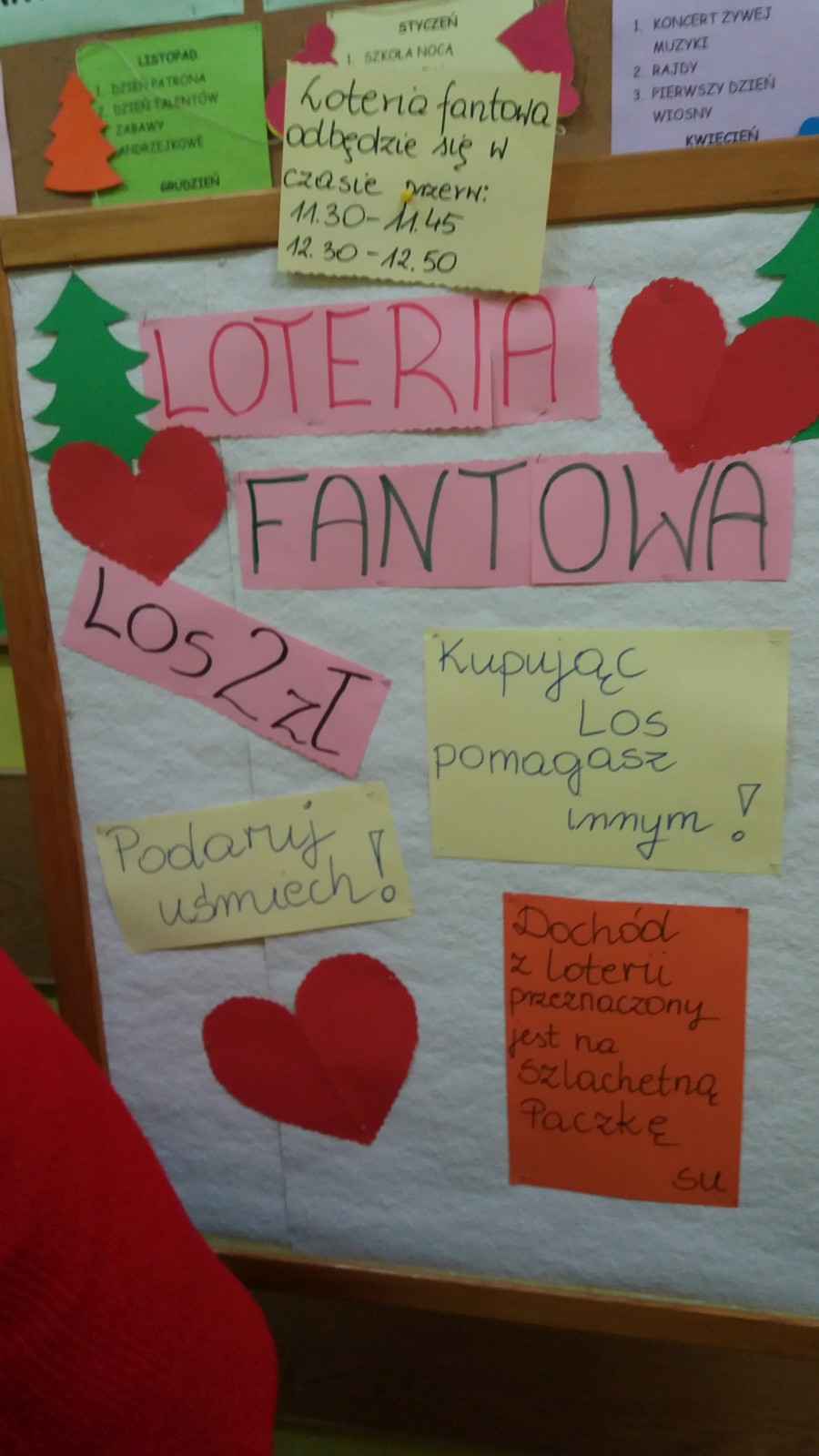 5 grudnia 2017r. w Szkole Podstawowej nr 1 odbyła się „Loteria Fantowa” zorganizowana przez Samorząd Uczniowski pod opieką p. K. Błajet i p. B. Mielczarek. Wszystkie losy rozeszły się błyskawicznie. Duże zainteresowanie zainspirowało nas do chęci zorganizowania kolejnej loterii. Dochód z loterii przeznaczono na „Szlachetną Paczkę”. Dziękujemy wszystkim uczniom i nauczycielom za przynoszenie atrakcyjnych fantów.