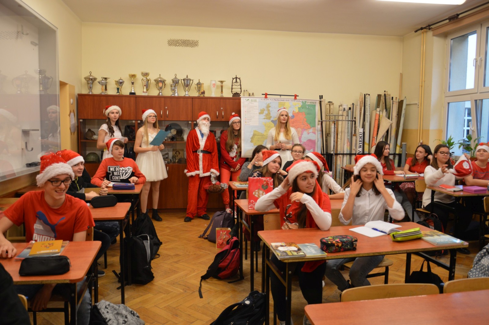 Nie trzeba pytać, na kogo grzeczne dzieci czekają 6 grudnia, bo wszyscy doskonale wiedzą, że na św. Mikołaja. W tym dniu nasza szkoła przeżyła prawdziwą inwazję Mikołajów. Można było ich spotkać dosłownie wszędzie. Okazało się, iż grzecznych dzieci w naszej szkole nie brakuje, bowiem do każdej klasy zawitał Mikołaj wraz ze Śnieżynkami. Zadawał uczniom pytania i za każdą dobrą odpowiedź nagradzał ich cukierkami. Dodatkowo, całą tę radosną atmosferę urozmaiciły ,,muzyczne przerwy” utrzymane w konwencji bożonarodzeniowej. Na koniec wszystkim Mikołajom zrobiono pamiątkowe zdjęcie przy pachnącej choince.
