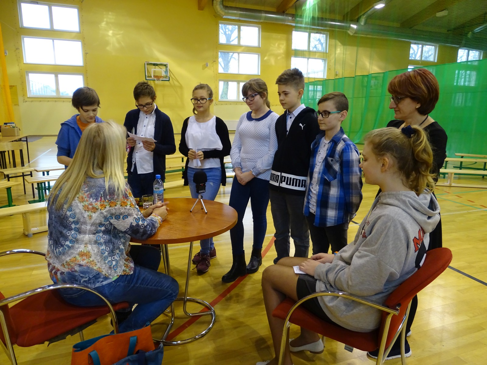Na koniec nie mogło zabraknąć wspólnych zdjęć z gościem. Natomiast zespół redakcyjny szkolnej gazety „Kleks” przeprowadził wywiad z pisarką, wykorzystując profesjonalny sprzęt do rejestrowania dźwięków, zakupiony w ramach projektu „Bezpieczna+”.