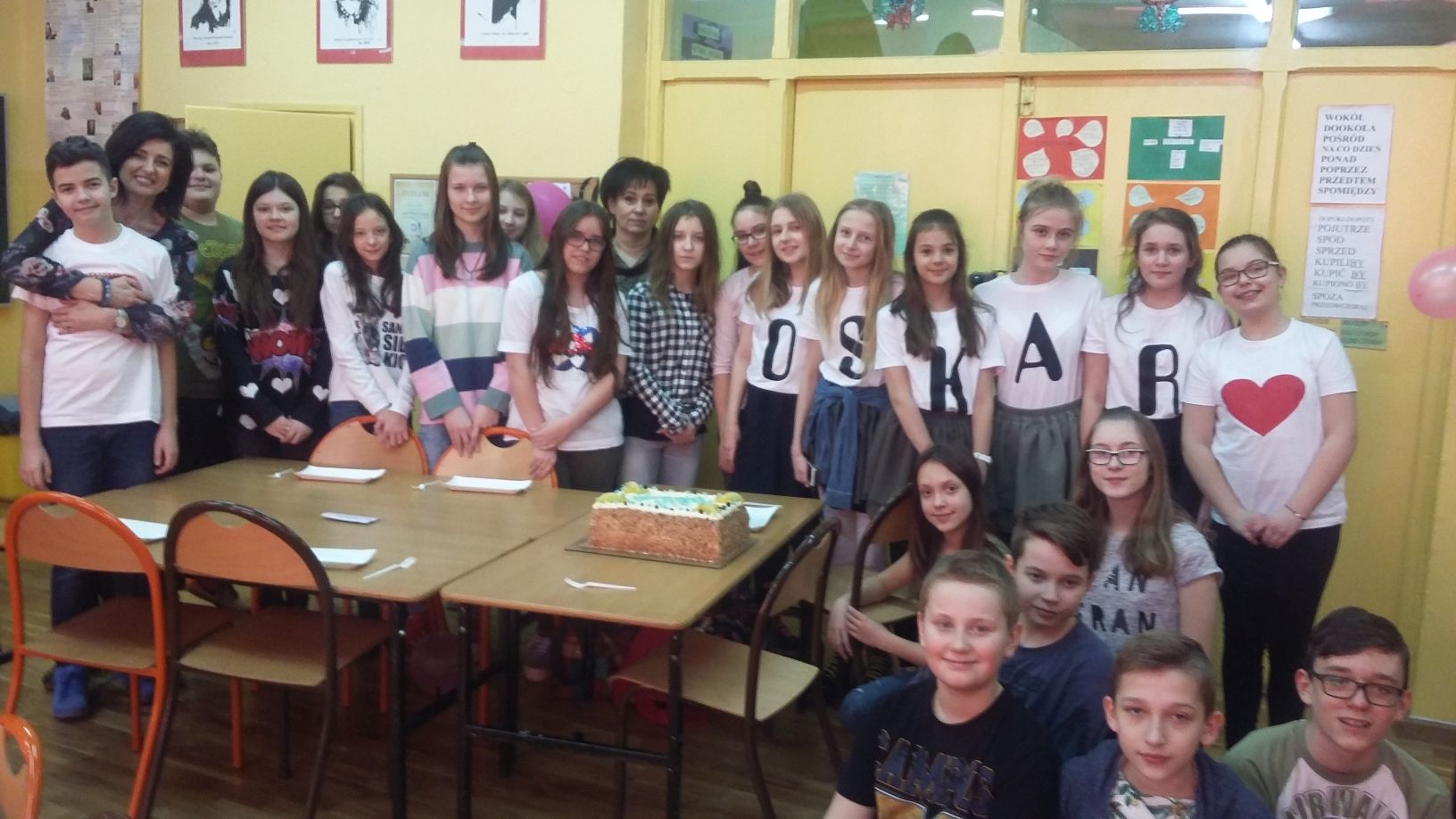 Na zakończenie przygody Oskara w kultowym programie telewizyjnym Mali Giganci jego mama podziękowała wszystkim za wsparcie i poczęstowała naszą klasę pysznym tortem.