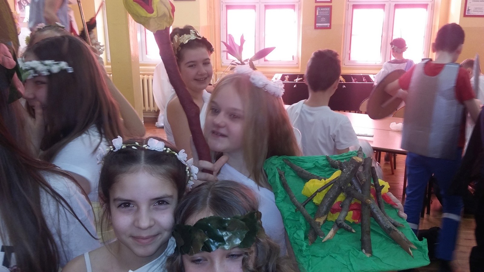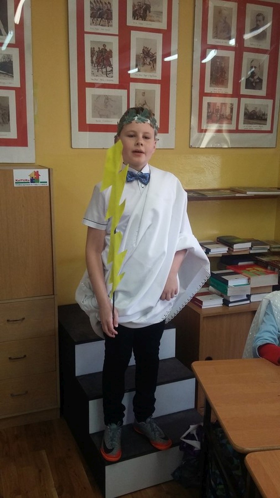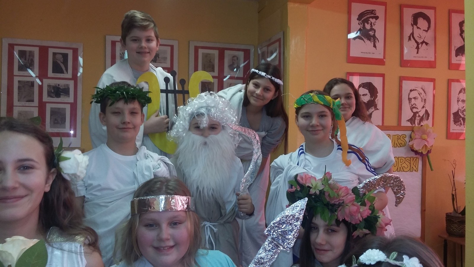 W środę, 21 marca pracownia polonistyczna zamieniła się w siedzibę bogów greckich – Olimp. Uczniowie klasy 5c i 5d wcielili się w postaci z mitologii. Zadaniem było przygotowanie własnoręcznie wykonanego stroju, atrybutu i tekstu na temat wylosowanego boga, najlepiej wygłoszonego z pamięci. Do projektu wszyscy podeszli profesjonalnie. Uczniowie występowali przed swoją klasą, próbowali opanować tremę, uczyli się współpracować w grupie, a wszystko w miłej i serdecznej atmosferze. Przez całą przerwę zakładali stroje: materiały, koce, prześcieradła, a nawet obrusy! Niektóre były wyjątkowe, np. własnoręcznie malowane, barwne i zabawne. Przewiązywali się wstążkami, pomagali sobie, ćwiczyli kwestie. Każdy chciał przedstawić swoją postać jak najlepiej i najciekawiej, aby wszyscy słuchali zdziwieni i zaskoczeni informacjami. Na zakończenie wykonano grupową fotografię.