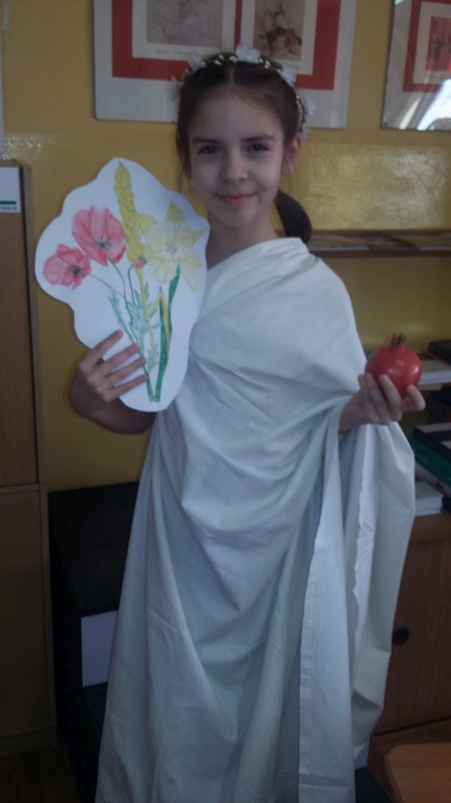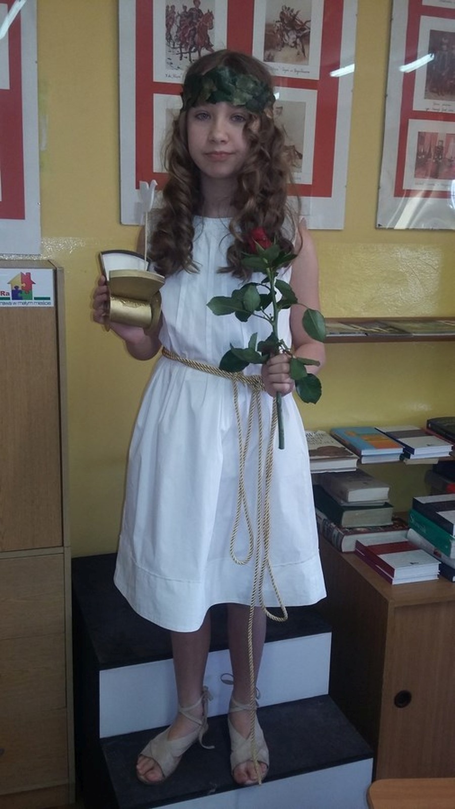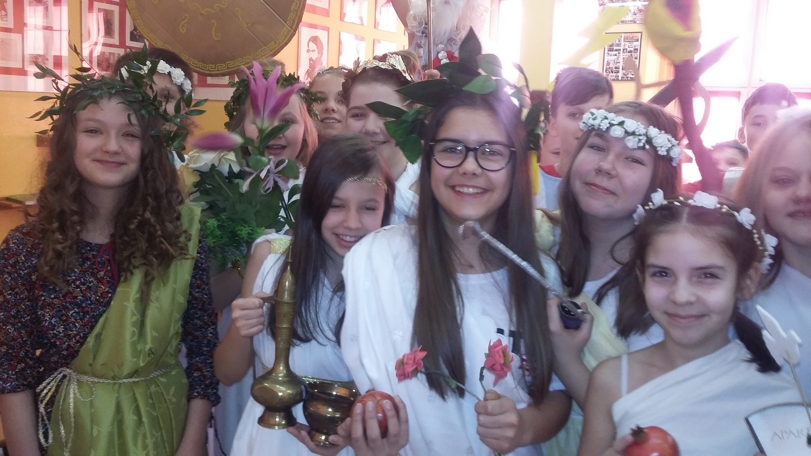 W środę, 21 marca pracownia polonistyczna zamieniła się w siedzibę bogów greckich – Olimp. Uczniowie klasy 5c i 5d wcielili się w postaci z mitologii. Zadaniem było przygotowanie własnoręcznie wykonanego stroju, atrybutu i tekstu na temat wylosowanego boga, najlepiej wygłoszonego z pamięci. Do projektu wszyscy podeszli profesjonalnie. Uczniowie występowali przed swoją klasą, próbowali opanować tremę, uczyli się współpracować w grupie, a wszystko w miłej i serdecznej atmosferze. Przez całą przerwę zakładali stroje: materiały, koce, prześcieradła, a nawet obrusy! Niektóre były wyjątkowe, np. własnoręcznie malowane, barwne i zabawne. Przewiązywali się wstążkami, pomagali sobie, ćwiczyli kwestie. Każdy chciał przedstawić swoją postać jak najlepiej i najciekawiej, aby wszyscy słuchali zdziwieni i zaskoczeni informacjami. Na zakończenie wykonano grupową fotografię.