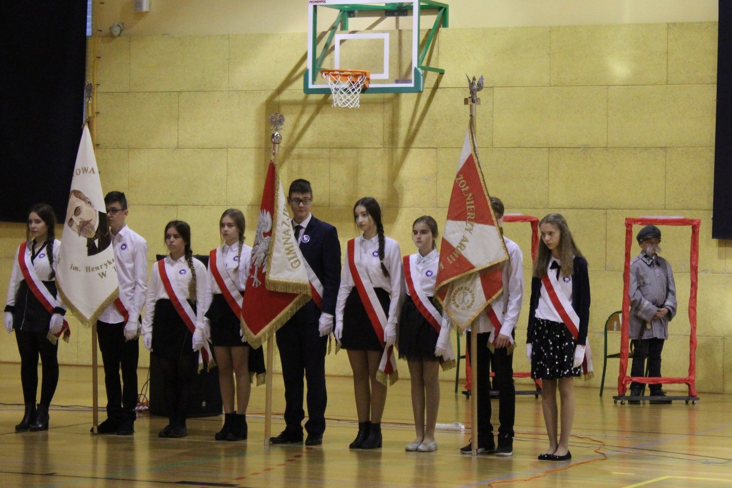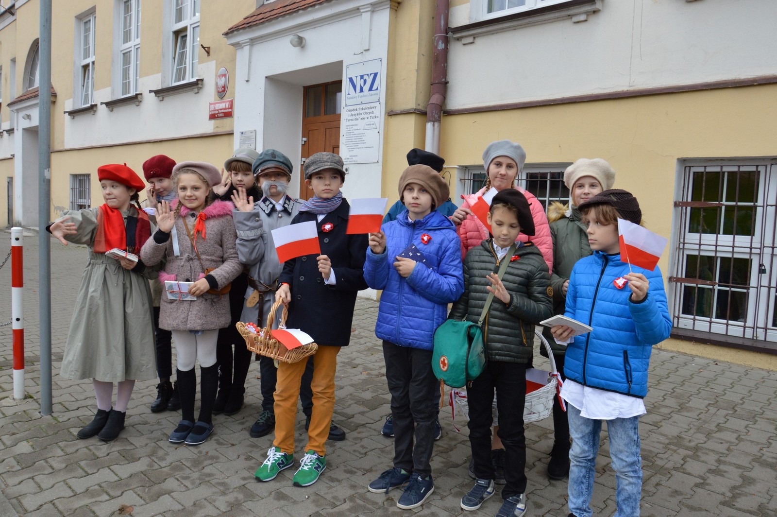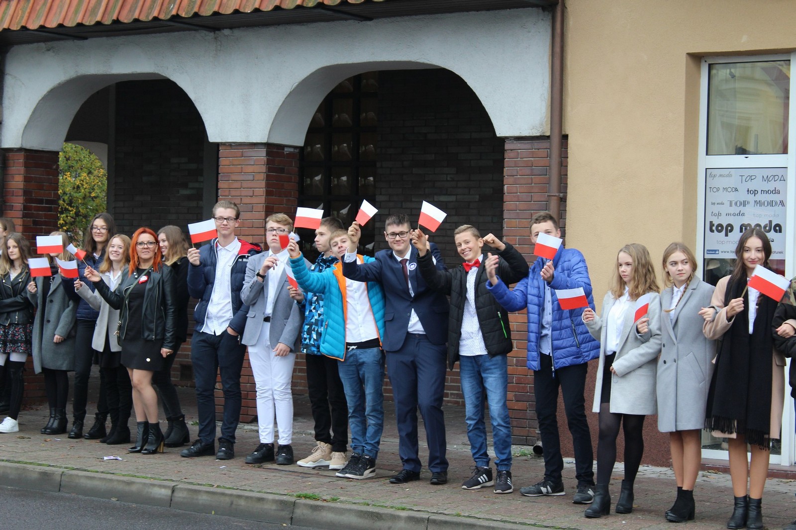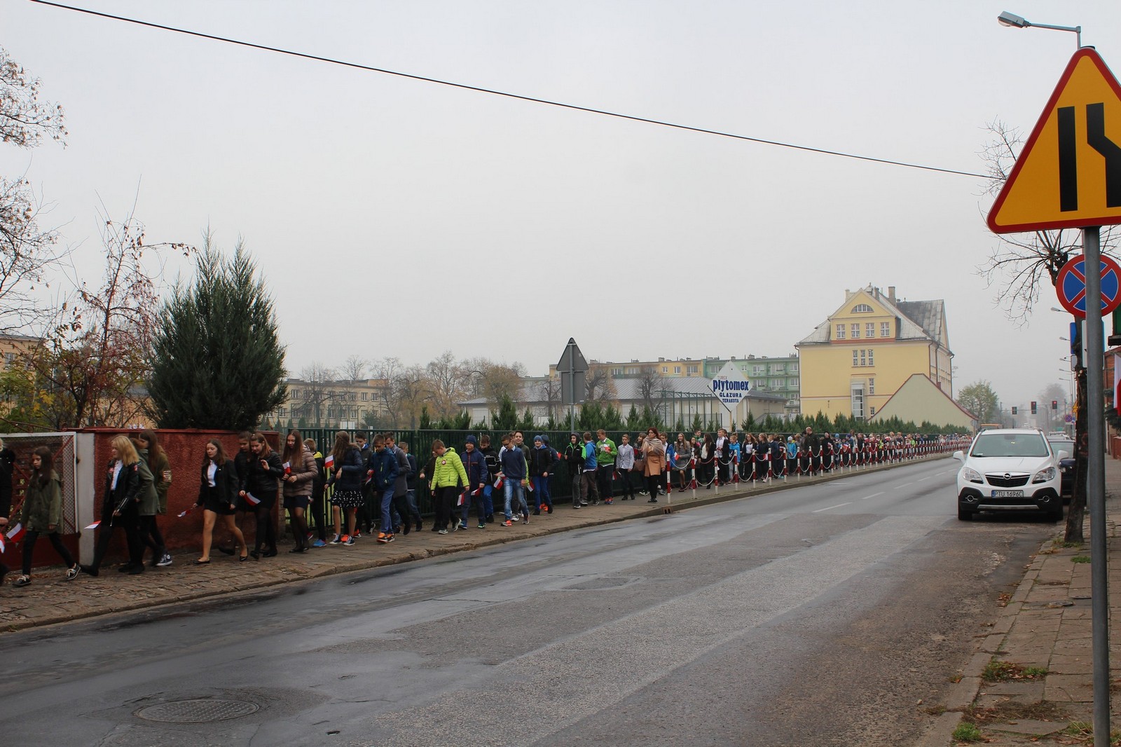 O godz.11.11 –wszyscy uczniowie i nauczyciele włączyli się do ogólnopolskiej akcji i uroczyście odśpiewali hymn państwowy przed budynkami szkoły. Po zakończeniu hymnu państwowego uczniowie klas I – VIII oraz oddziały gimnazjalne utworzy Łańcuch Niepodległości, wzdłuż ulic naszego miasta, łączących oba budynki szkoły, od ul. 3 Maja do ul. Parkowej. Do Łańcucha przyłączyli się przechodnie, zachęcani do udziału w tej akcji z balkonu miejskiego Ratusza. Byli to uczniowie: Hubert Majka, Jakob Loba, Weronika Karolak, Michalina Stasiak.