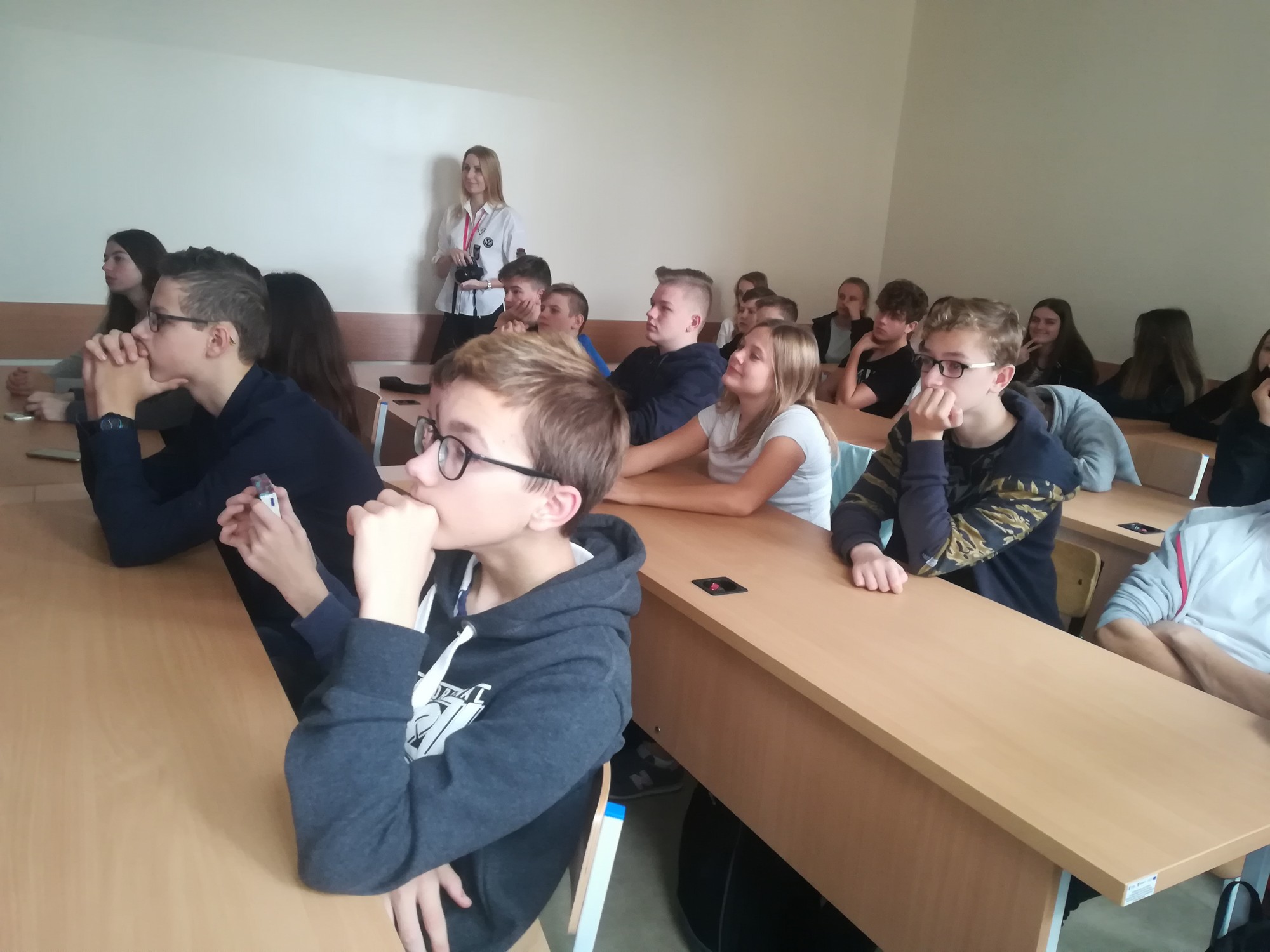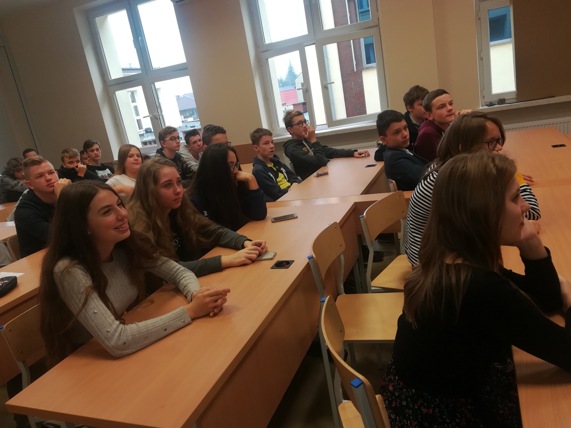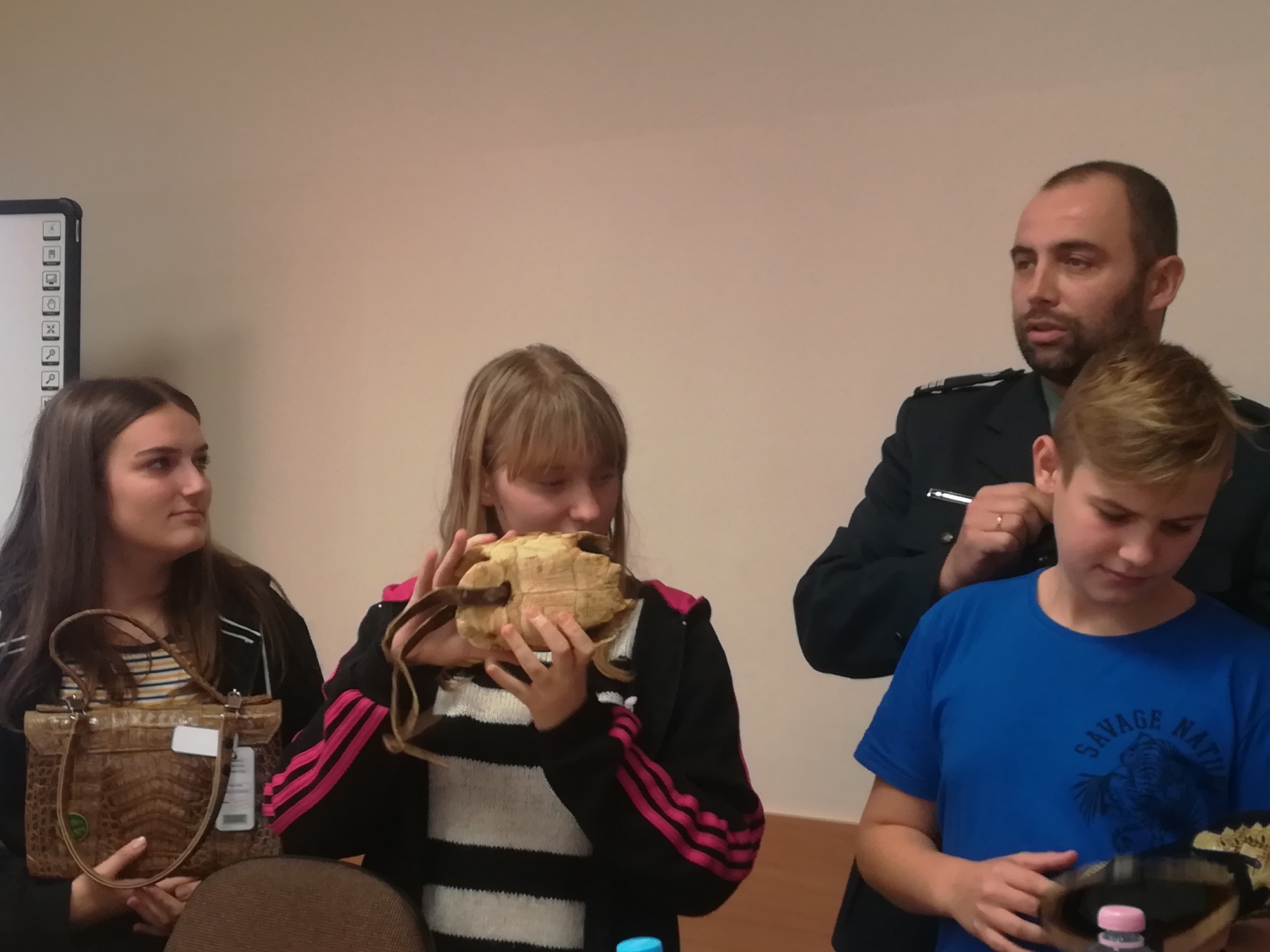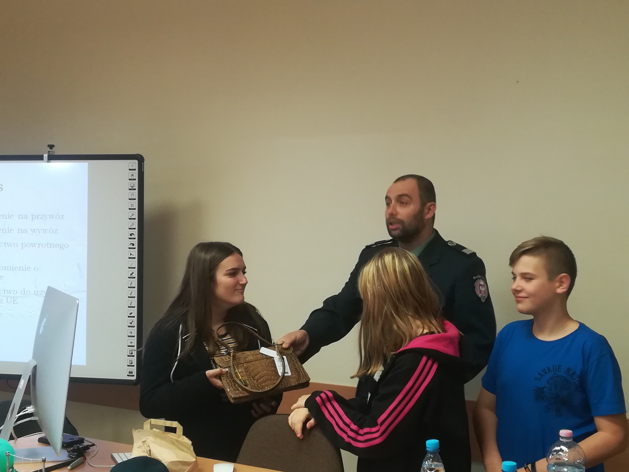 Dnia 13.11.2018 r. uczniowie klasy 8 c i 8b mieli możliwość poznania specyfiki zawodu celnika, bowiem do naszej szkoły zawitali przedstawiciele służby celnej z Kalisza. Panowie przedstawili młodzieży zasady swojej pracy oraz namiastkę obowiązujących przepisów celnych. Na spotkaniu pokazali przedmioty, które zostały zarekwirowane podróżnym podczas kontroli na lotnisku. Były to m.in.: torebka ze skóry krokodyla, skórzane buty, grzechotka ze skorupy żółwia, skóra węża, butelka z kobrą i skorpionem w środku. Tym faktem uświadomili młodzieży, że nie wszystko co można traktować jako pamiątkę z wakacji, jest legalne a posiadanie takich przedmiotów podlega karze.