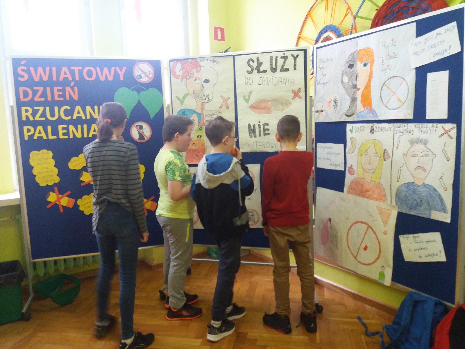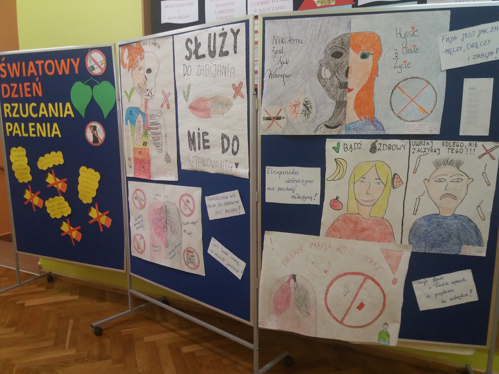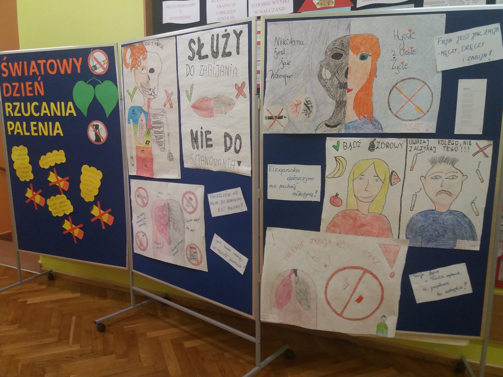 W dniach od 15 do 22 listopada obchodziliśmy „Światowy Dzień Rzucania Palenia”. W każdej klasie od I do VIII SP i III GIM odbyły się lekcje o tematyce „Papierosy są niemodne i niezdrowe – skutki palenia tytoniu”. W klasach IV pani pielęgniarka opowiedziała o szkodliwości palenia tytoniu oraz o innych uzależnieniach. W klasach VII-VIII i III Gim przeprowadzono diagnozę uczniów w zakresie używania środków psychoaktywnych, w tym papierosów i e-papierosów oraz prelekcja pracowników Ośrodka Wsparcia dla Osób z Problemami Uzależnień w Turku na temat „Szkodliwości palenia tytoniu i e-papierosów”. Na korytarzach w budynku A i B pojawiły się wspaniałe gazetki oraz wystawa plakatów klas szóstych propagujące szkodliwość palenia papierosów. Podczas wywiadówek rodzice otrzymali informacje o przeprowadzonej akcji, natomiast w klasach VI i VII zaproszono rodziców na spotkanie z funkcjonariuszem policji z Komendy Powiatowej Policji w Turku na której rozmawiano o rozpoznawaniu zagrożeń w środowisku młodzieży.