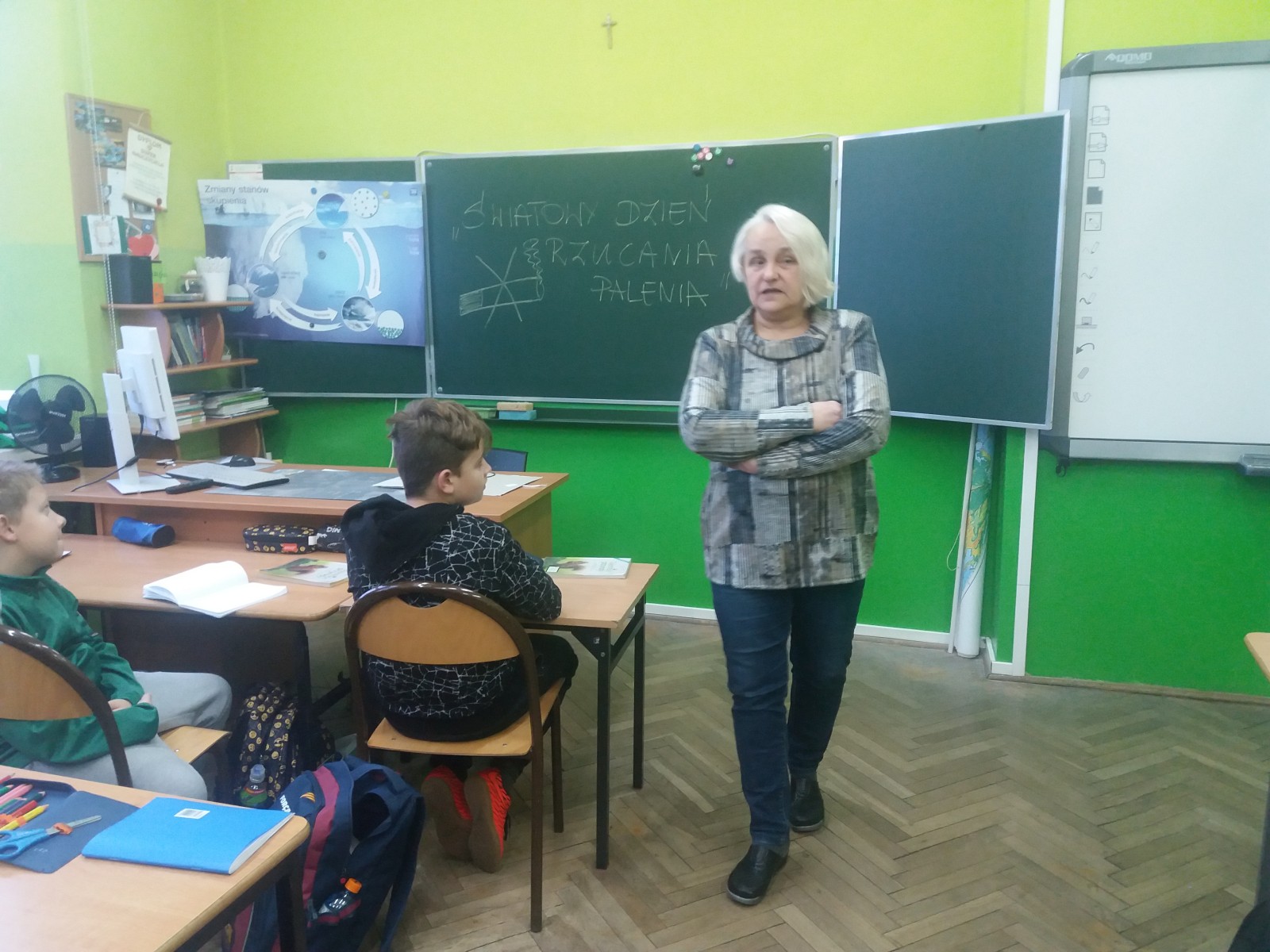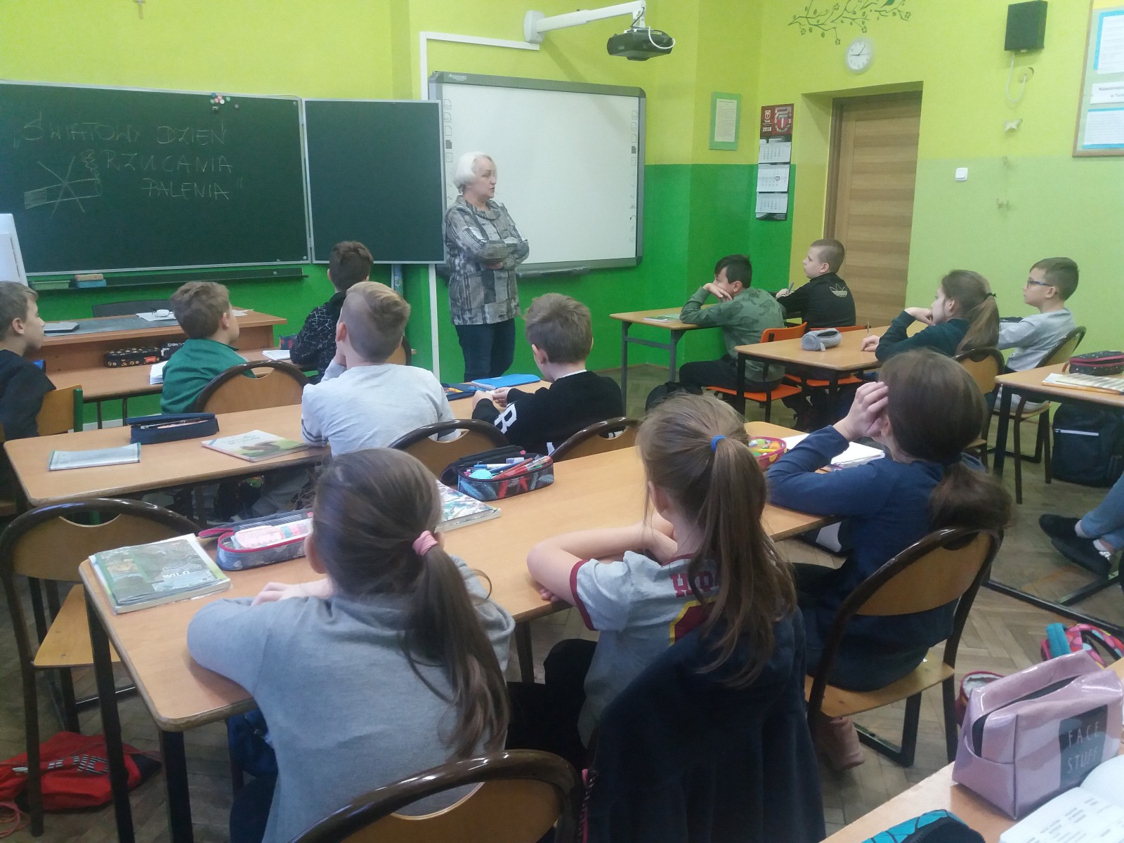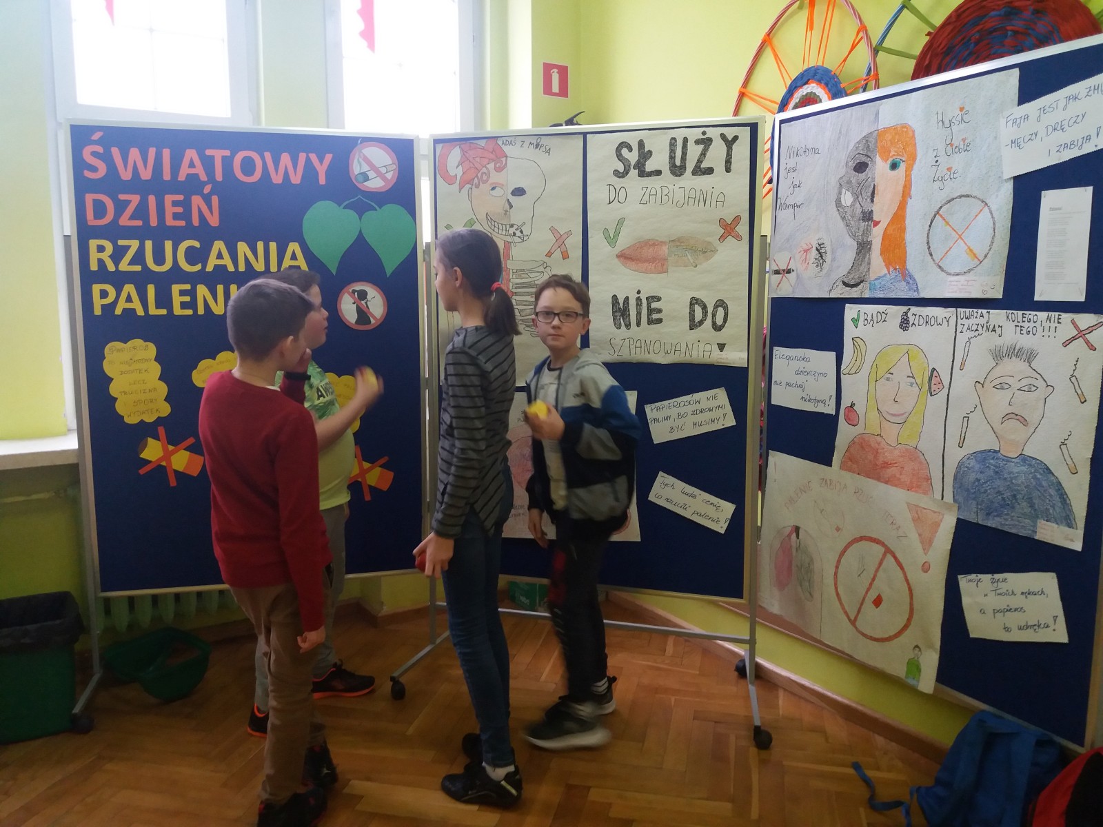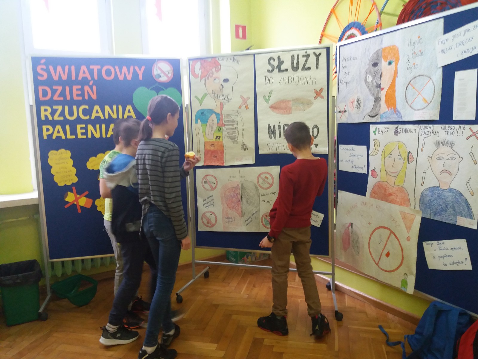 W dniach od 15 do 22 listopada obchodziliśmy „Światowy Dzień Rzucania Palenia”. W każdej klasie od I do VIII SP i III GIM odbyły się lekcje o tematyce „Papierosy są niemodne i niezdrowe – skutki palenia tytoniu”. W klasach IV pani pielęgniarka opowiedziała o szkodliwości palenia tytoniu oraz o innych uzależnieniach. W klasach VII-VIII i III Gim przeprowadzono diagnozę uczniów w zakresie używania środków psychoaktywnych, w tym papierosów i e-papierosów oraz prelekcja pracowników Ośrodka Wsparcia dla Osób z Problemami Uzależnień w Turku na temat „Szkodliwości palenia tytoniu i e-papierosów”. Na korytarzach w budynku A i B pojawiły się wspaniałe gazetki oraz wystawa plakatów klas szóstych propagujące szkodliwość palenia papierosów. Podczas wywiadówek rodzice otrzymali informacje o przeprowadzonej akcji, natomiast w klasach VI i VII zaproszono rodziców na spotkanie z funkcjonariuszem policji z Komendy Powiatowej Policji w Turku na której rozmawiano o rozpoznawaniu zagrożeń w środowisku młodzieży.