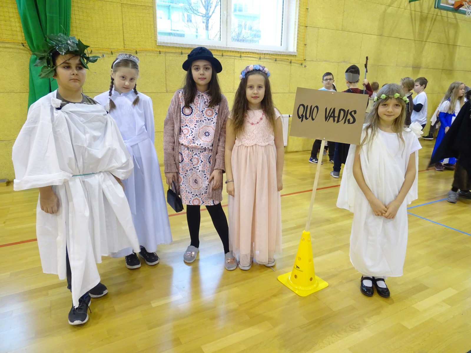 Teatr „Szpilka” i klasa 6c pokazali przedstawienie „Przybywajcie na wezwanie … z bohaterami Sienkiewicza na spotkanie”. Kiedy pojawiła się Paula Biskup, mocno i podniośle zabrzmiał w jej wykonaniu hymn „Quo Vadis Domine” oznaczało to, że uroczystość Dnia Patrona w „Jedynce” właśnie się rozpoczęła..