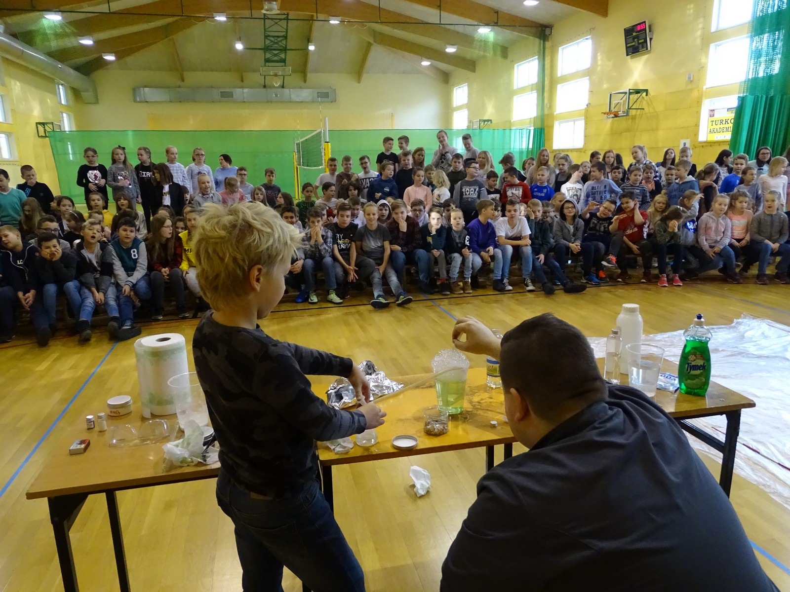 5 lutego 2019 roku w Szkole Podstawowej nr 1 w Turku uczniowie klas II-V wzięli udział w żywej lekcji chemii. Lekcję przeprowadził absolwent naszej szkoły Piotr Dzwoniarek. Pan Piotr już po raz kolejny odwiedził nas, aby w niecodzienny sposób wprowadzić uczniów w tajniki chemii. Warto nadmienić, że nasz gość był pracownikiem Centrum Nauki Kopernik w Warszawie.