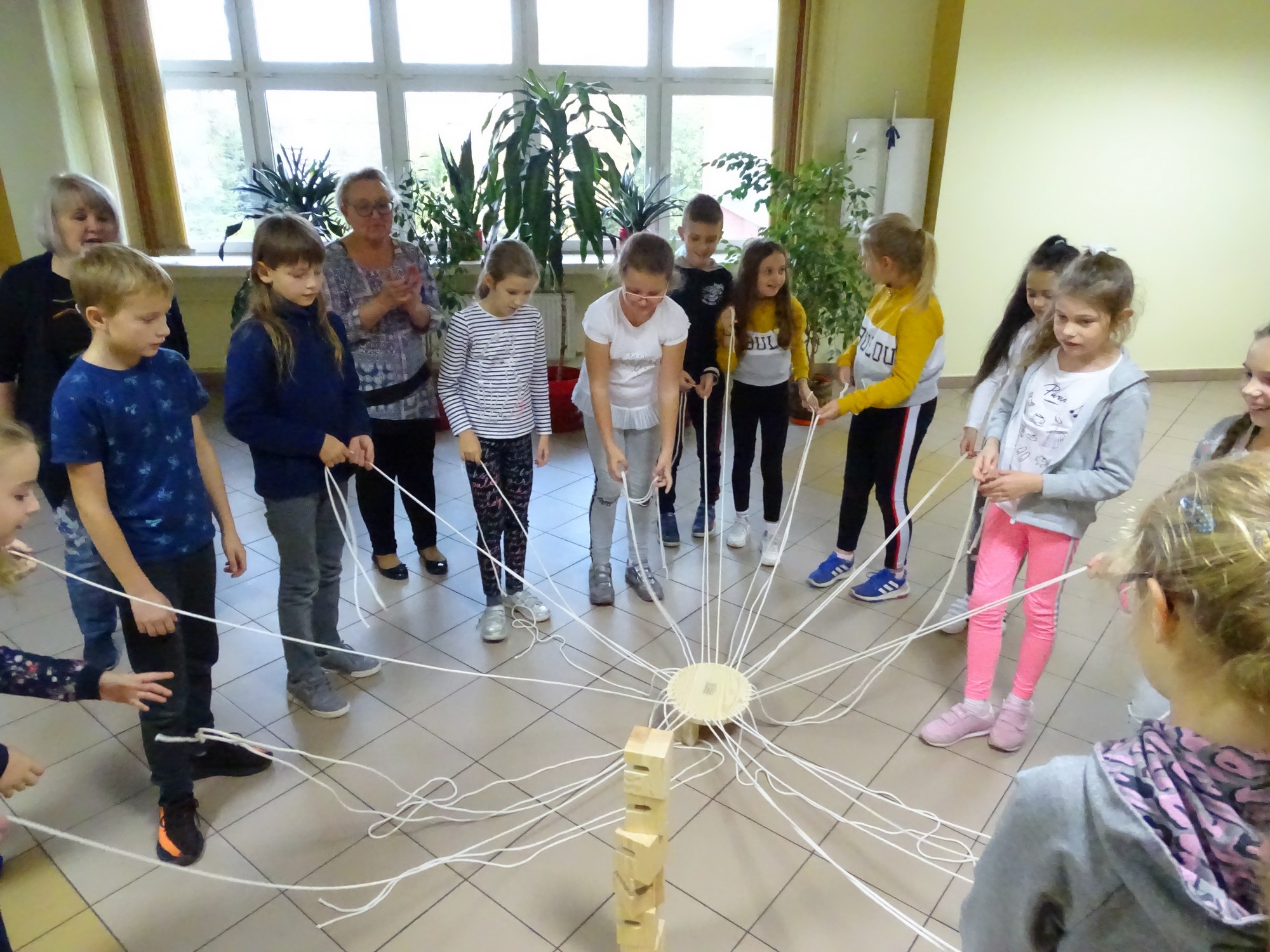 Dla uczestników organizatorki przygotowały wiele gier. Na początek był „łamacz lodów”, dzięki któremu wszyscy mogli poznać się bliżej, opowiadając o swoich zainteresowaniach i upodobaniach. Później przyszła kolej na „Koło współpracy”. Ta zabawa, której celem było zbudowanie wieży z drewnianych klocków okazała się bardzo trudna, ale dzieciom udało się osiągnąć sukces. Po tej wyczerpującej zabawie przyszła kolej na „Color brain”, czyli myślenie kolorami. Ta grupowa gra wywołała wiele emocji wśród uczestników, którzy zmęczeni zarówno fizycznie jak i psychicznie z radością przyjęli wiadomość, że przyszedł czas na kolację. Wszyscy z apetytem spałaszowali pyszną pizzę.