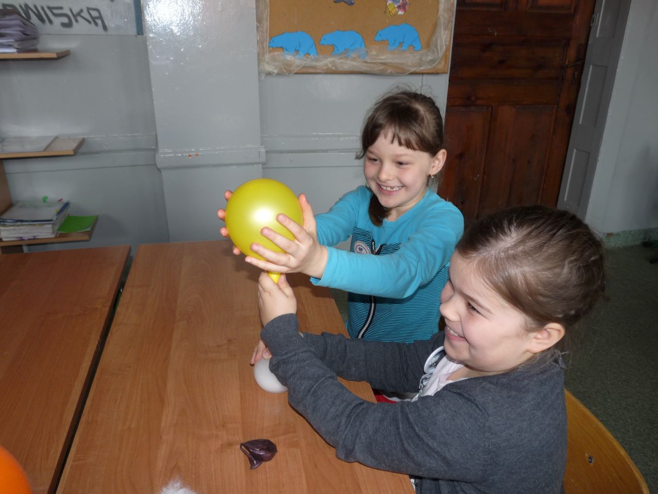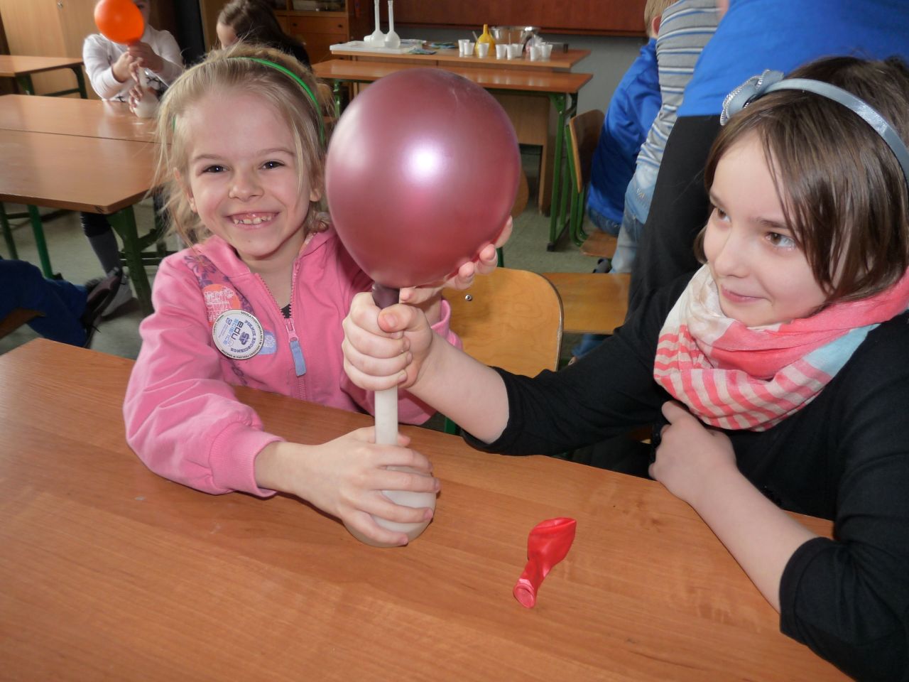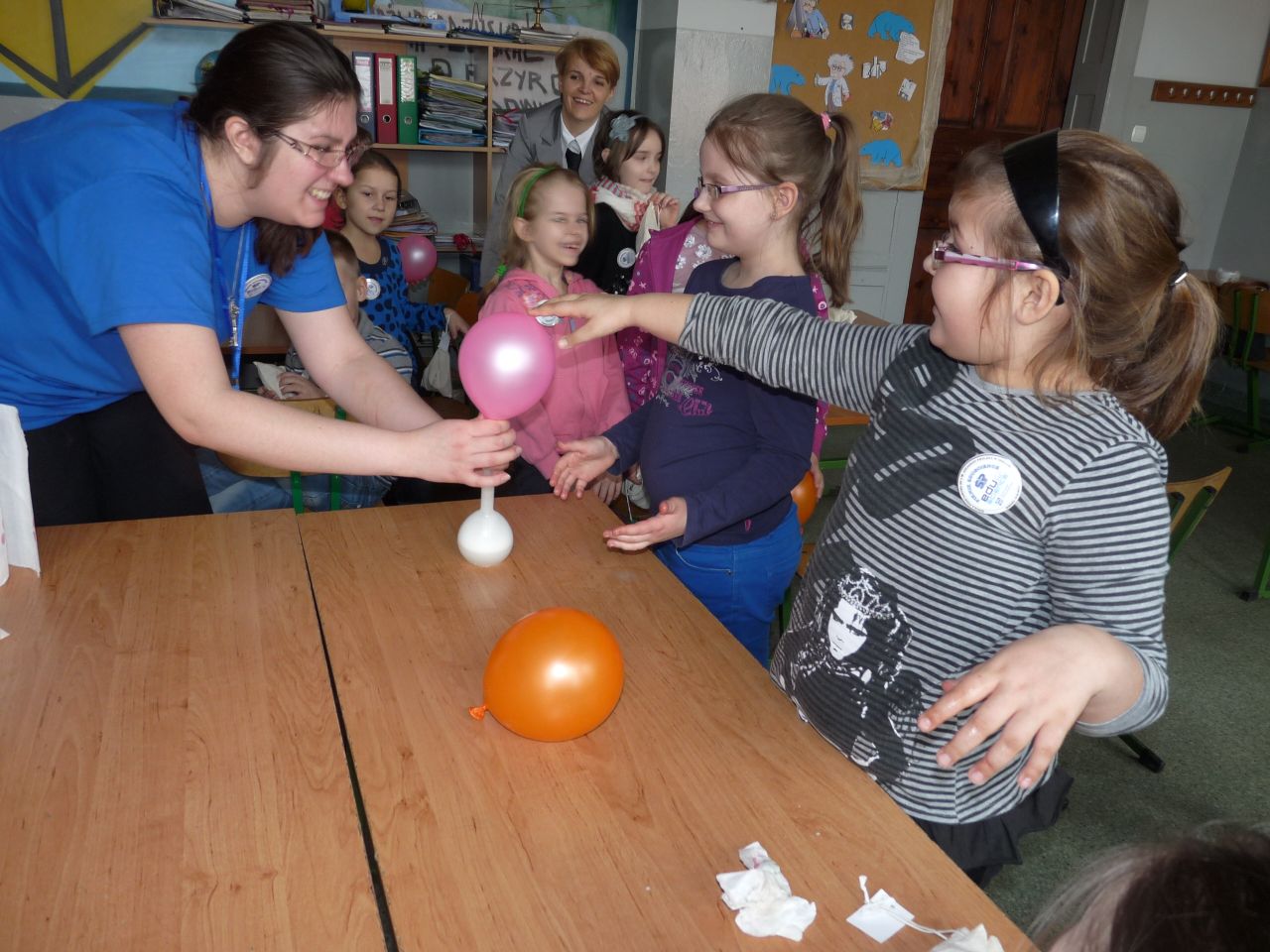 Uczniowie klasy 1 „a” wzięli również udział w specjalnie dla nich przygotowanych lekcjach na temat: „Robotyka” oraz „Powietrze”. Podczas zajęć dzieci poznały skład powietrza, samodzielnie przeprowadziły swoje pierwsze doświadczenie chemiczne, które sprawiło, że balon sam się napompował, co wprawiło pierwszoklasistów w ogromne zdziwienie i zrodziło w nich chęć do poznawania świata nauki. Nagrodą za aktywny udział w przeprowadzanym eksperymencie były klocki logiczne.
