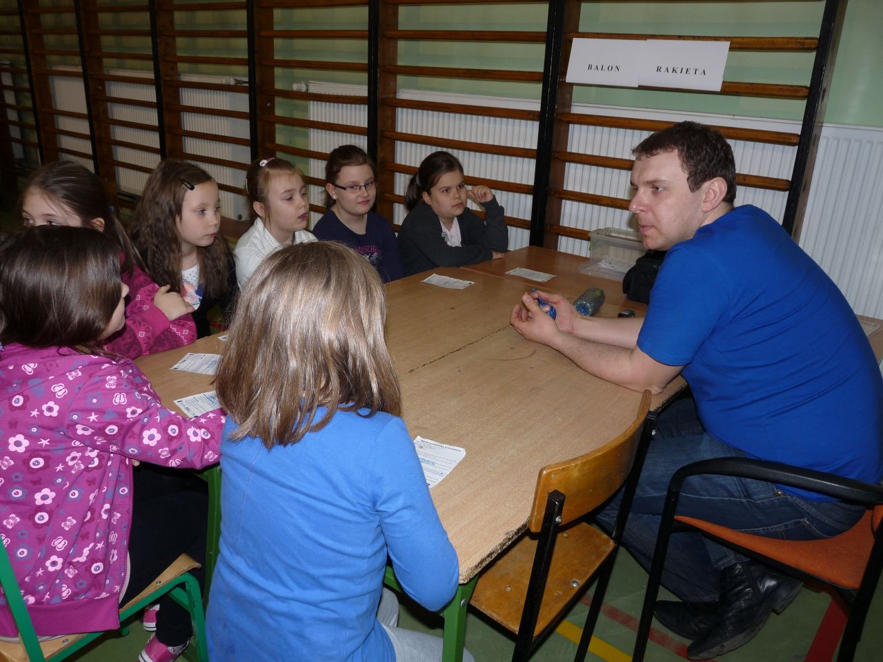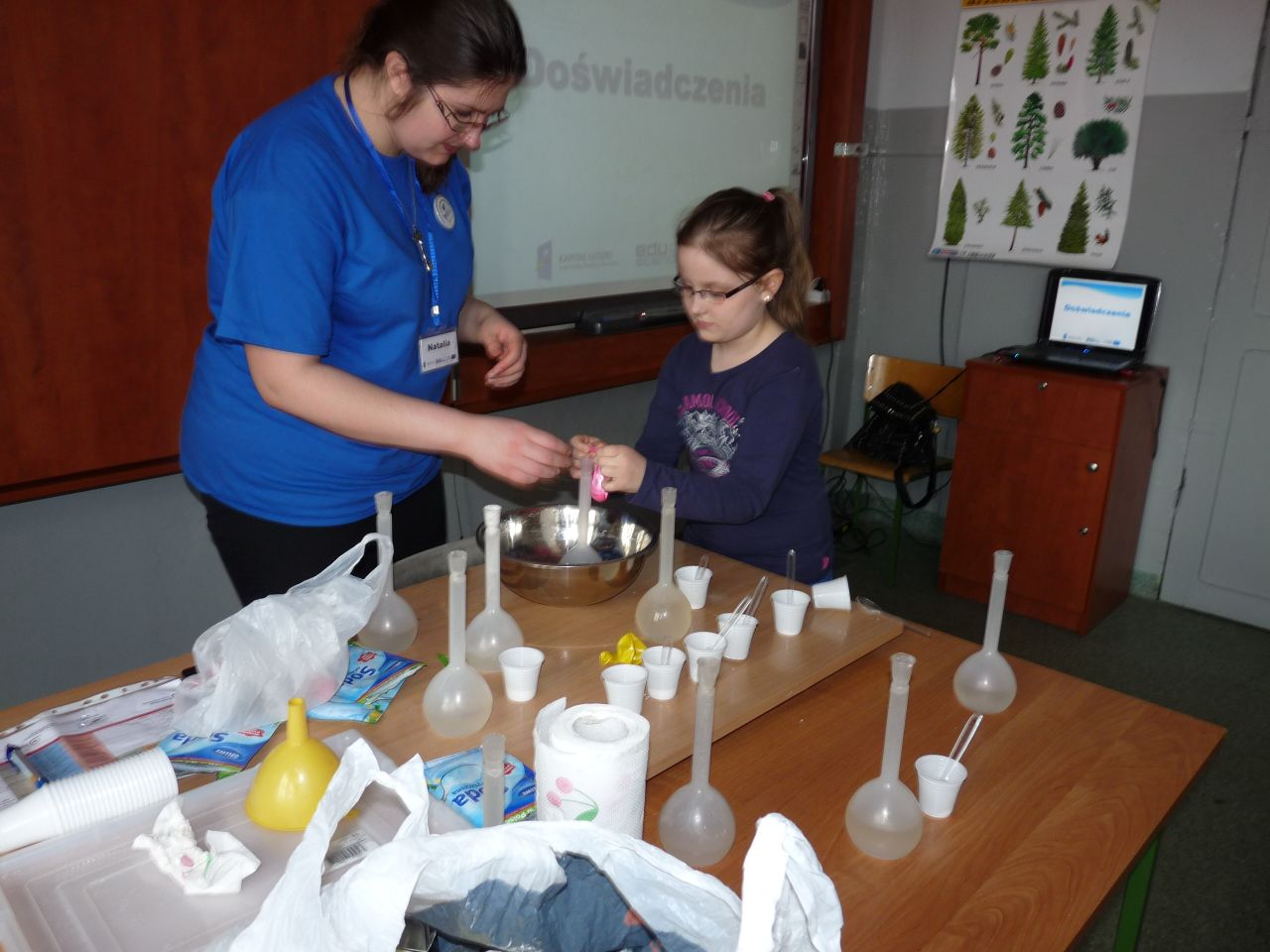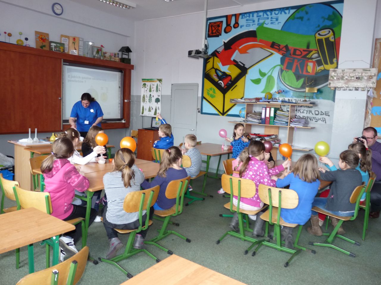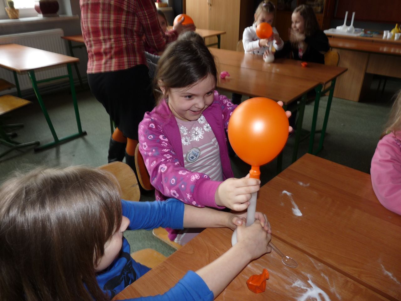 Uczniowie klasy 1 „a” wzięli również udział w specjalnie dla nich przygotowanych lekcjach na temat: „Robotyka” oraz „Powietrze”. Podczas zajęć dzieci poznały skład powietrza, samodzielnie przeprowadziły swoje pierwsze doświadczenie chemiczne, które sprawiło, że balon sam się napompował, co wprawiło pierwszoklasistów w ogromne zdziwienie i zrodziło w nich chęć do poznawania świata nauki. Nagrodą za aktywny udział w przeprowadzanym eksperymencie były klocki logiczne.