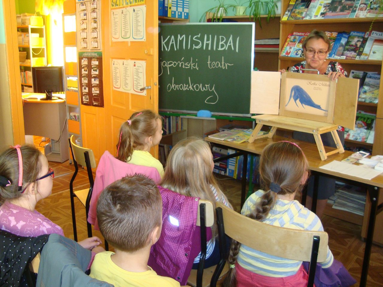 Z okazji święta specjalnymi gośćmi biblioteki szkolnej byli uczniowie klas pierwszych i drugich. Wzięli oni udział w przedstawieniu KAMISHIBAI, japońskim teatrze obrazkowym. Dzieciom bardzo spodobała się ta wyjątkowa forma słuchania bajek, a niektórzy uczniowie wymyślili własne opowieści do KAMISHIBAI.