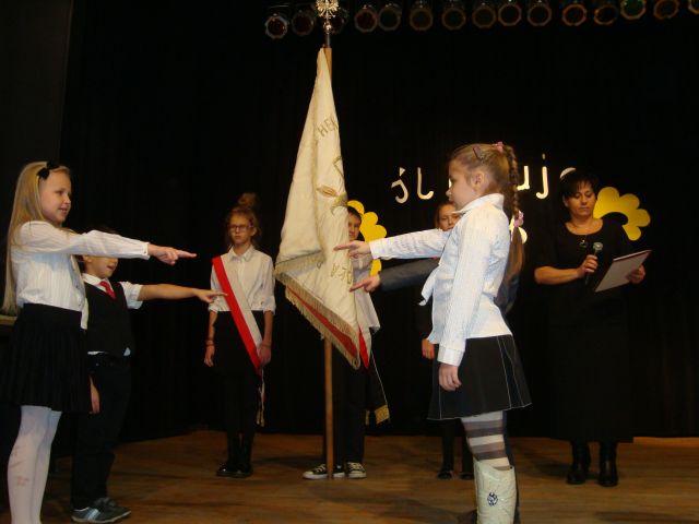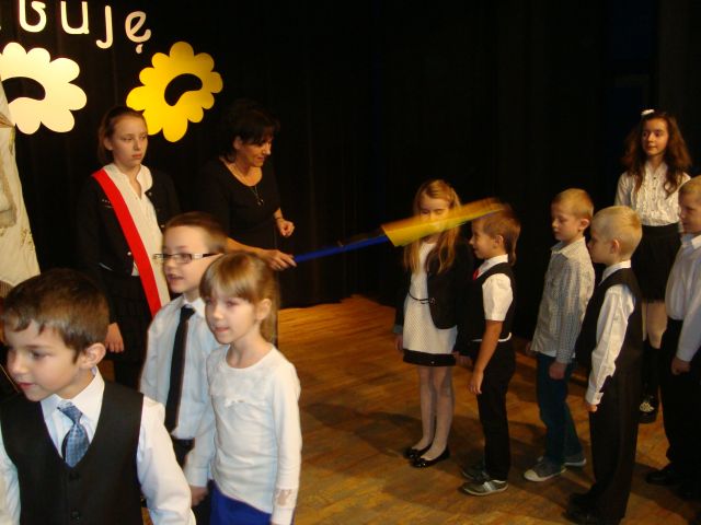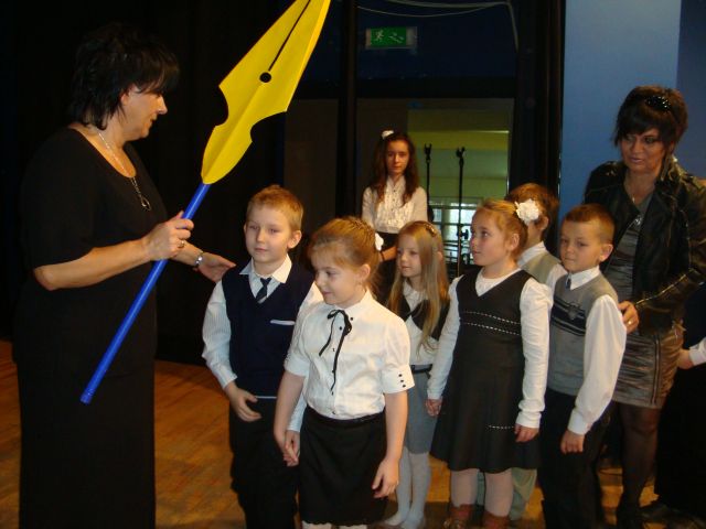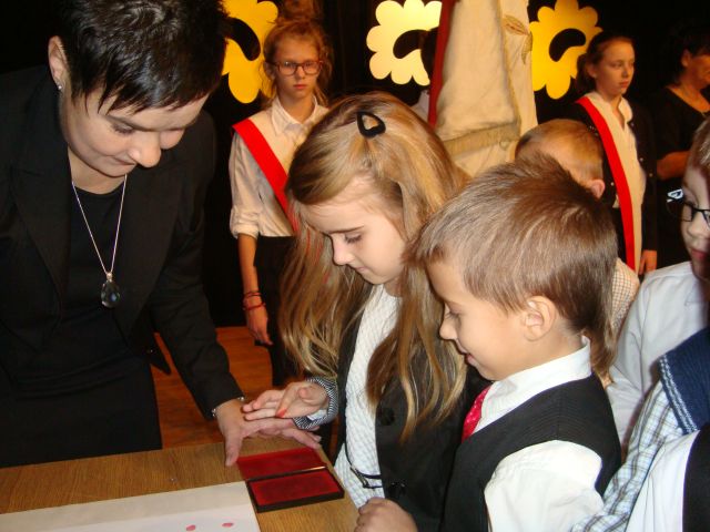 Po części artystycznej nastąpiła oficjalna część, podczas której uczniowie klas I złożyli uroczyste przyrzeczenie, a Pani dyrektor pasowała ich na uczniów, używając wielkiego pióra. Następnie każdy pierwszak musiał „przypieczętować” akt ślubowania odciskiem własnego palca.