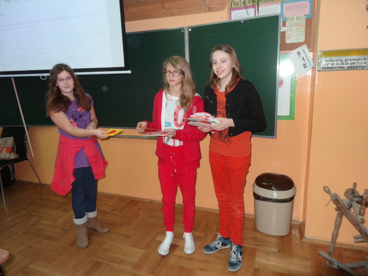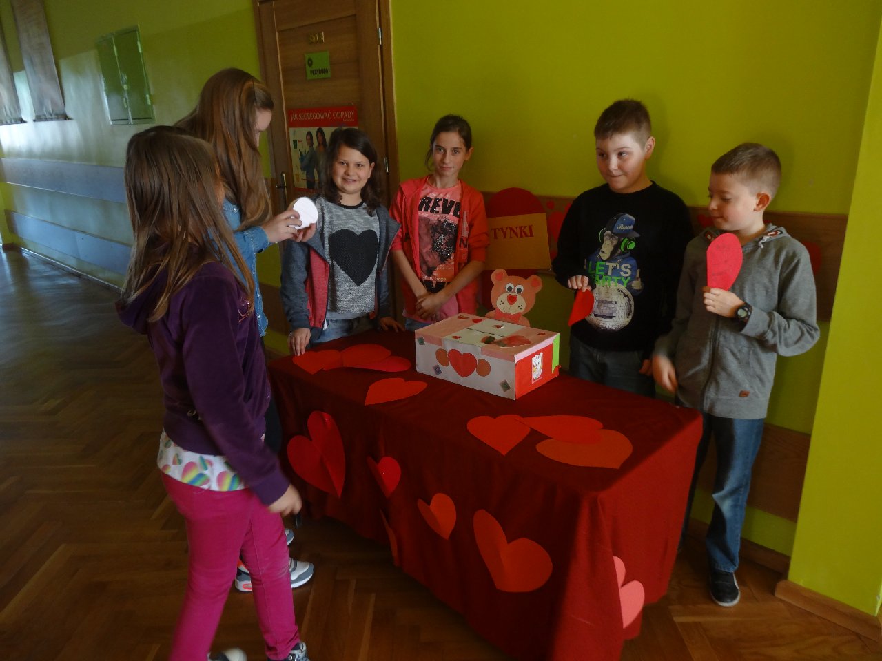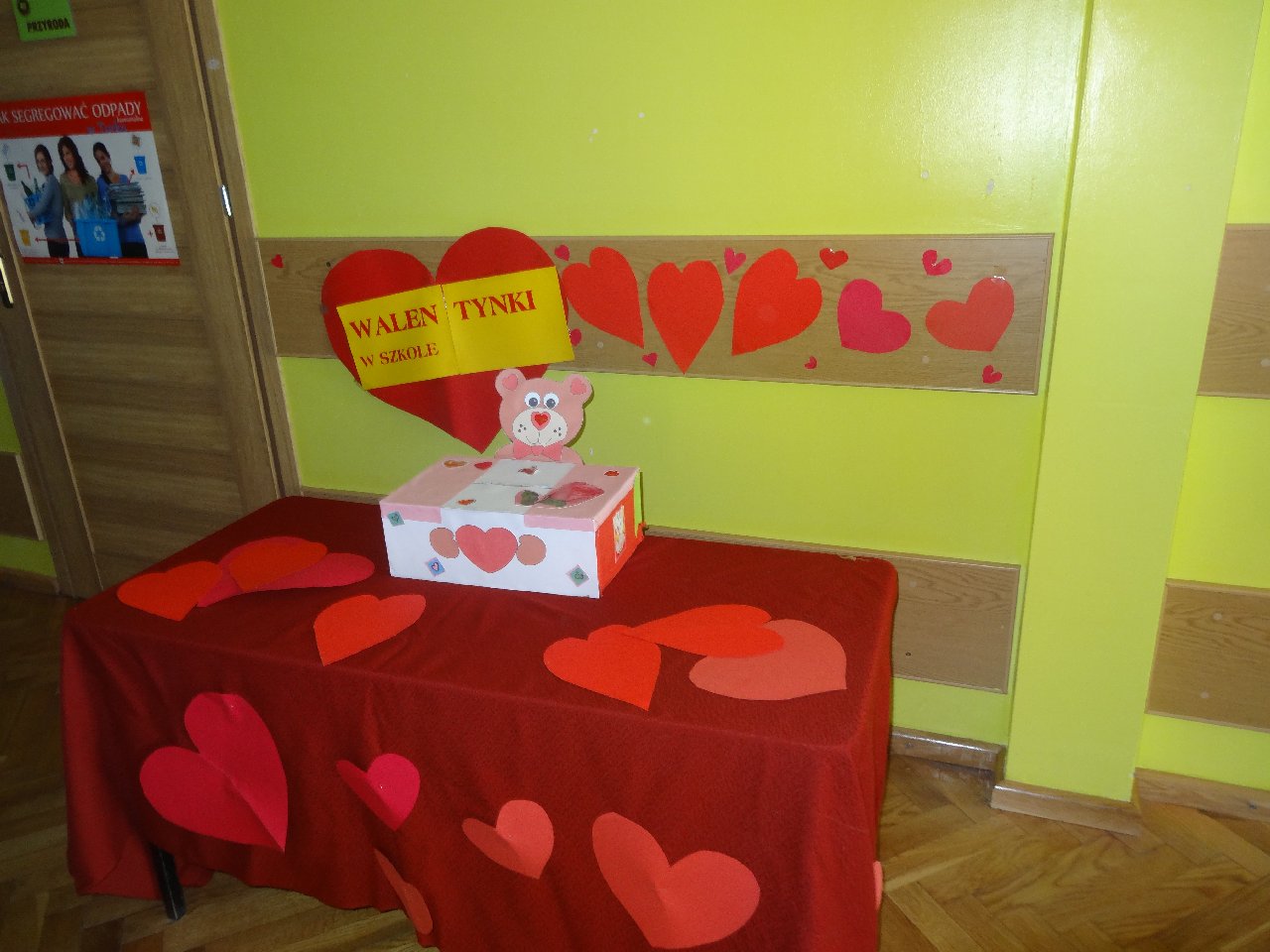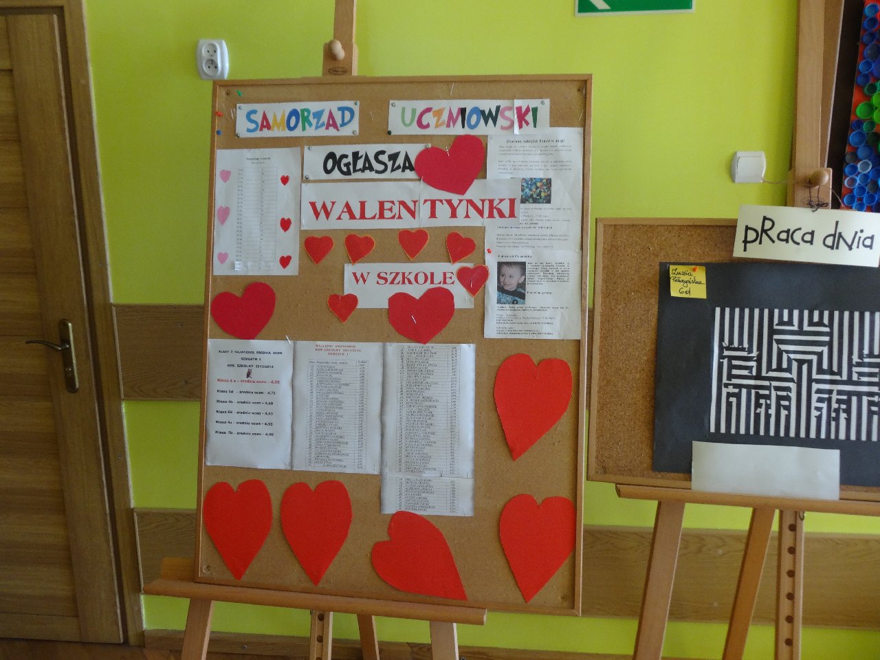 Walentynki w naszej szkole  postanowiliśmy obchodzić  po feriach  19 lutego. Dziewczyny z samorządu przygotowały „pocztę walentynkową”, rozdawały walentynki uczniom oraz nauczycielom. Każdy z nas mógł przekazać parę miłych słów poprzez duże czerwone serce. To nie wszystko, samorząd zorganizował nam dyskotekę  podczas  przerwy. Było super! Co prawda była na korytarzu, ale rozweseliła każdego. Gdyby ktoś zgłodniał na naszej walentynkowej imprezie mógł kupić ciasteczka w kształcie serca. Pieniądze ze sprzedaży walentynkowych ciasteczek  przekazano potrzebującym.
