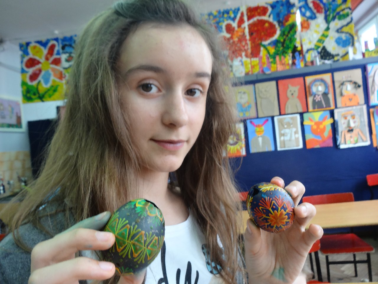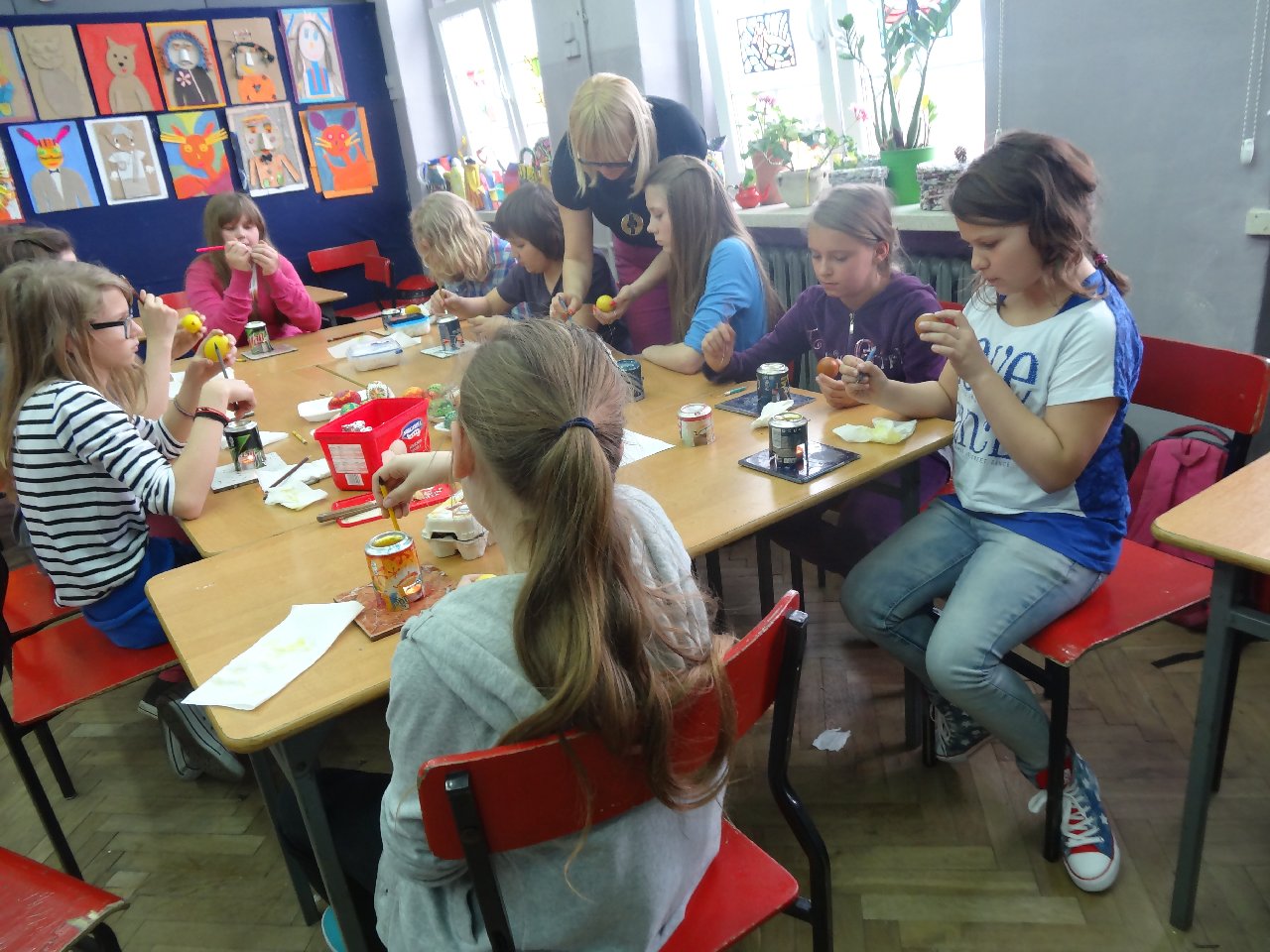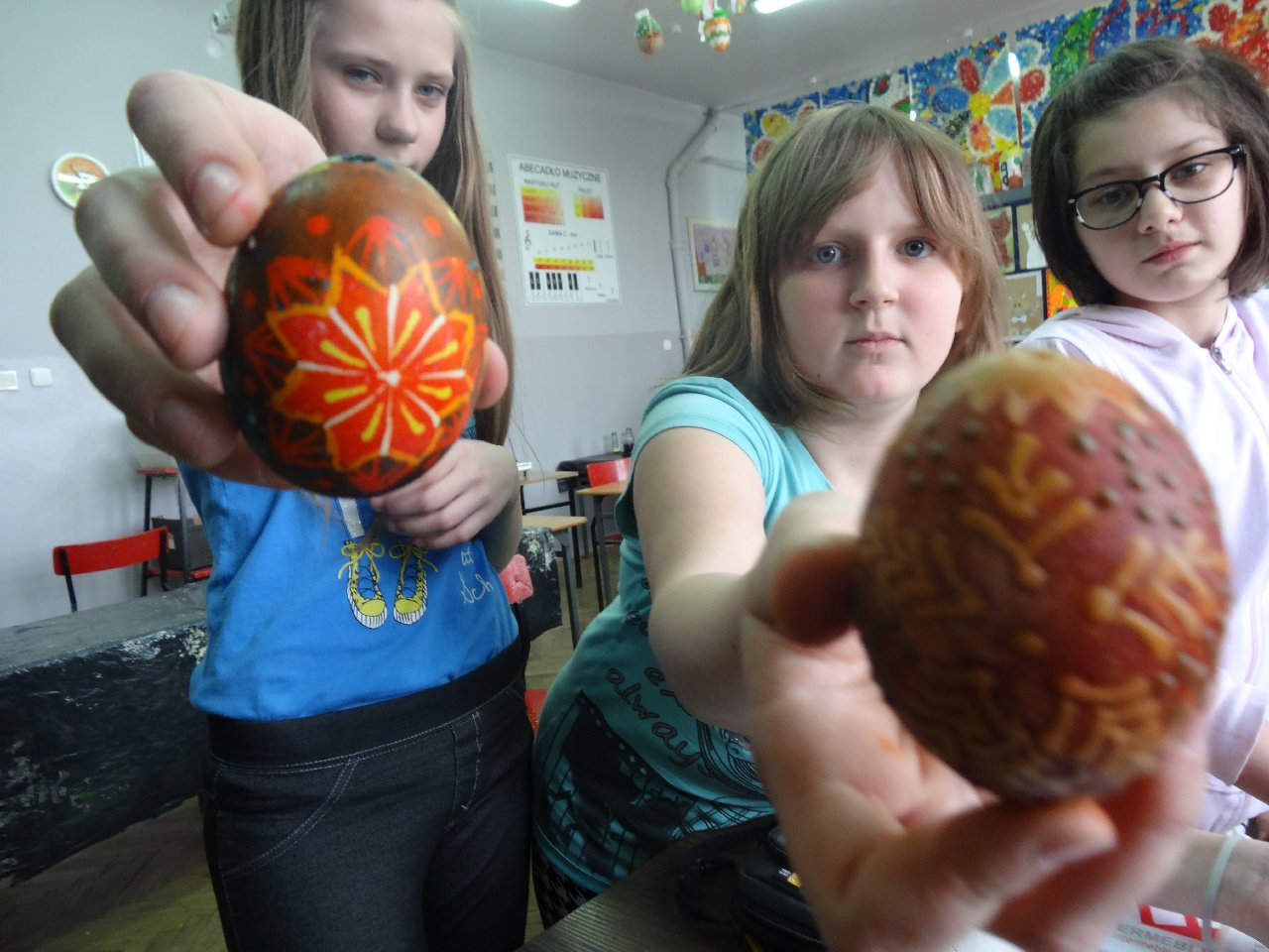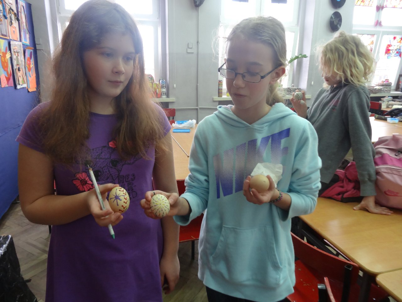 Święta Wielkanocne mają bogatą tradycję. Są niezwykle barwne, towarzyszy im wiele obrzędów. Dzięki nim świąteczne dni są bardziej radosne. Dlatego w naszej szkole odbywały się zajęcia, na których dzieci miały możliwość poznania różnych tradycji. W szczególności lekcje plastyki w tych dniach zamieniły się w profesjonalne warsztaty, podczas których można było zdobić jajka w sposób tradycyjny przez pisanie woskiem. Polegało to na tym, że na czystą skorupkę nanosiły wzór z roztopionego wosku, a następnie zanurzały jajo w roztworze barwnika, co sprawiło że zabarwiły się tylko odsłonięte fragmenty skorupki. Części ukryte pod woskiem nie zmieniły koloru. Po wyjęciu jajka z kąpieli wystarczało zetrzeć wosk miękką ściereczką. Powstały w ten sposób piękne pisanki.Dodatkową atrakcją w tych dniach stał się Kiermasz Pisanek zorganizowany przez uczniów z klasy 5d wraz z wychowawczynią.