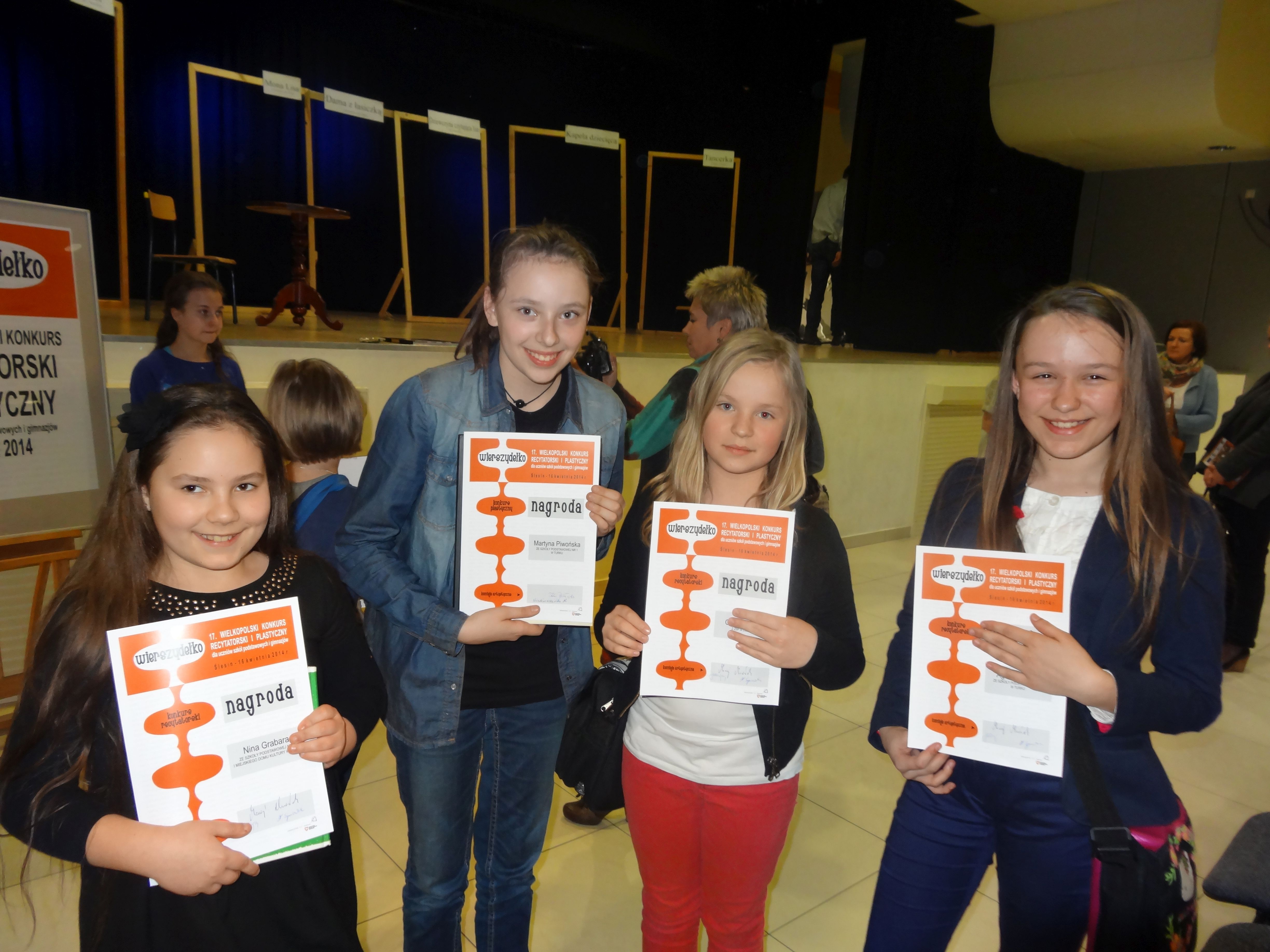 Już po raz 17. w Ślesinie odbył się Wielkopolski Konkurs Recytatorski i Plastyczny „Wierszydełko”. Wzięło w nim udział 58 utalentowanych uczniów szkół podstawowych i gimnazjalnych z całej Wielkopolski, wśród nich znalazły się cztery uczennice SP nr 1 w Turku, które zaprezentowały się znakomicie. W części recytatorskiej nagrodzono Ninę Grabarę i Martę Gomułkę, a wyróżniono Agatę Drabinę. W części plastycznej konkursu wystąpiła MartynaPiwońska, która również otrzymała nagrodę. Warto podkreślić, że aby uczestniczyć w konkursie trzeba było przejść wiele eliminacji i zwyciężyć w 22. Międzypowiatowym Konkursie Recytatorskim „Czerwieńcie, zieleńcie się słowa” w Strzałkowie. Gratulujemy, życząc kolejnych sukcesów!