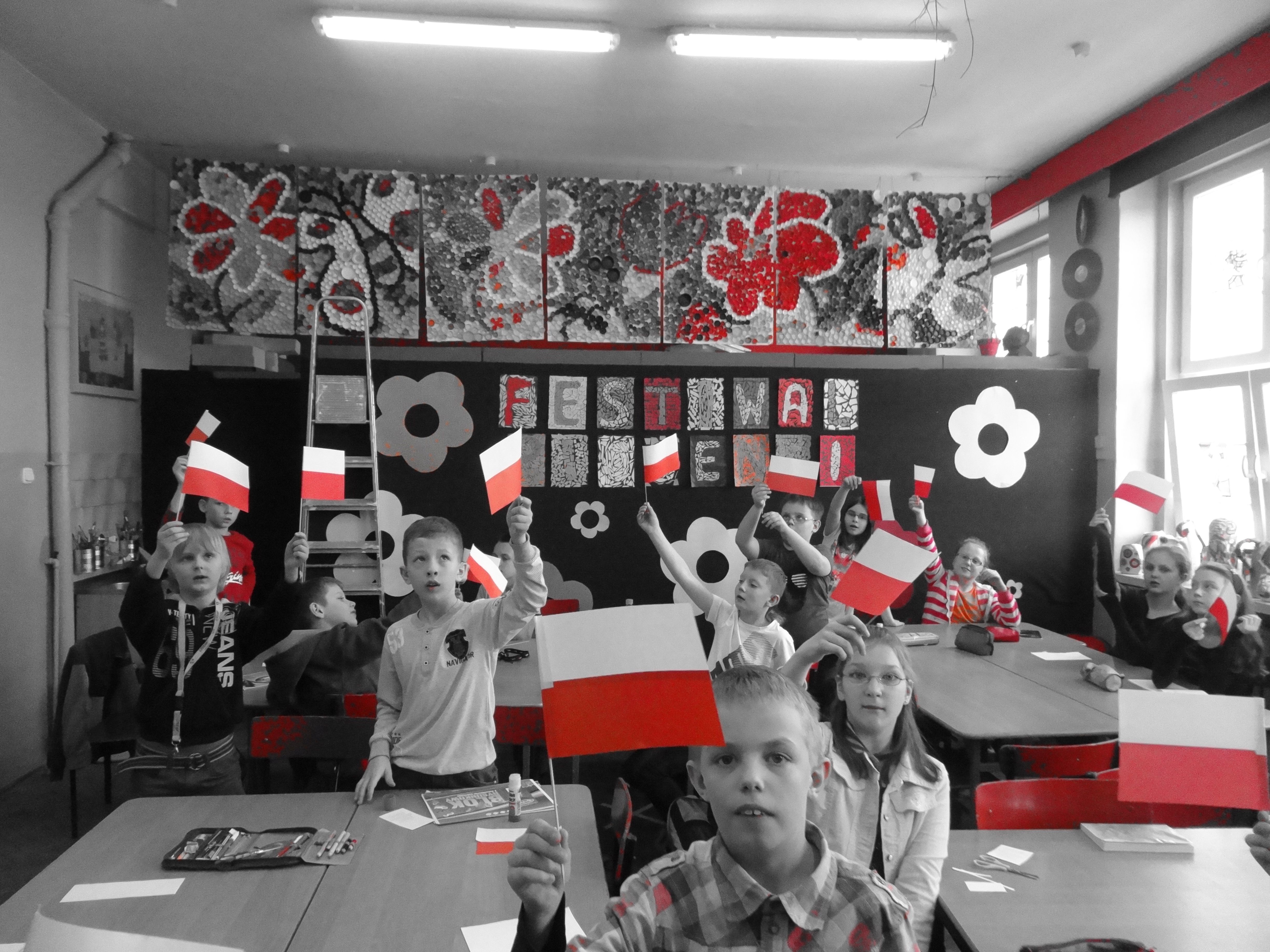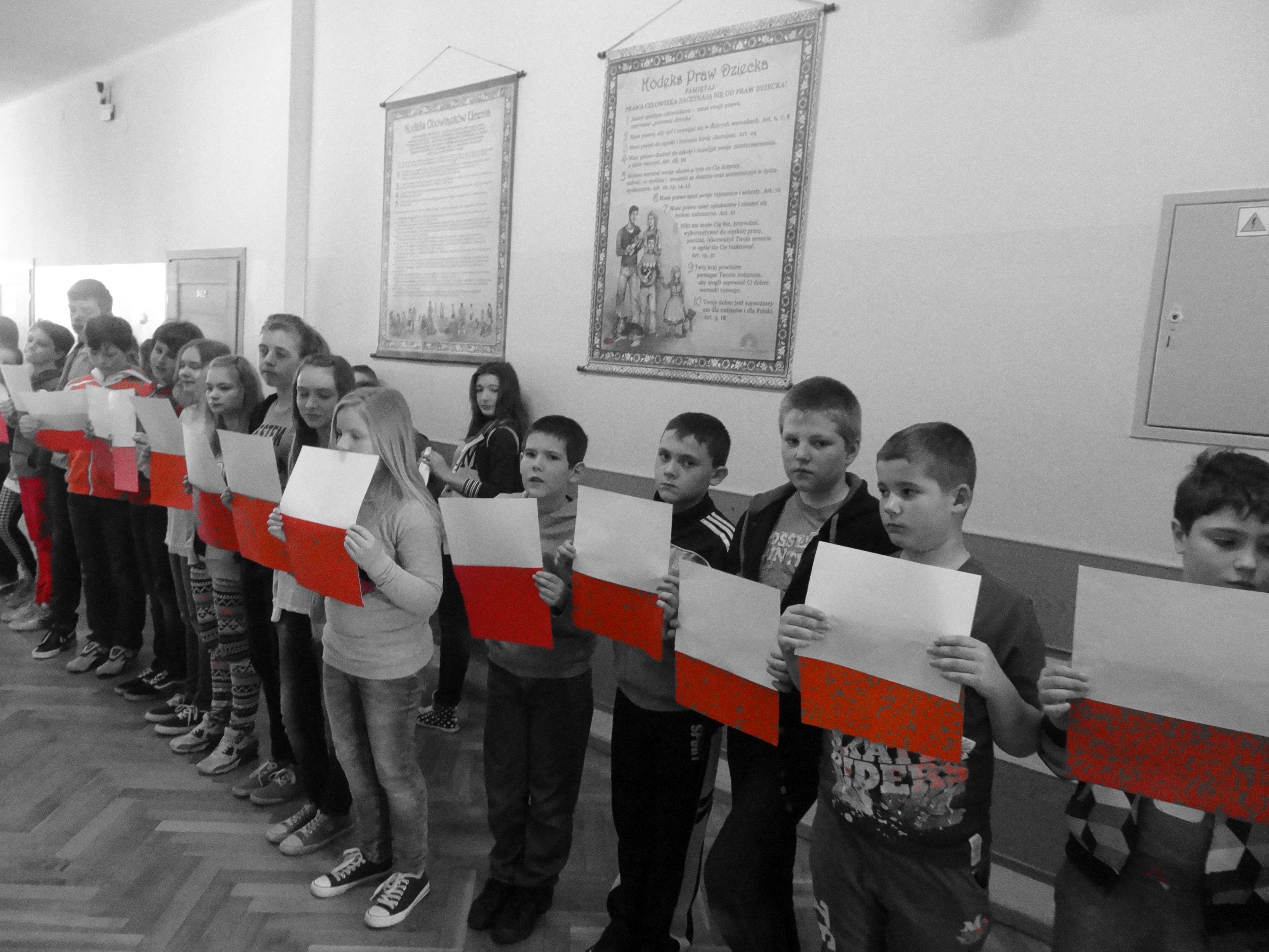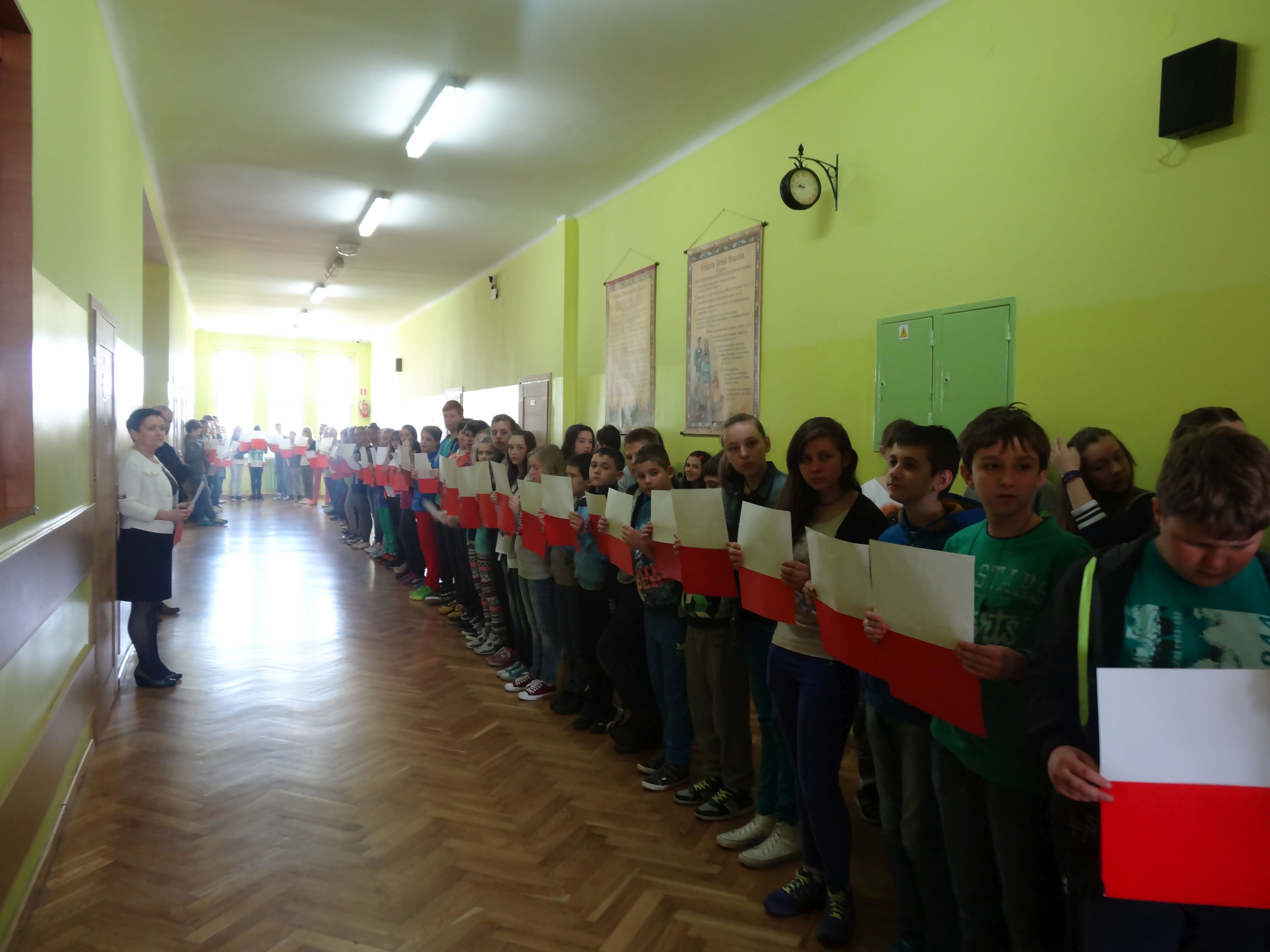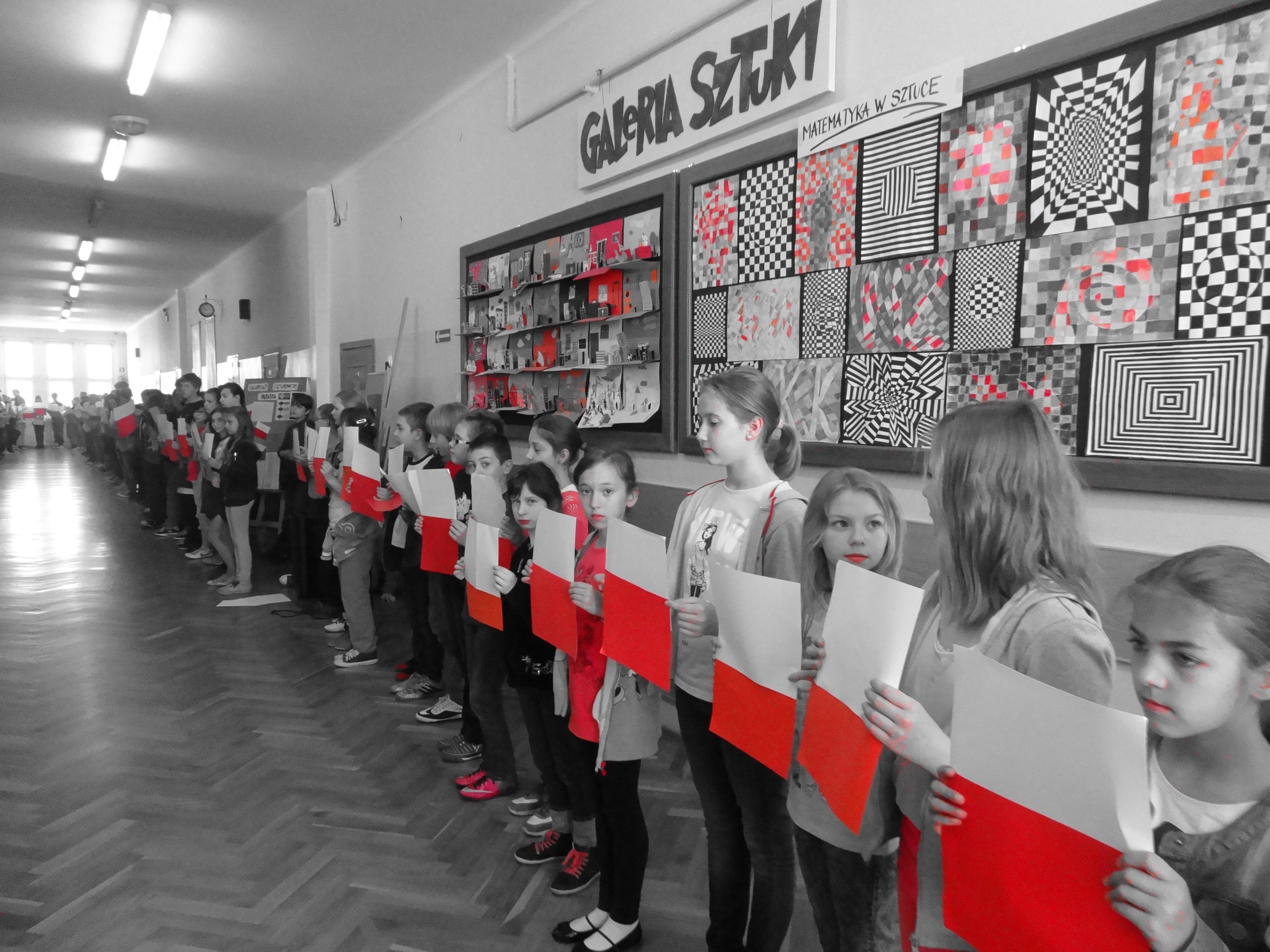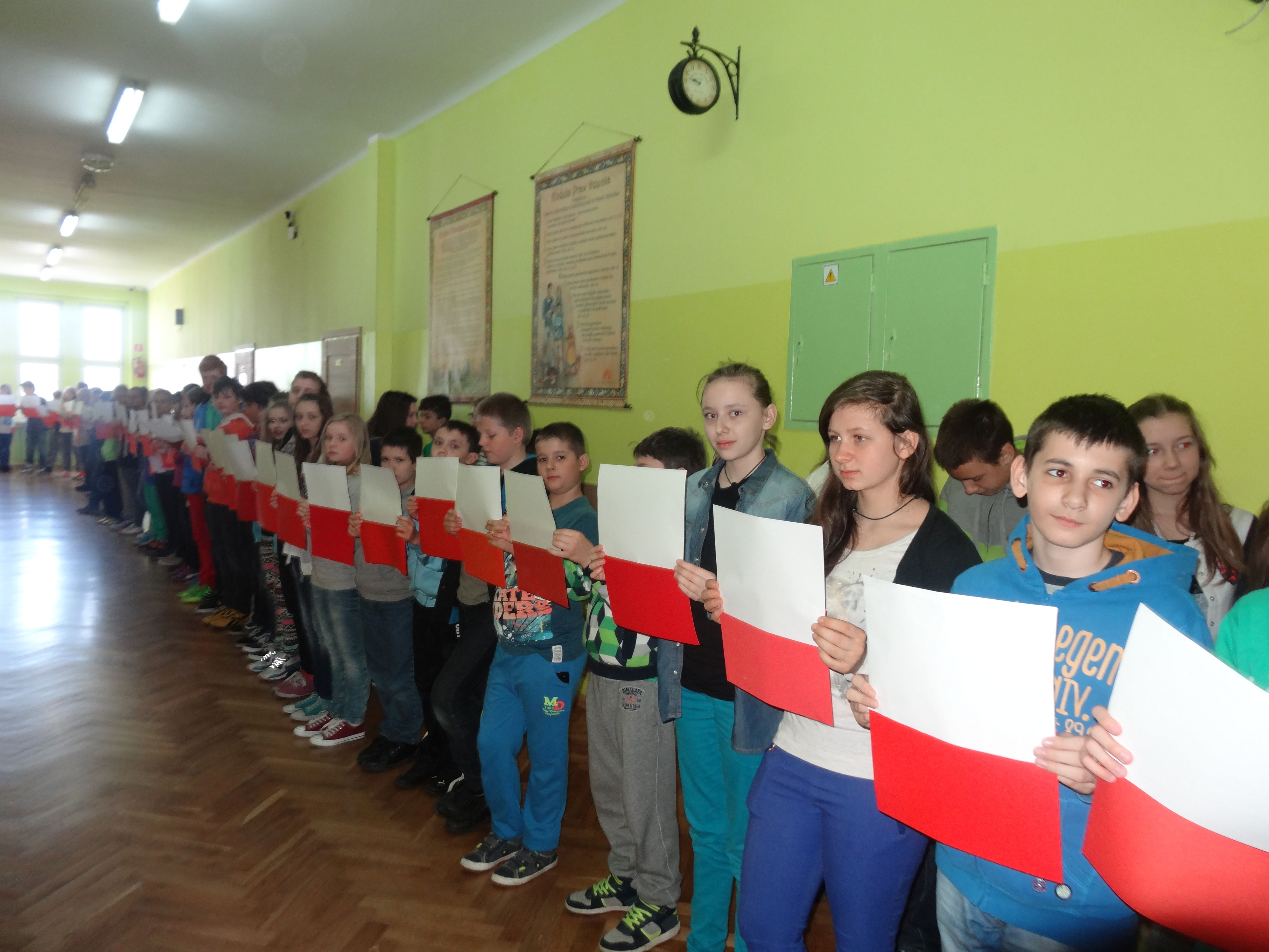 Tradycją naszej szkoły jest corocznie uczczenie Święta Flagi RP. W tym roku SU zorganizował „żywą flagę”, wykorzystując przestrzeń szkolnego korytarza. Na długiej przerwie uczniowie „jedynki”, trzymając w ręku biało –czerwone kartki, utworzyli najdłuższą - jak dotąd - flagę w szkole. Pomysł spodobał się dzieciom, dlatego od razu z wielkim zaangażowaniem przystąpiły do dzieła. W ten sposób uczniowie naszej szkoły wyrazili szacunek i przywiązanie do symboli narodowych.