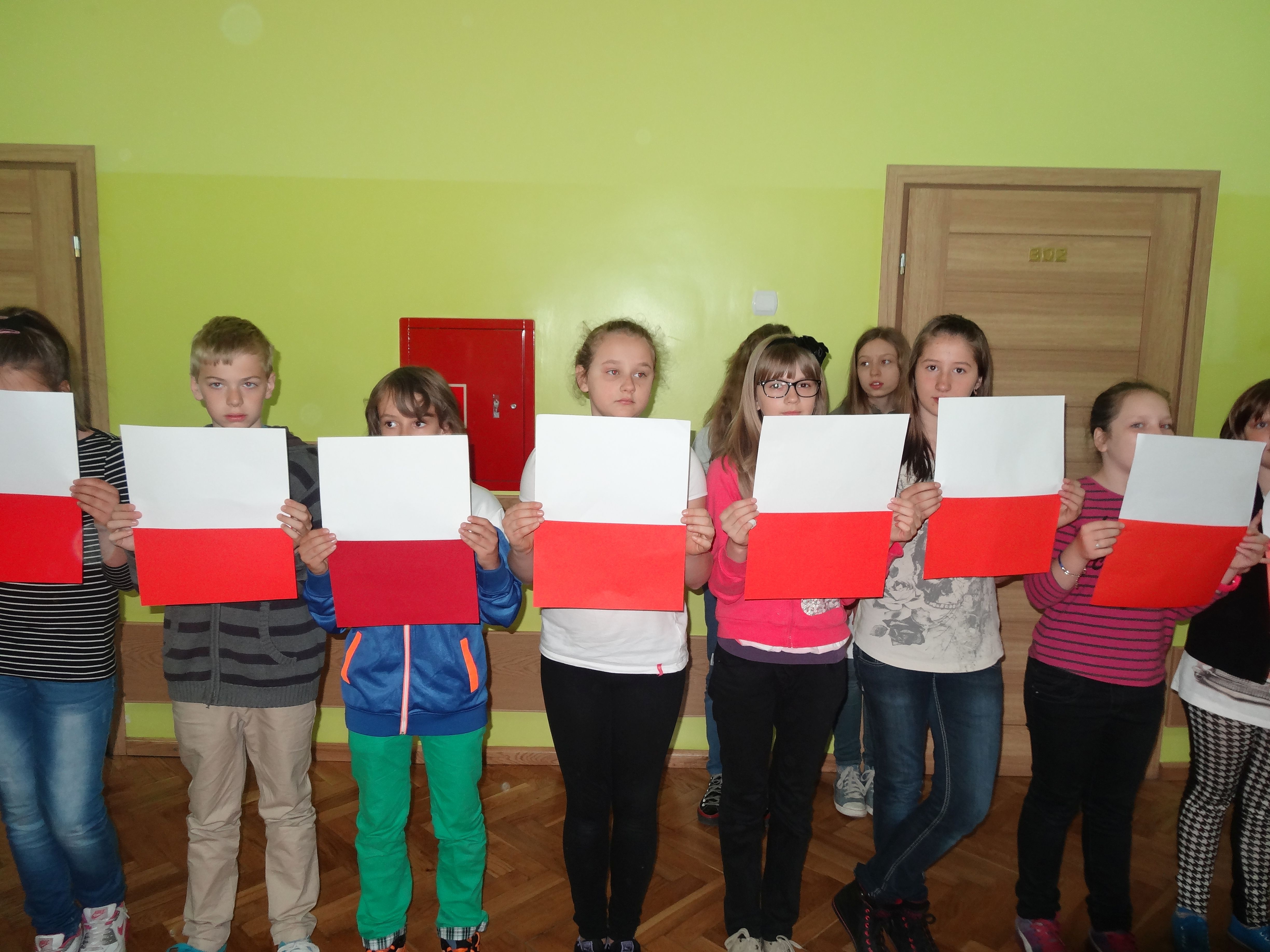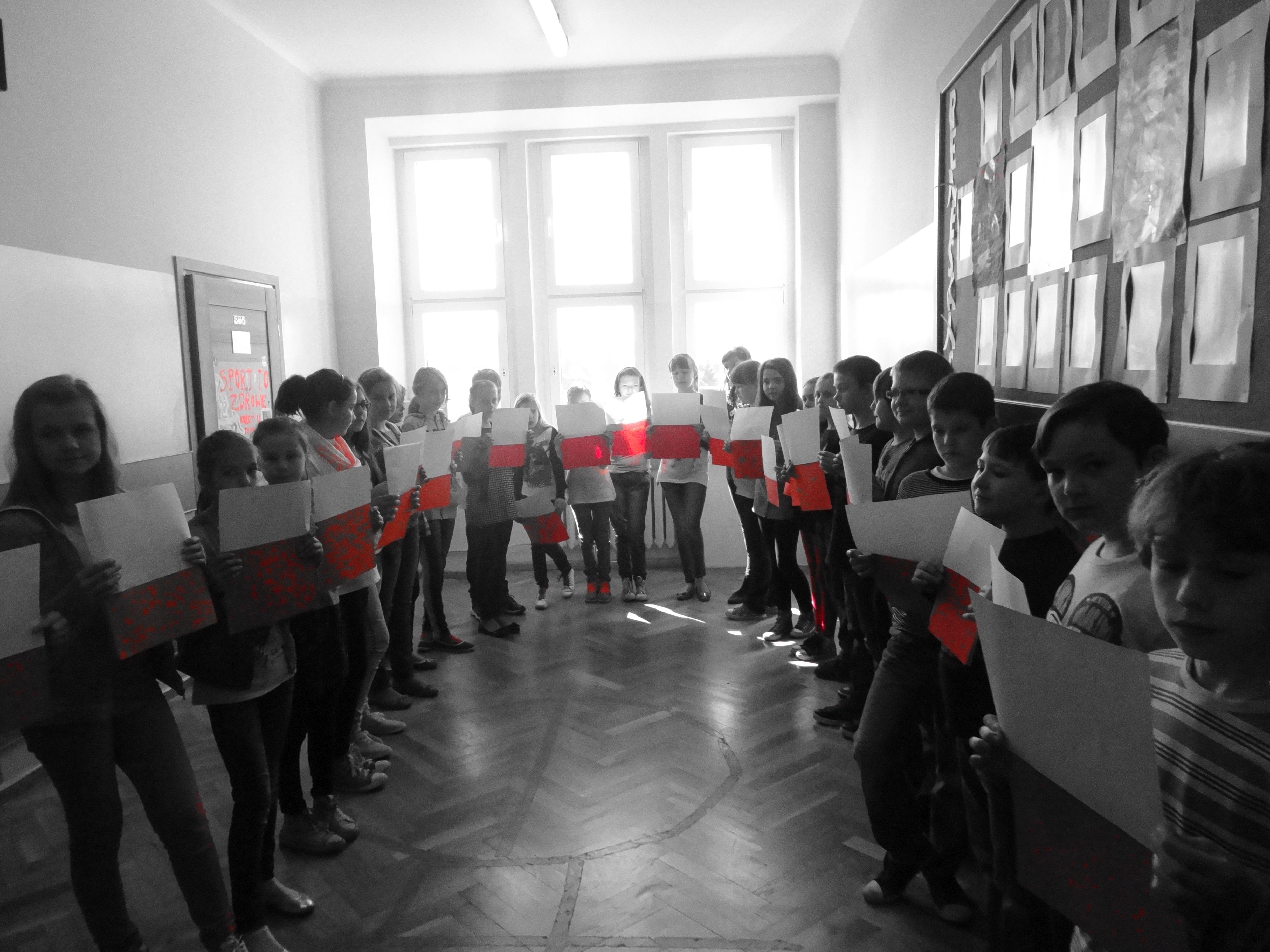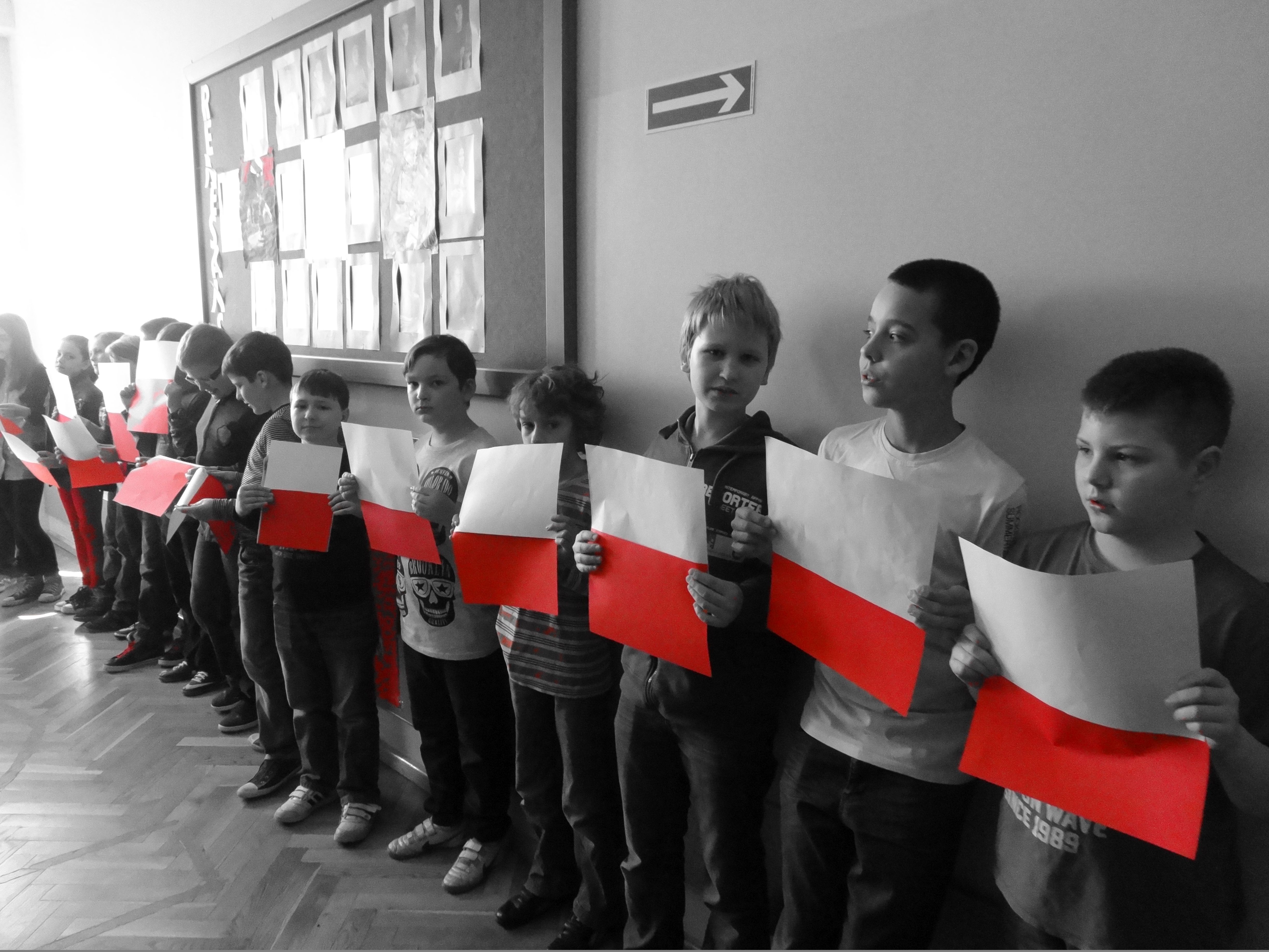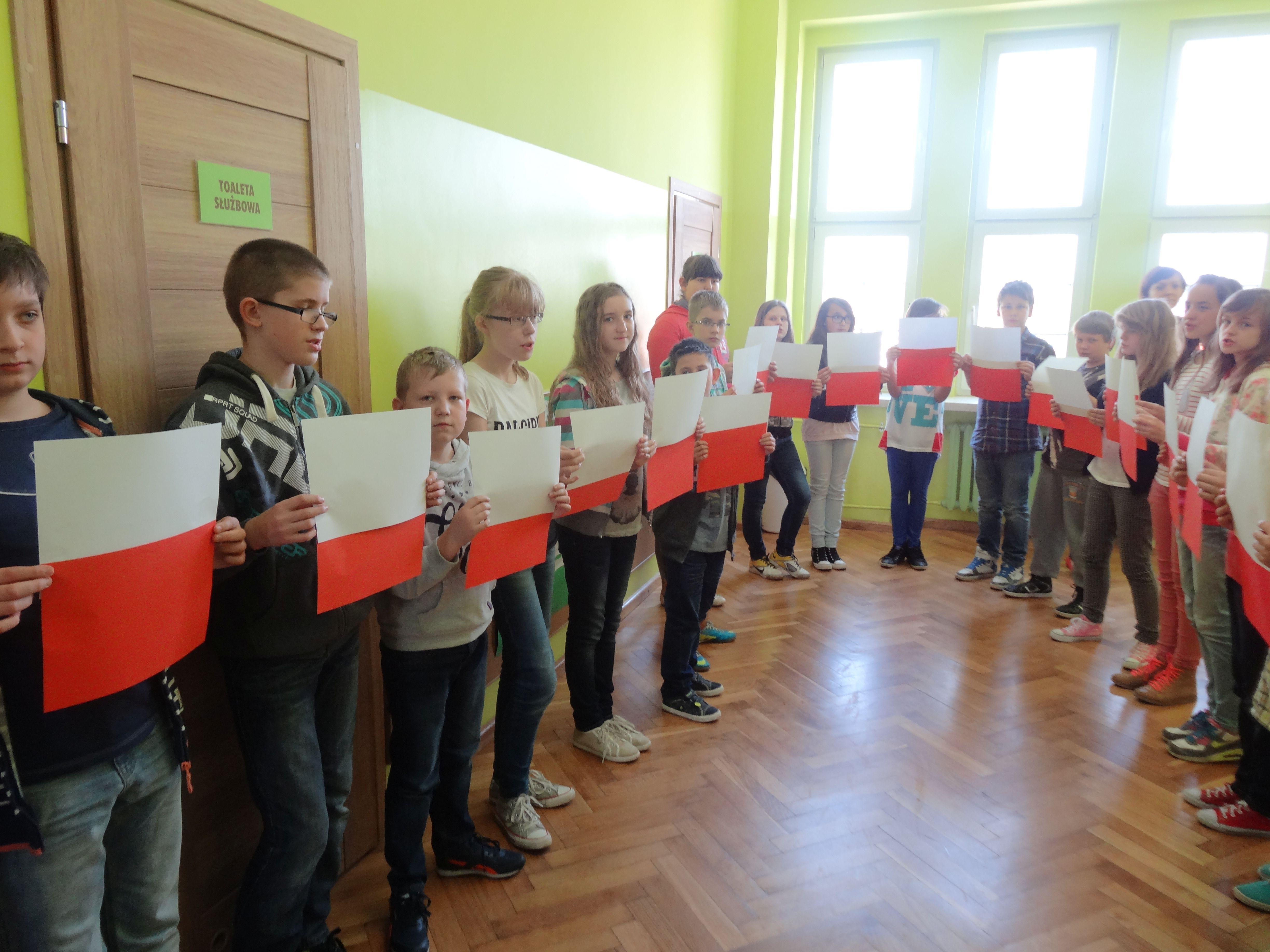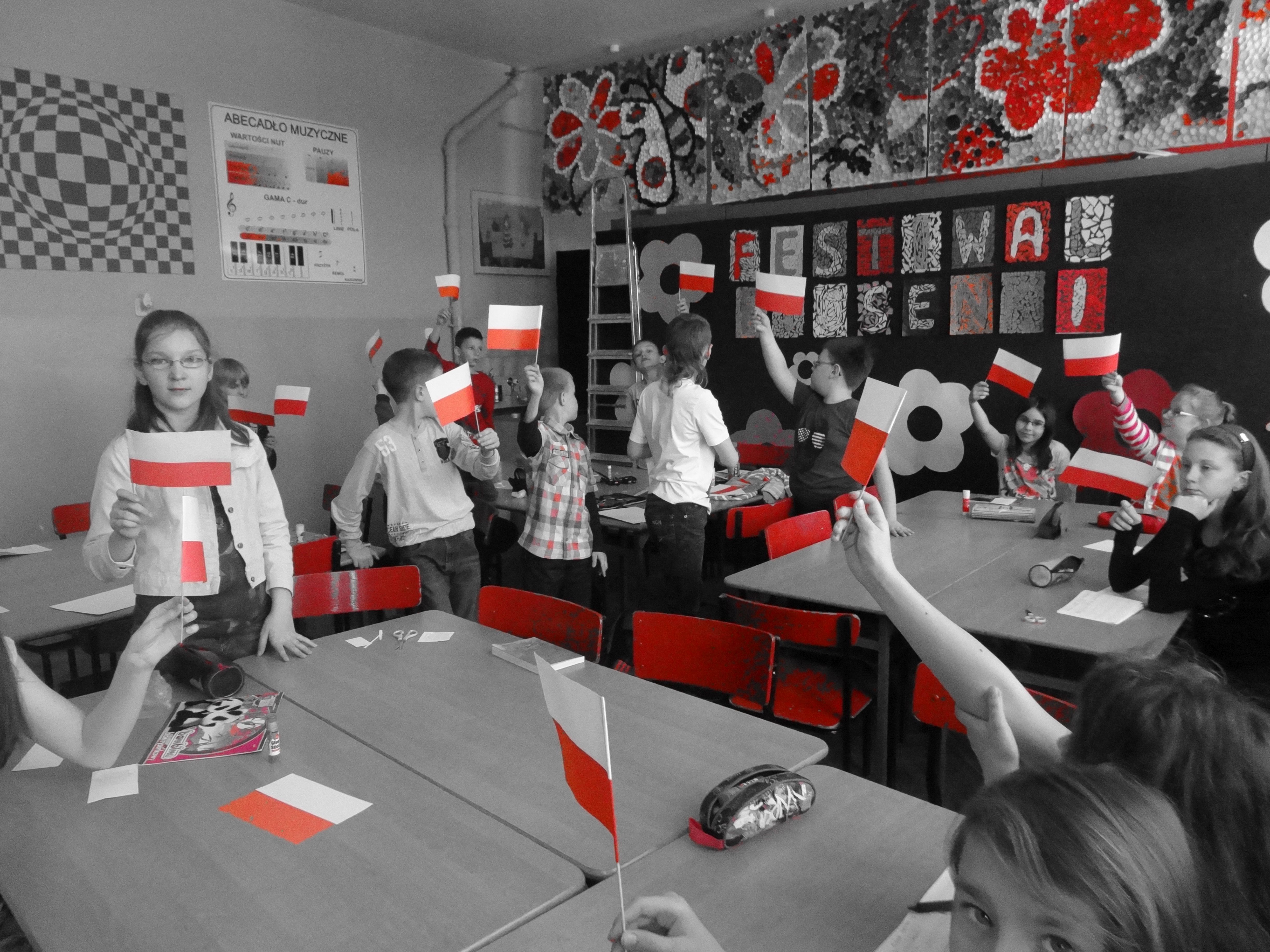 Tradycją naszej szkoły jest corocznie uczczenie Święta Flagi RP. W tym roku SU zorganizował „żywą flagę”, wykorzystując przestrzeń szkolnego korytarza. Na długiej przerwie uczniowie „jedynki”, trzymając w ręku biało –czerwone kartki, utworzyli najdłuższą - jak dotąd - flagę w szkole. Pomysł spodobał się dzieciom, dlatego od razu z wielkim zaangażowaniem przystąpiły do dzieła. W ten sposób uczniowie naszej szkoły wyrazili szacunek i przywiązanie do symboli narodowych.