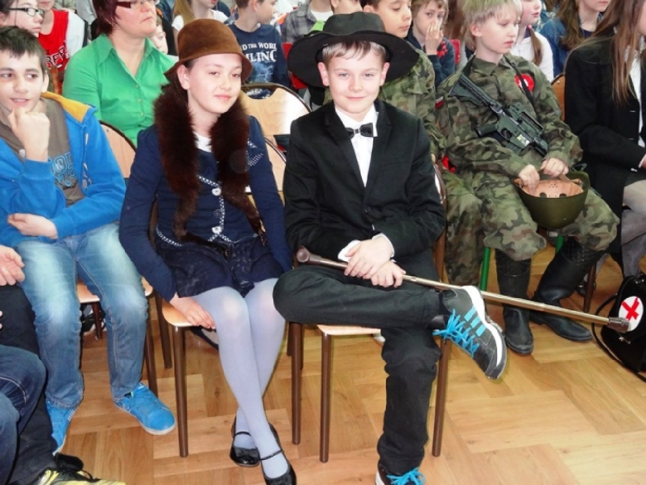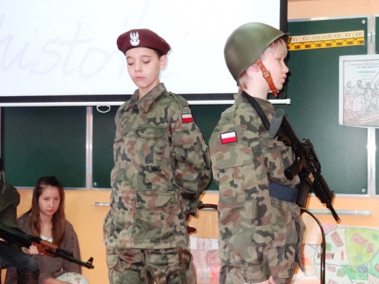 Uczniowie z klasy V d przygotowali krótką inscenizację, dotyczącą jedynego w dziejach naszego kraju, zwycięskiego zrywu powstańczego, jakim było Powstanie Wielkopolskie. Zarówno autorem scenariusza, jak i reżyserem przedstawienia był uczeń Maciej Adamiak. Jego koledzy i koleżanki wspaniale wcielili się w role postaci, występujących w przedstawieniu: Ignacego Paderewskiego z małżonką, Wielkopolan i żołnierzy. Uczniowie wykorzystali różne rekwizyty: hełmy z pracowni historycznej, za mundury posłużyły harcerskie mundurki, a bronią były po prostu zabawki ze sklepu. Inscenizacja była odegrana w sposób bardzo brawurowy i pełen ekspresji, czego wyrazem były głośne owacje publiczności, którą stanowili uczniowie klas V i VI.