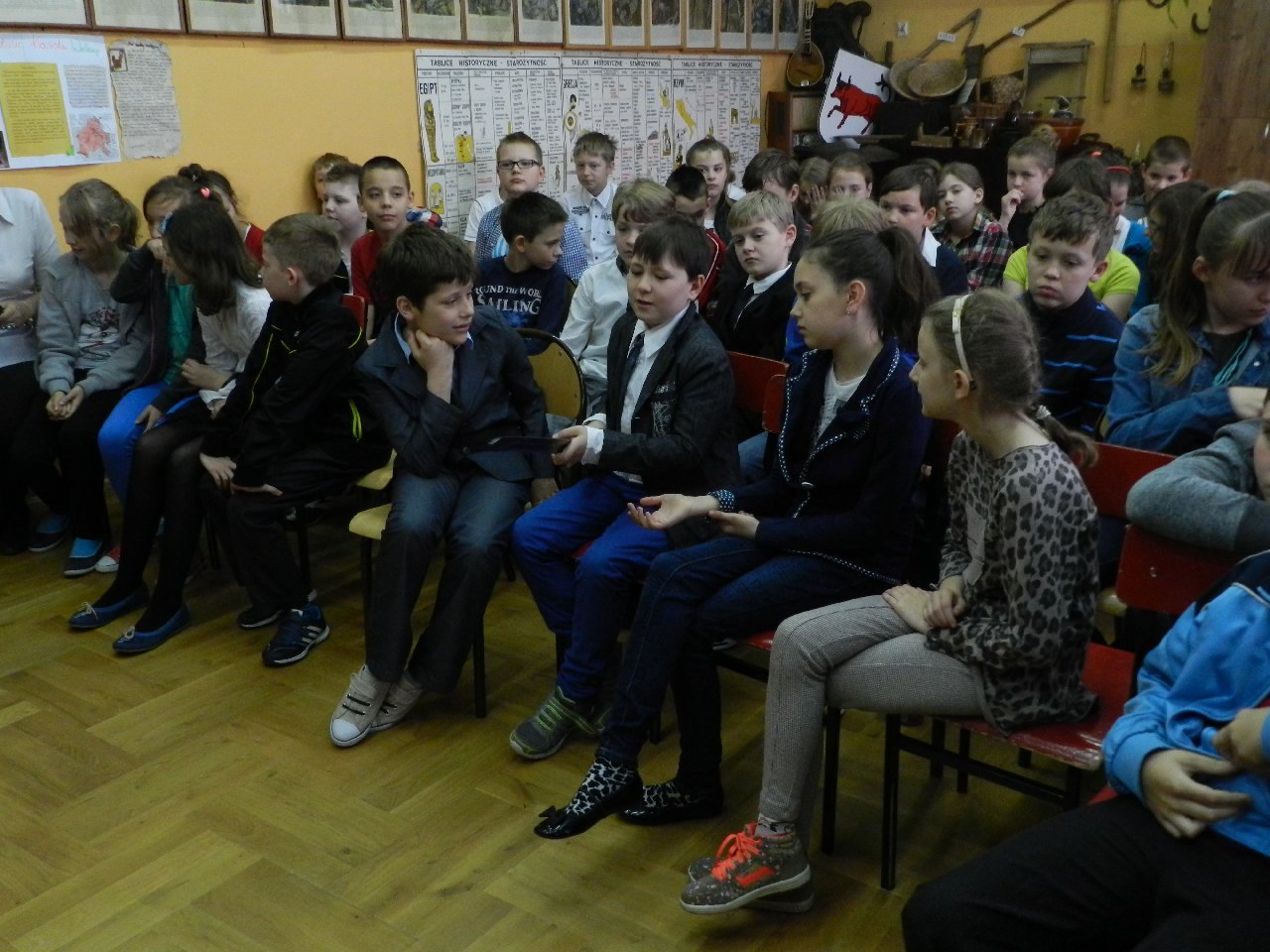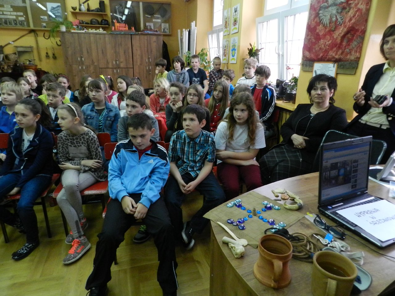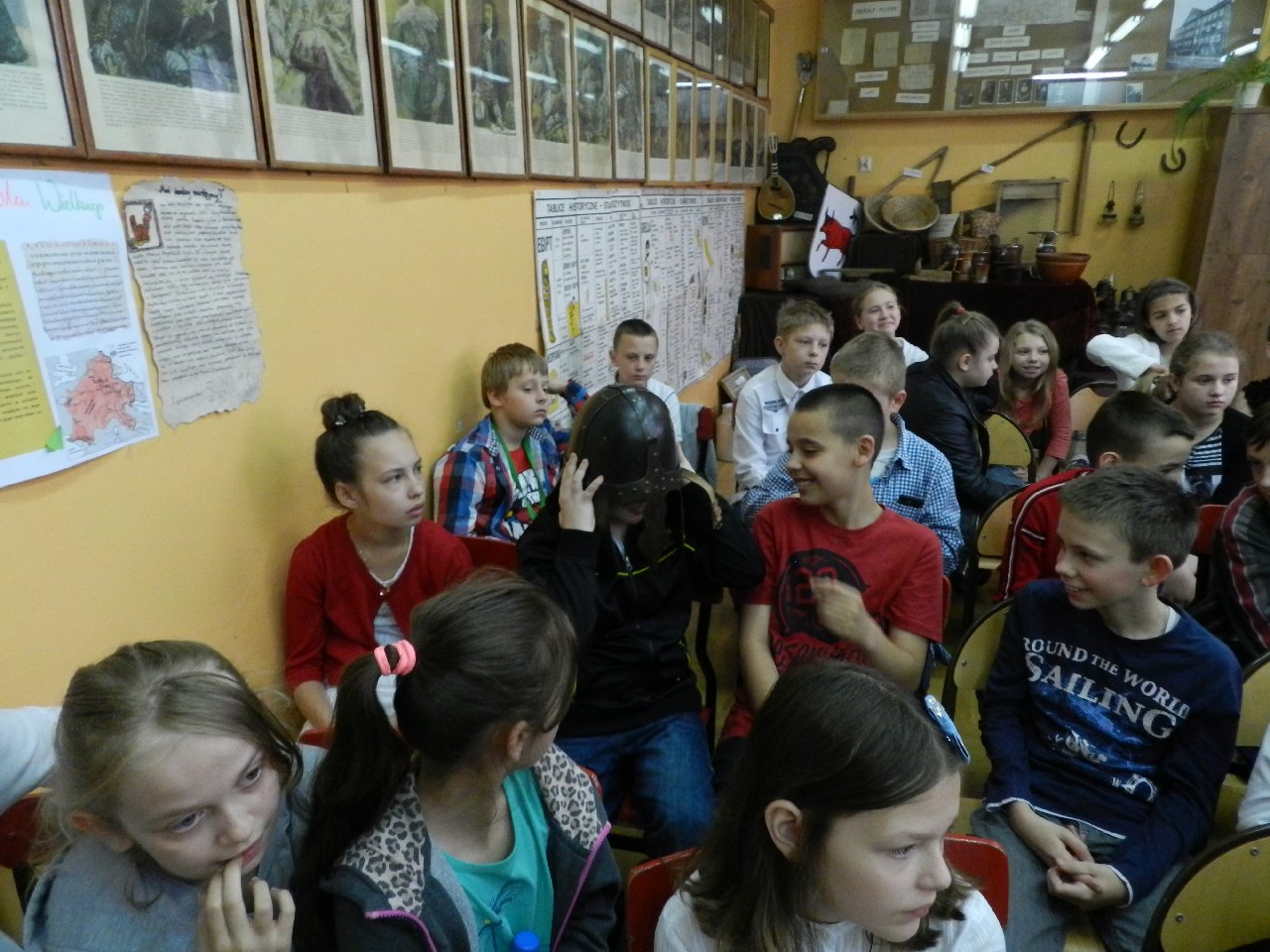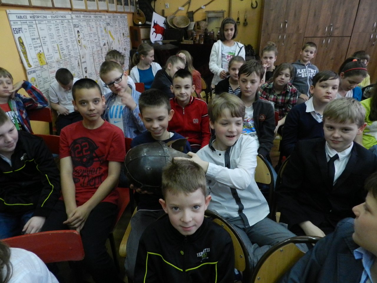 Duże zainteresowanie wśród uczniów wzbudził pokaz walki wojów, w którym wzięła udział Miriam Moszczyńska, uczennica klasy 5 b, a jednocześnie siostra Mateusza i córka Witolda Moszczyńskiego. Na zakończenie uczniowie mogli przymierzyć stroje, obejrzeć elementy zbroi, tarcze, hełmy i oszczepy, a bardziej dociekliwi zadawali gościom wiele pytań. Lekcja była bardzo ciekawa, na pewno na długo zapadnie w pamięć naszych uczniów.
