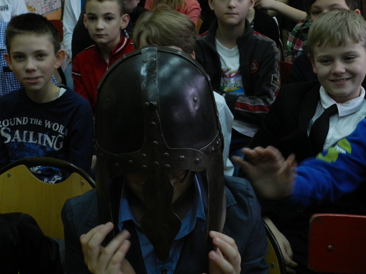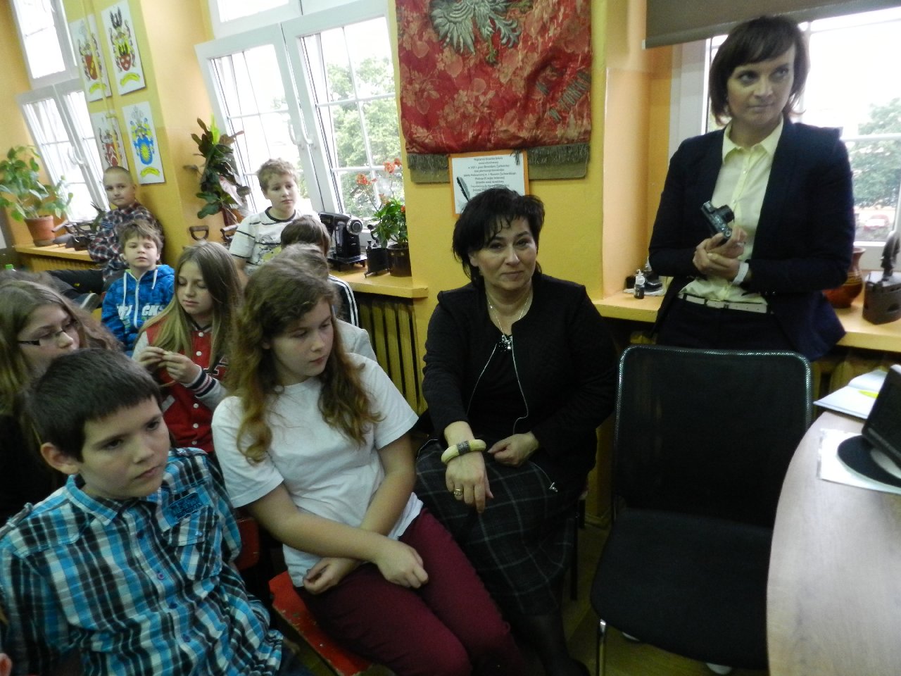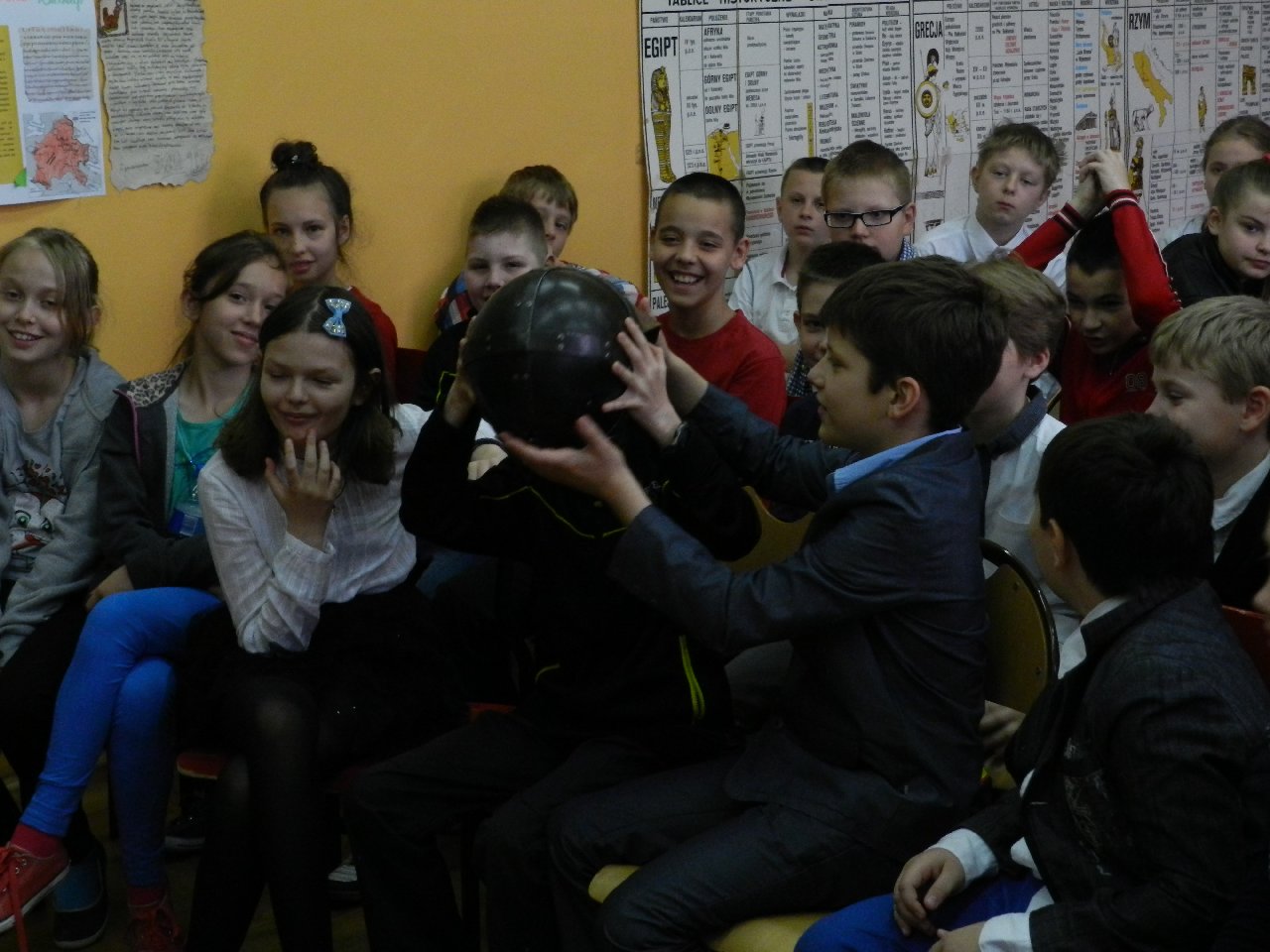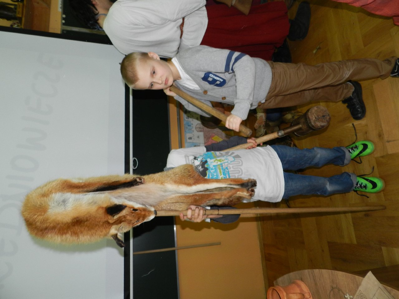 Duże zainteresowanie wśród uczniów wzbudził pokaz walki wojów, w którym wzięła udział Miriam Moszczyńska, uczennica klasy 5 b, a jednocześnie siostra Mateusza i córka Witolda Moszczyńskiego. Na zakończenie uczniowie mogli przymierzyć stroje, obejrzeć elementy zbroi, tarcze, hełmy i oszczepy, a bardziej dociekliwi zadawali gościom wiele pytań. Lekcja była bardzo ciekawa, na pewno na długo zapadnie w pamięć naszych uczniów.