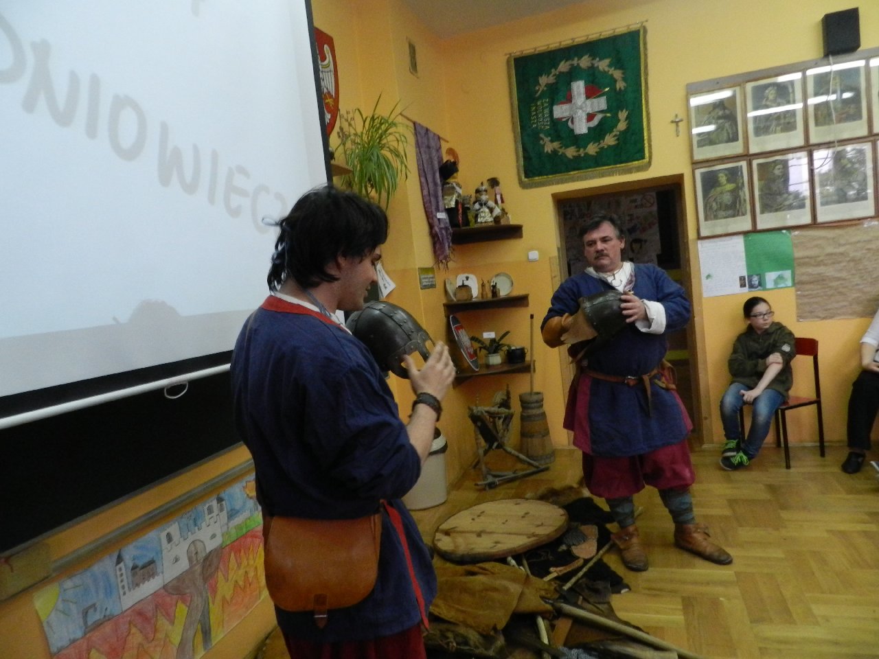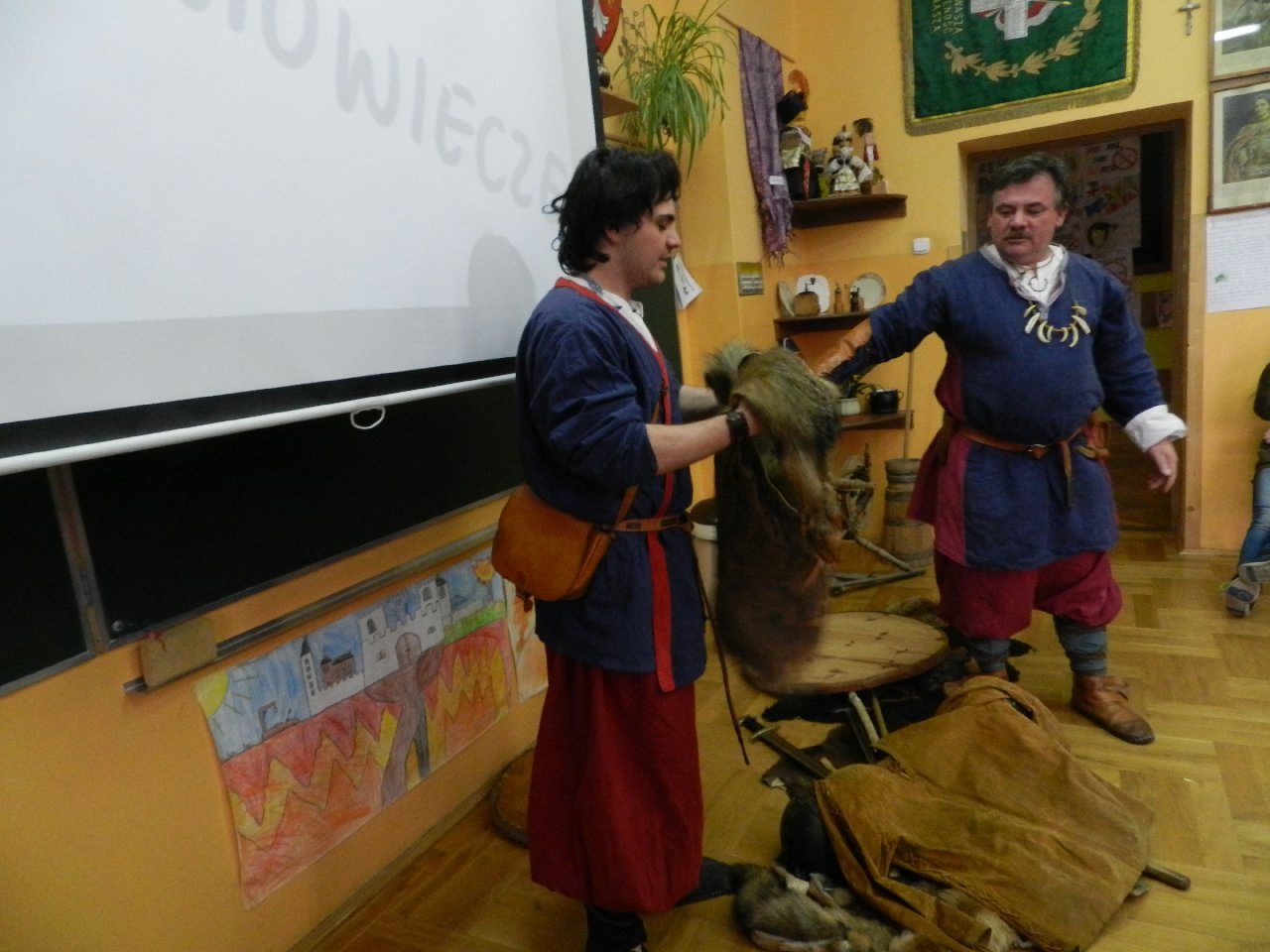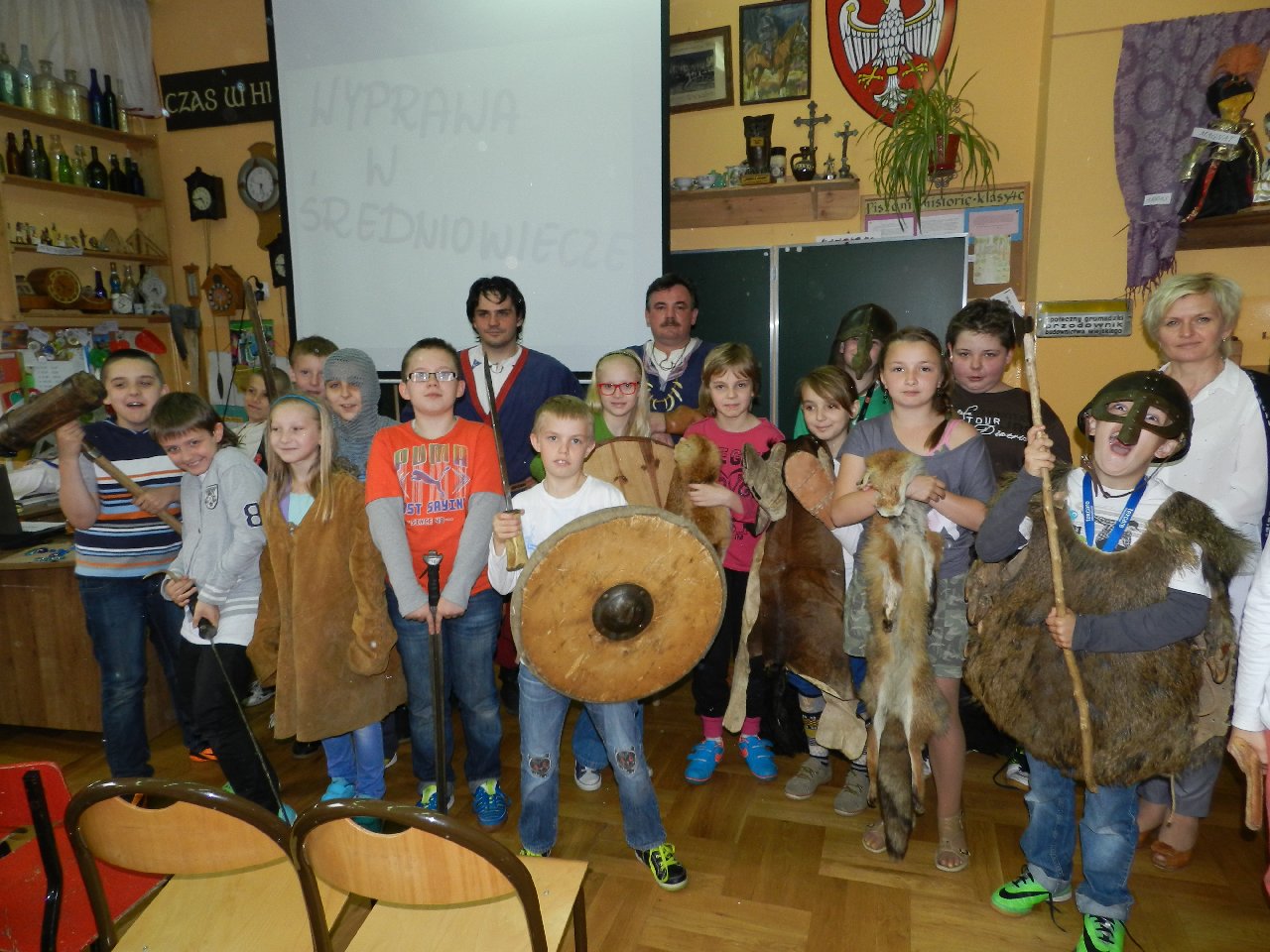 Wyprawa do średniowiecza to temat lekcji historii, która odbyła się w naszej szkole przy udziale Witolda i Mateusza Moszczyńskich, przedstawicieli Zgromadzenia Wojów i Rycerzy Grodu Tur. Uczniowie mogli przenieść się w średniowiecze i poczuć atmosferę tamtych czasów. A wszystko dzięki gościom przebranych w stroje kupców, którzy z detalami opowiadali o życiu codziennym w średniowieczu. Prezentowali ubrania, opisując, w jaki sposób powstawały. Pokazywali przedmioty codziennego użytku, wskazując na niektóre jako dawne środki płatnicze.