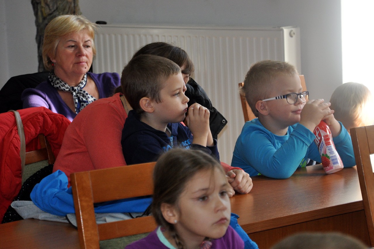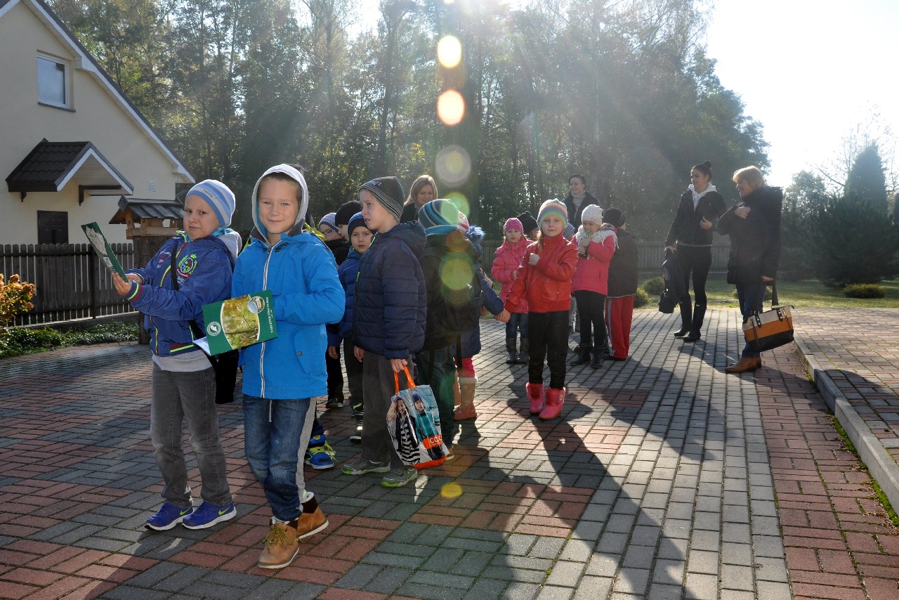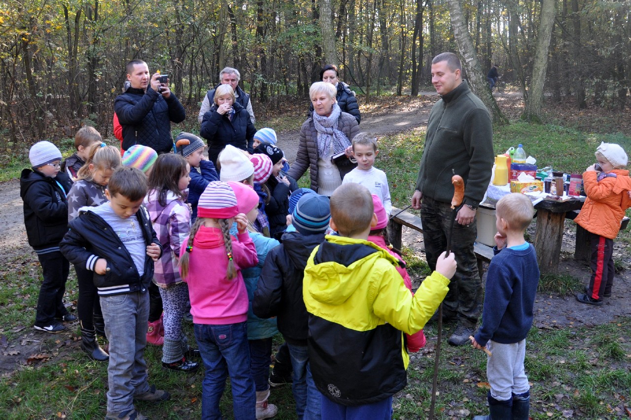 dzieciom fascynujący świat roślin i zwierząt leśnych. Wszyscy byli pod ogromnym wrażeniem - kiedy oglądając film o lesie - słuchali również odgłosów leśnej zwierzyny. Następnie, spacerując leśnymi ścieżkami, dzieci szukały darów jesieni, obserwowały ptaki przez lornetkę, rozpoznawały znane gatunki drzew i krzewów, które o tej porze roku są niezwykle malownicze. Lupa z kolei pozwoliła na podglądanie maleńkich żuczków w ściółce leśnej, drobnych roślinek i obserwację kory drzew. Uczniowie świetnie bawili się też uczestnicząc w różnych konkursach wiedzy o lesie, oraz wesołych zabawach – z nagrodami. Największą jednak frajdą było samodzielne pieczenie kiełbasek w ognisku, przygotowanym przez rodziców. Kiełbaski smakowały wybornie, tak samo jak pieczony chlebek. Na zakończenie spotkania dzieci wręczyły Panu Leśniczemu podziękowanie za wspaniałą lekcję „żywej przyrody” oraz drobny upominek / wykonany przez Mamę naszego kolegi, za co bardzo Dziękujemy!/. kolei dzieci otrzymały książeczki – przewodniki po lesie, które wykorzystają na zajęciach w szkole. Pełni wiedzy o lesie i niezapomnianych wrażeń dzieci – też pieszo - wróciły do szkoły.