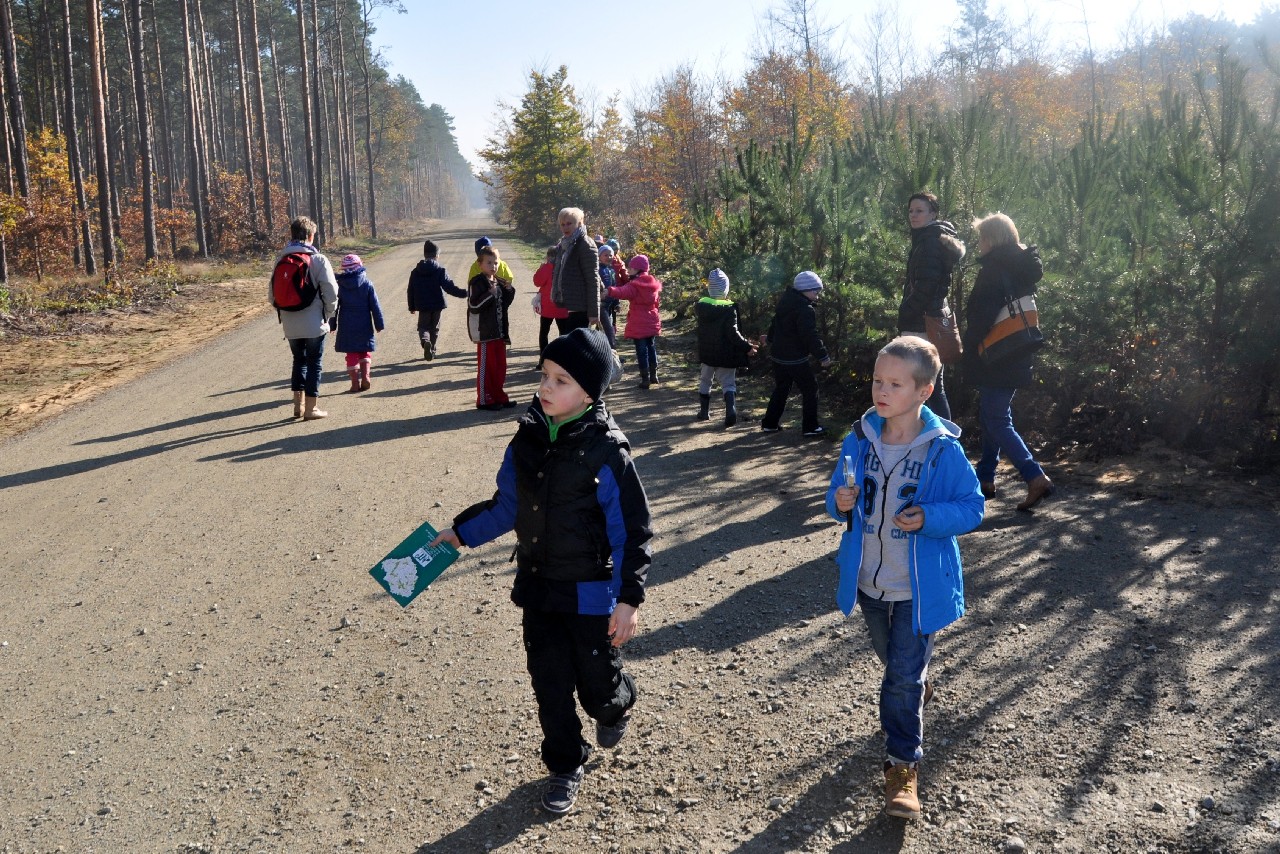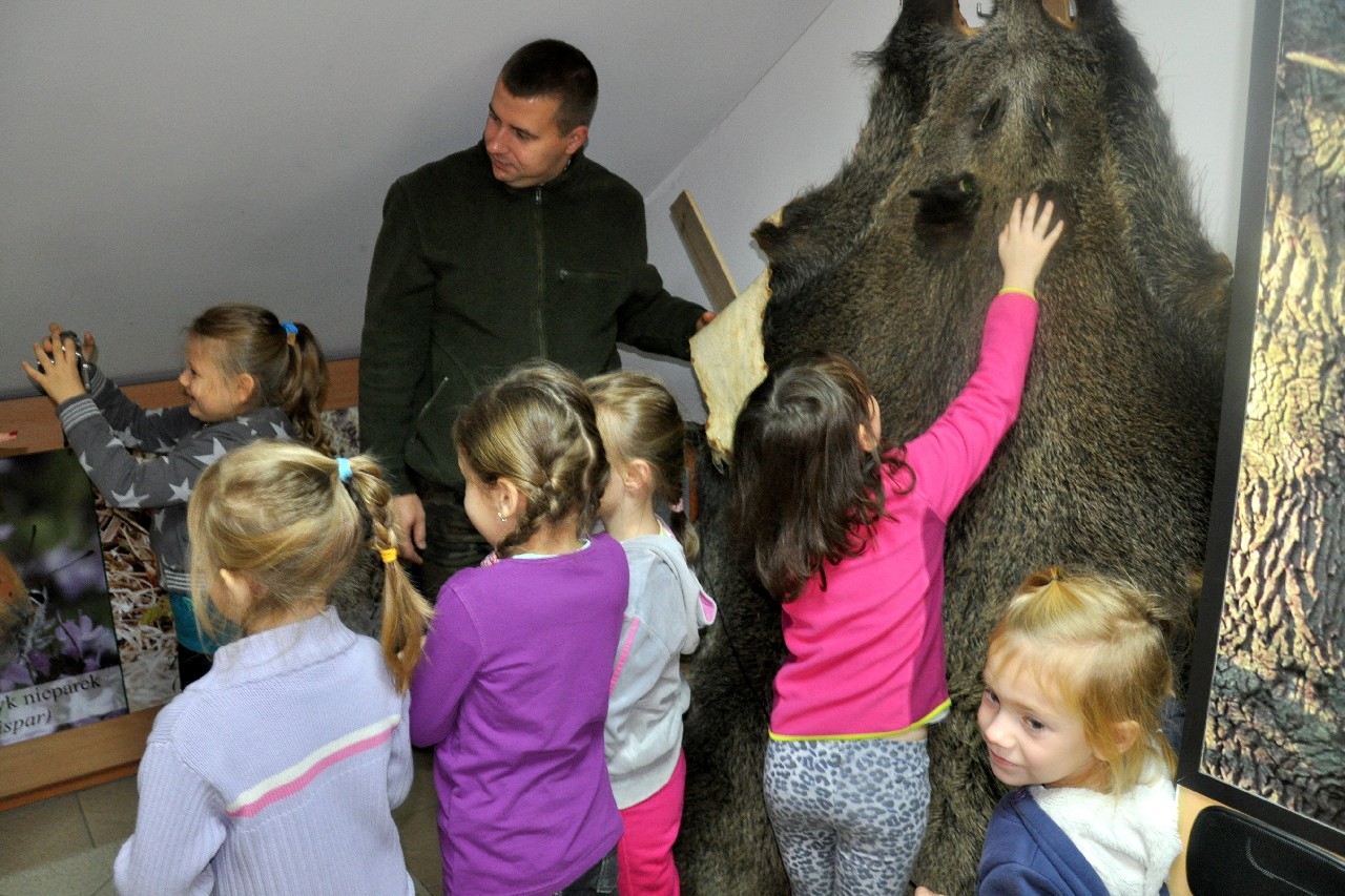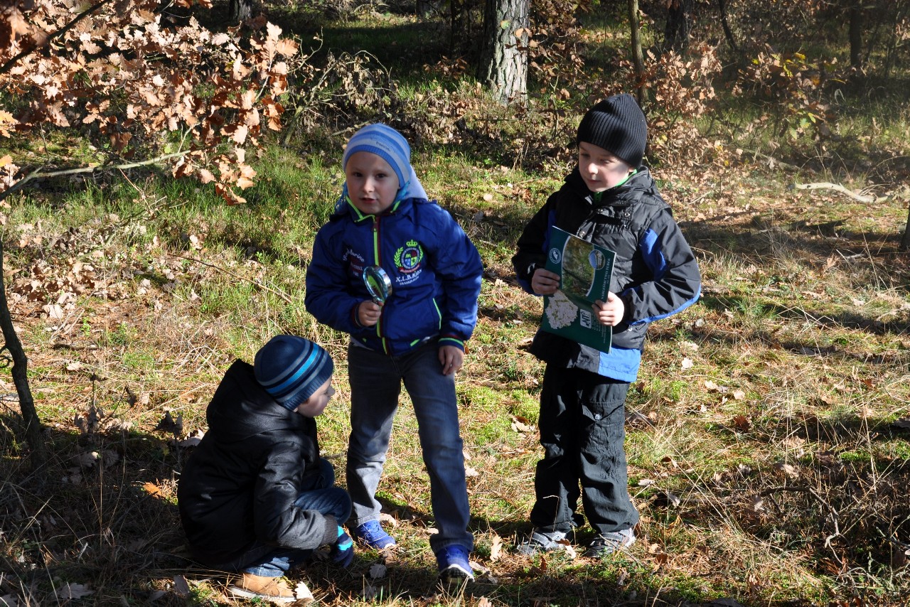 dzieciom fascynujący świat roślin i zwierząt leśnych. Wszyscy byli pod ogromnym wrażeniem - kiedy oglądając film o lesie - słuchali również odgłosów leśnej zwierzyny. Następnie, spacerując leśnymi ścieżkami, dzieci szukały darów jesieni, obserwowały ptaki przez lornetkę, rozpoznawały znane gatunki drzew i krzewów, które o tej porze roku są niezwykle malownicze. Lupa z kolei pozwoliła na podglądanie maleńkich żuczków w ściółce leśnej, drobnych roślinek i obserwację kory drzew. Uczniowie świetnie bawili się też uczestnicząc w różnych konkursach wiedzy o lesie, oraz wesołych zabawach – z nagrodami. Największą jednak frajdą było samodzielne pieczenie kiełbasek w ognisku, przygotowanym przez rodziców. Kiełbaski smakowały wybornie, tak samo jak pieczony chlebek. Na zakończenie spotkania dzieci wręczyły Panu Leśniczemu podziękowanie za wspaniałą lekcję „żywej przyrody” oraz drobny upominek / wykonany przez Mamę naszego kolegi, za co bardzo Dziękujemy!/. kolei dzieci otrzymały książeczki – przewodniki po lesie, które wykorzystają na zajęciach w szkole. Pełni wiedzy o lesie i niezapomnianych wrażeń dzieci – też pieszo - wróciły do szkoły.