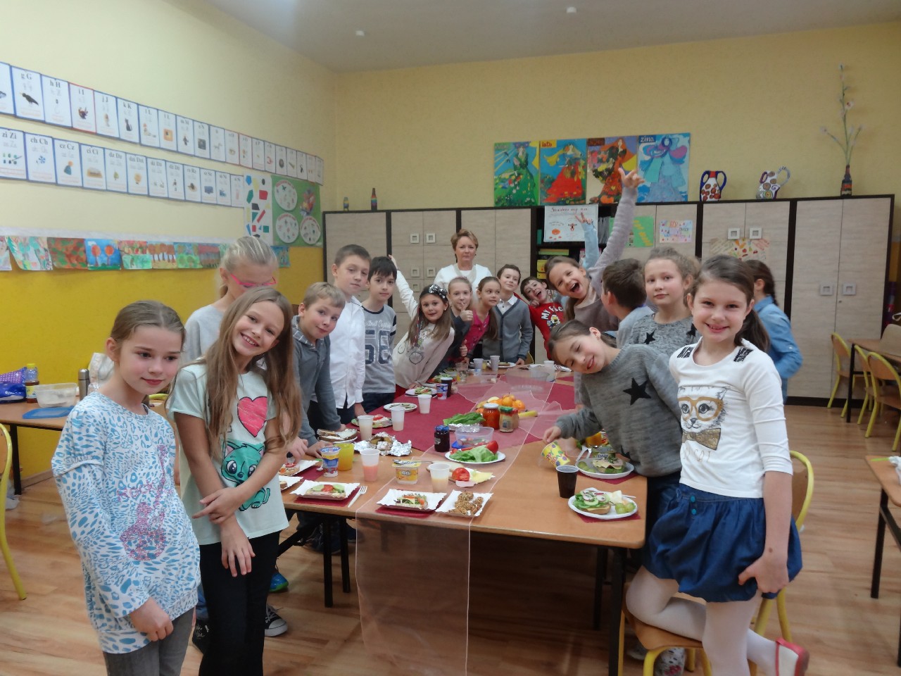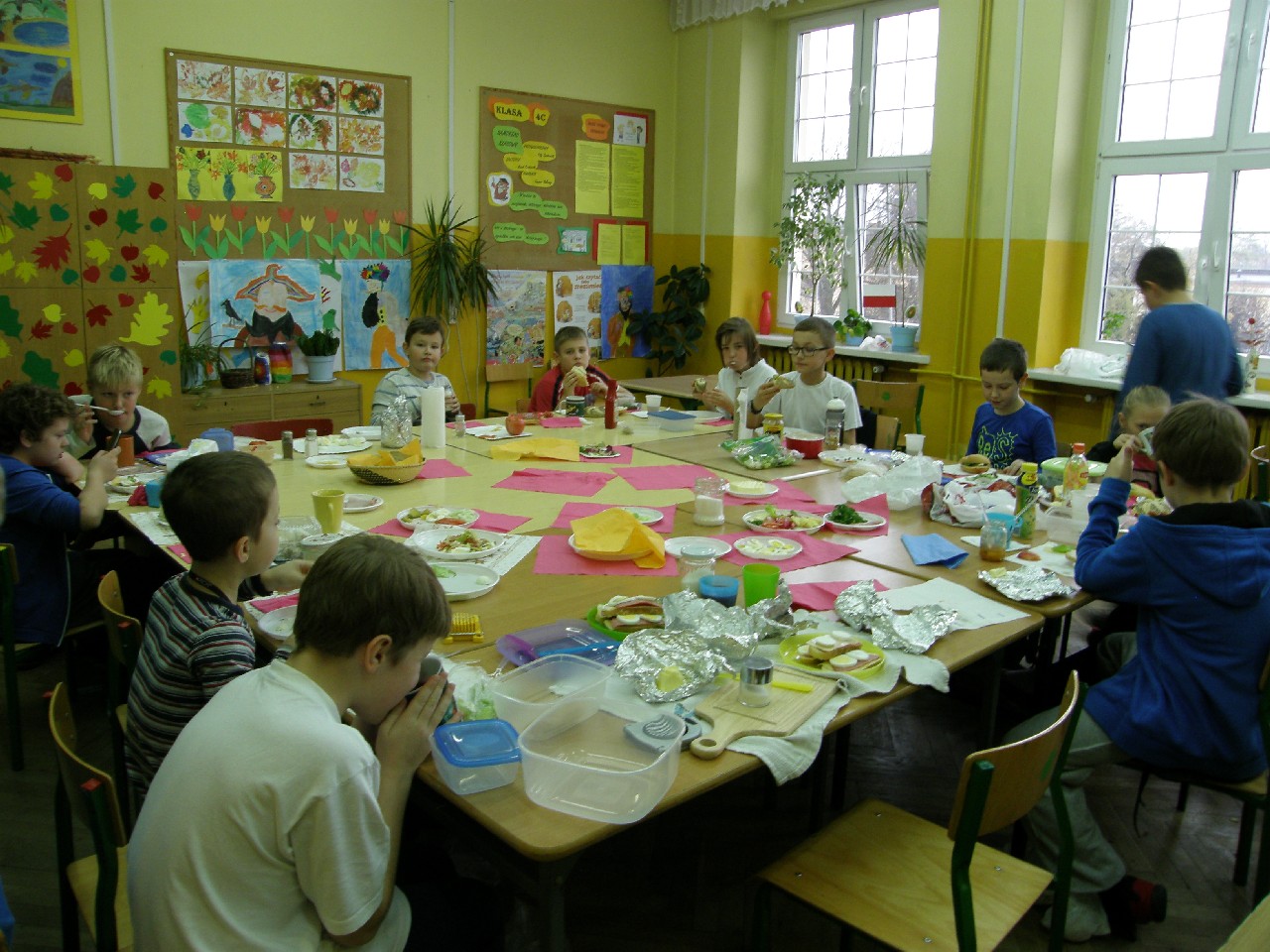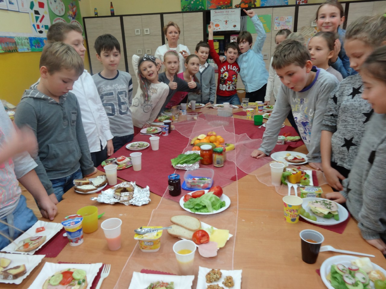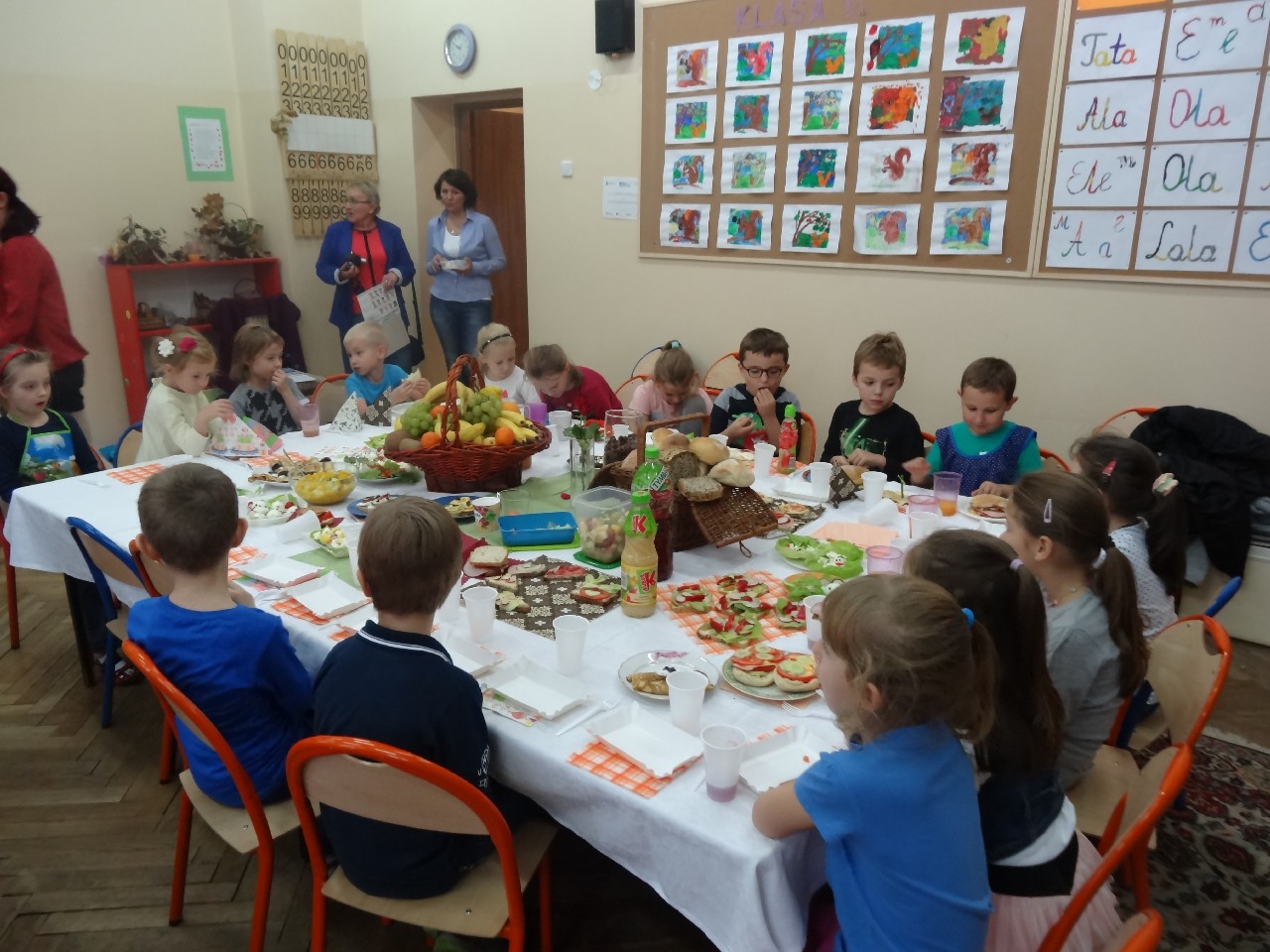 Podzieleni na grupy przyrządziliśmy pełnoziarnisty chleb z warzywami takimi jak: pomidory, sałata, rzodkiewki oraz szczypiorek. Dodaliśmy również jajka, twarożek, ser, a także wędlinę. Najważniejsze, żeby było zdrowo! Uczennice: Weronika Dziamara i Agata Drabina przeczytały fraszkę Jana Kochanowskiego pt. Na zdrowie. Po 45 minutach przystroiliśmy stoły i udaliśmy się zobaczyć jakimi posiłkami zaskoczą nas inne klasy. Nie zawiedliśmy się, tam również było apetycznie. Po dzwonku wróciliśmy do swoich stolików i oczekiwaliśmy na komisję. Po jej wizycie skonsumowaliśmy kromki. Później rozwiązaliśmy krzyżówki, wykreślanki i zapisaliśmy przepisy na sałatki. Nasza sala wyglądała pięknie. Kolorowe obrusy, papierowe talerzyki, serwetki, aż cieszyły oczy. Następnie poszliśmy częstować innych uczniów, a przewodnicząca klasy wraz z członkinią Samorządu Uczniowskiego rozdały nauczycielom jabłka. Po jakimś czasie z żalem serca musieliśmy schować kanapki, sprzątnąć stoły i klasę oraz udać się na kolejną lekcję. Wszystkim nam się podobało, a posiłek bardzo smakował. Będziemy czekać na taką akcję za rok. Jest to wspaniały pomysł zachęcać uczniów, zarówno małych jak i dużych do zdrowego stylu życia.