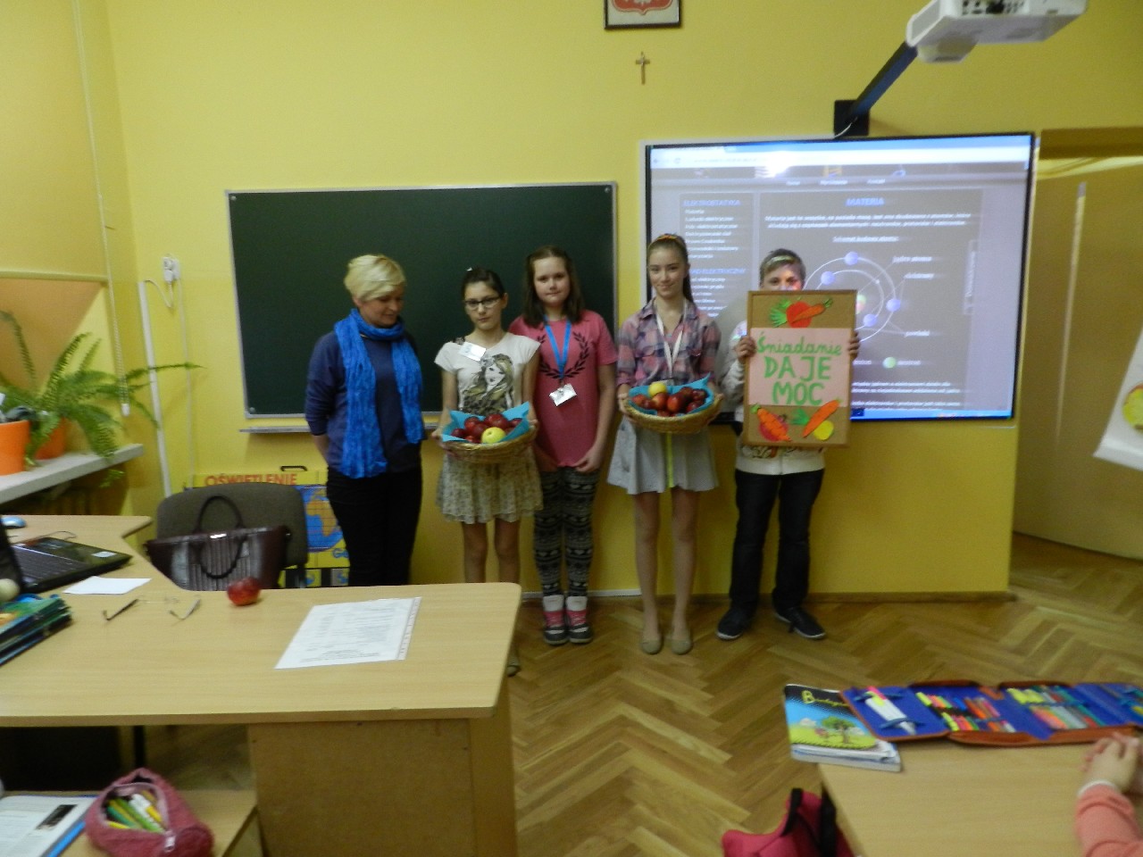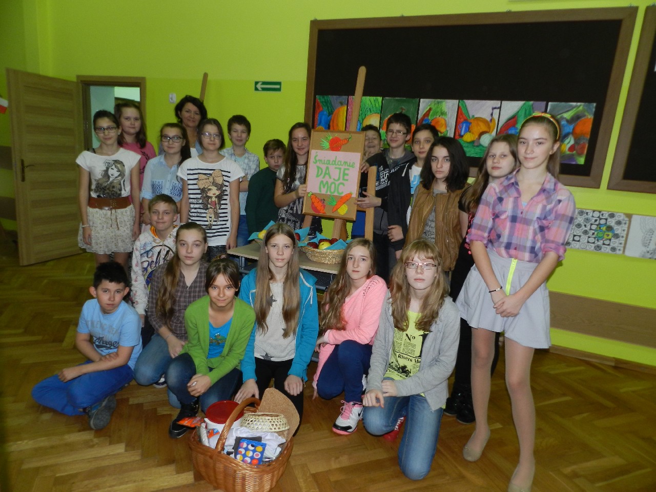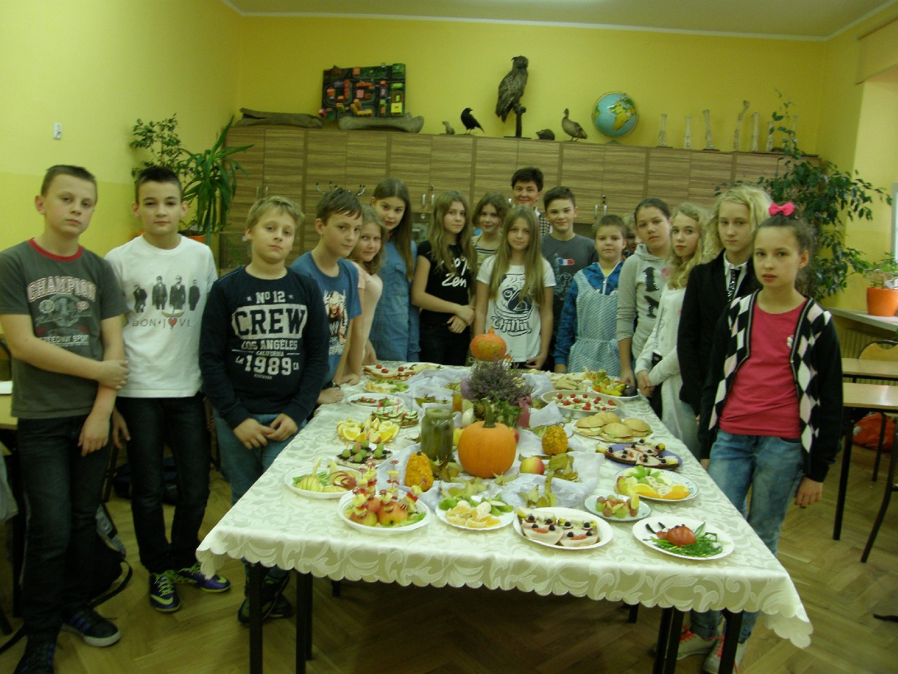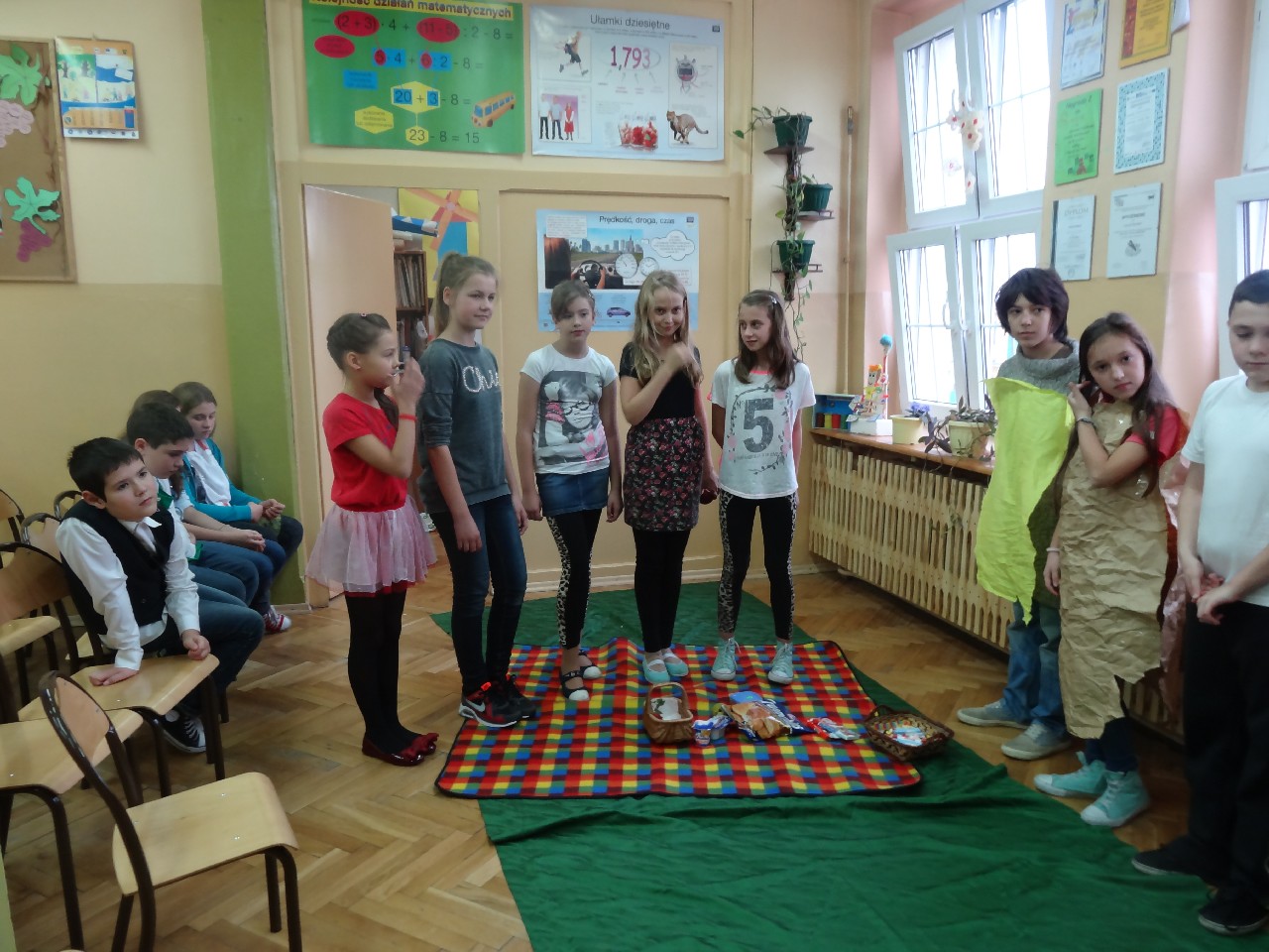 Podzieleni na grupy przyrządziliśmy pełnoziarnisty chleb z warzywami takimi jak: pomidory, sałata, rzodkiewki oraz szczypiorek. Dodaliśmy również jajka, twarożek, ser, a także wędlinę. Najważniejsze, żeby było zdrowo! Uczennice: Weronika Dziamara i Agata Drabina przeczytały fraszkę Jana Kochanowskiego pt. Na zdrowie. Po 45 minutach przystroiliśmy stoły i udaliśmy się zobaczyć jakimi posiłkami zaskoczą nas inne klasy. Nie zawiedliśmy się, tam również było apetycznie. Po dzwonku wróciliśmy do swoich stolików i oczekiwaliśmy na komisję. Po jej wizycie skonsumowaliśmy kromki. Później rozwiązaliśmy krzyżówki, wykreślanki i zapisaliśmy przepisy na sałatki. Nasza sala wyglądała pięknie. Kolorowe obrusy, papierowe talerzyki, serwetki, aż cieszyły oczy. Następnie poszliśmy częstować innych uczniów, a przewodnicząca klasy wraz z członkinią Samorządu Uczniowskiego rozdały nauczycielom jabłka. Po jakimś czasie z żalem serca musieliśmy schować kanapki, sprzątnąć stoły i klasę oraz udać się na kolejną lekcję. Wszystkim nam się podobało, a posiłek bardzo smakował. Będziemy czekać na taką akcję za rok. Jest to wspaniały pomysł zachęcać uczniów, zarówno małych jak i dużych do zdrowego stylu życia.