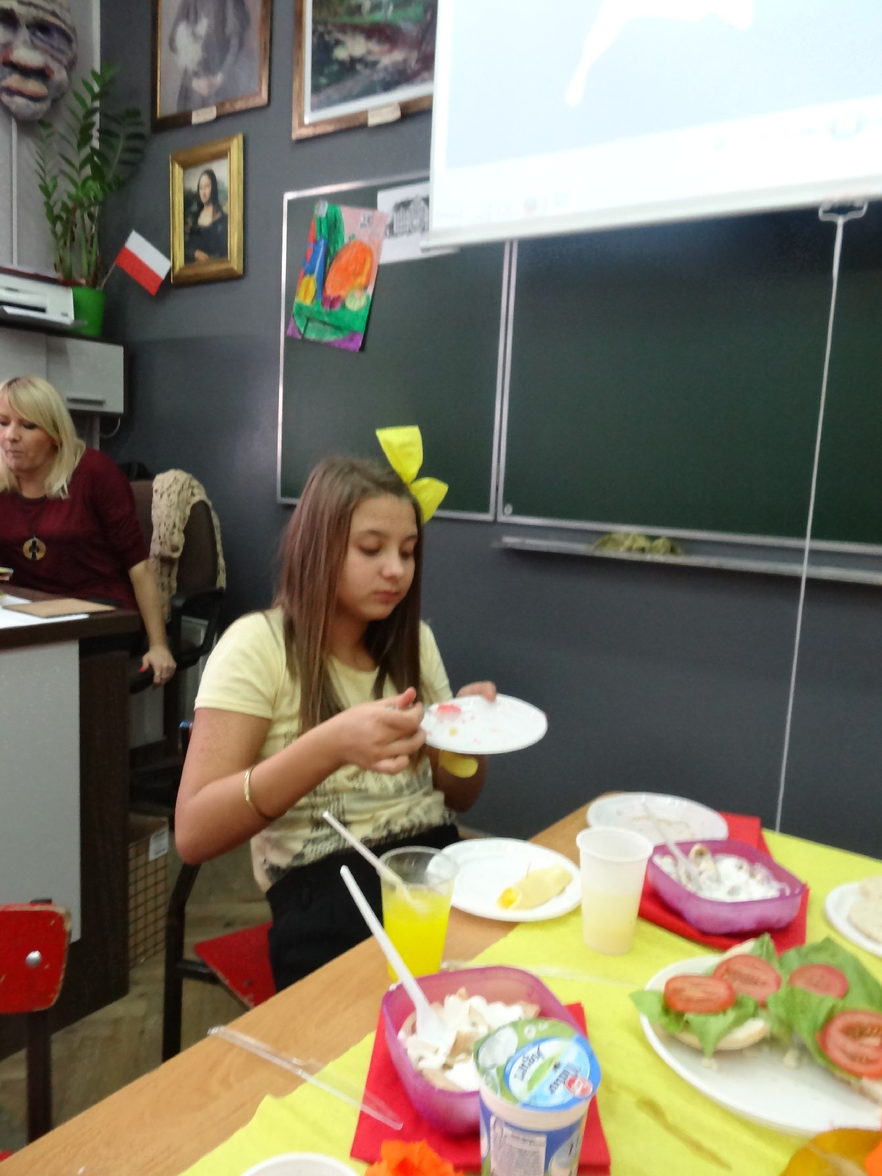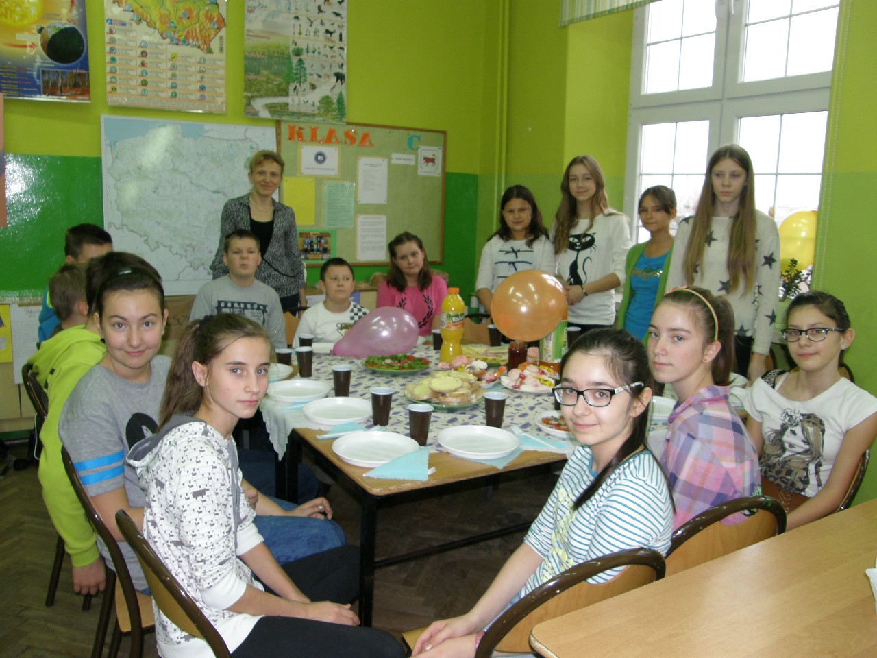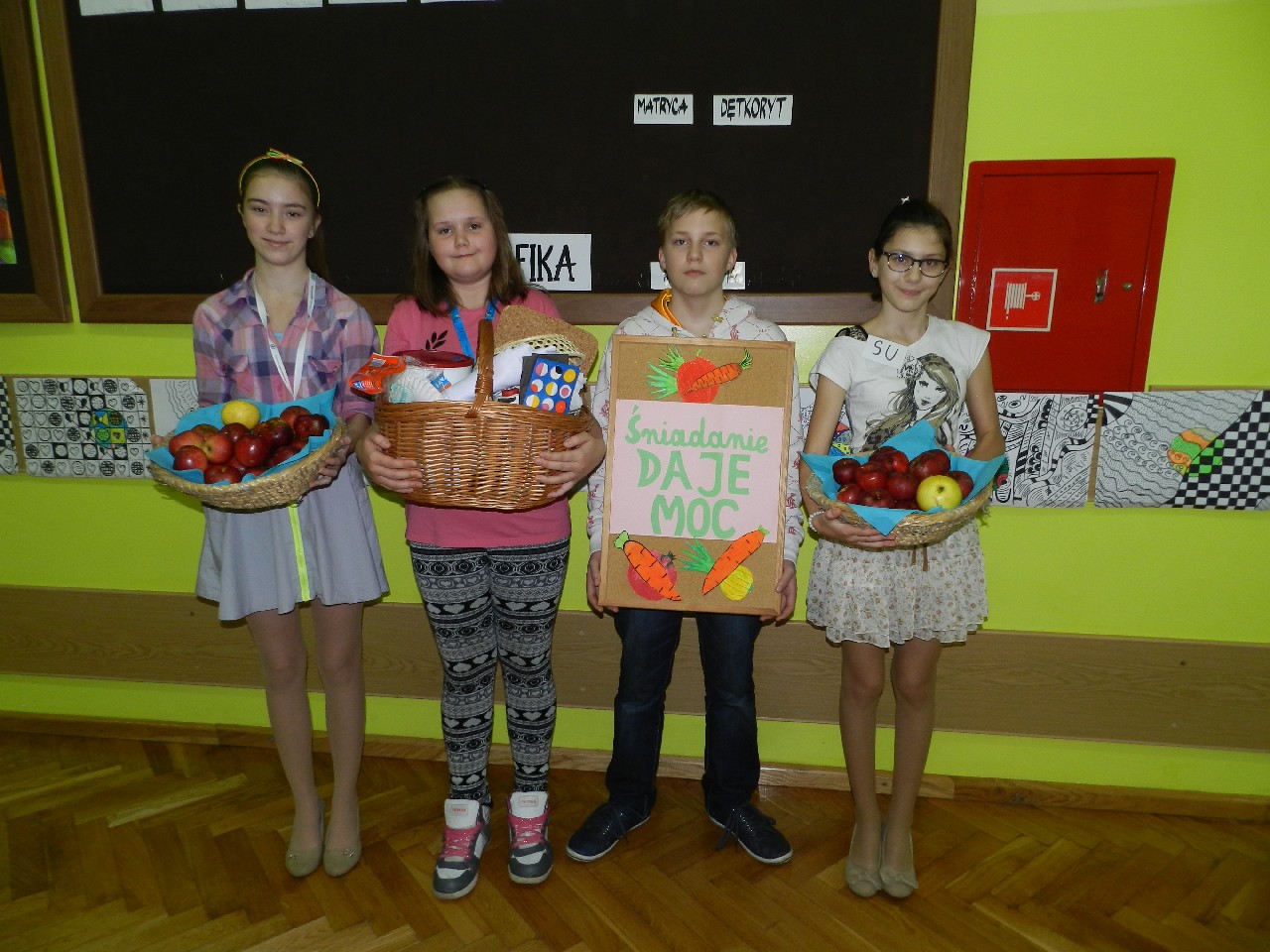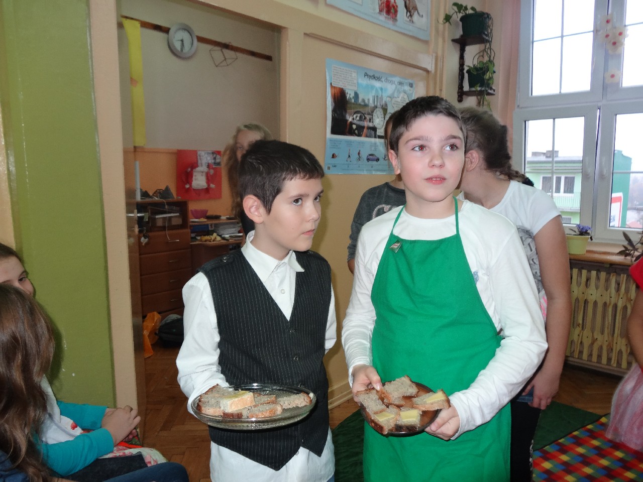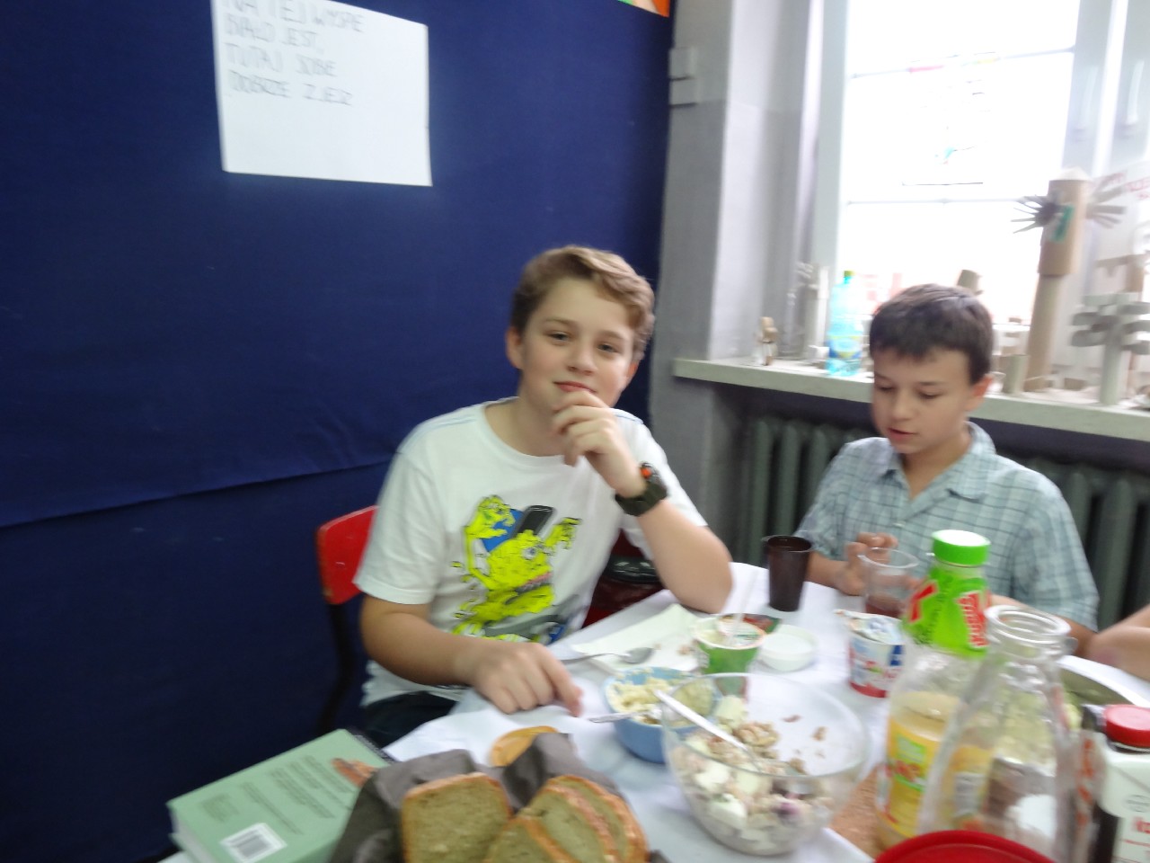 Podzieleni na grupy przyrządziliśmy pełnoziarnisty chleb z warzywami takimi jak: pomidory, sałata, rzodkiewki oraz szczypiorek. Dodaliśmy również jajka, twarożek, ser, a także wędlinę. Najważniejsze, żeby było zdrowo! Uczennice: Weronika Dziamara i Agata Drabina przeczytały fraszkę Jana Kochanowskiego pt. Na zdrowie. Po 45 minutach przystroiliśmy stoły i udaliśmy się zobaczyć jakimi posiłkami zaskoczą nas inne klasy. Nie zawiedliśmy się, tam również było apetycznie. Po dzwonku wróciliśmy do swoich stolików i oczekiwaliśmy na komisję. Po jej wizycie skonsumowaliśmy kromki. Później rozwiązaliśmy krzyżówki, wykreślanki i zapisaliśmy przepisy na sałatki. Nasza sala wyglądała pięknie. Kolorowe obrusy, papierowe talerzyki, serwetki, aż cieszyły oczy. Następnie poszliśmy częstować innych uczniów, a przewodnicząca klasy wraz z członkinią Samorządu Uczniowskiego rozdały nauczycielom jabłka. Po jakimś czasie z żalem serca musieliśmy schować kanapki, sprzątnąć stoły i klasę oraz udać się na kolejną lekcję. Wszystkim nam się podobało, a posiłek bardzo smakował. Będziemy czekać na taką akcję za rok. Jest to wspaniały pomysł zachęcać uczniów, zarówno małych jak i dużych do zdrowego stylu życia.