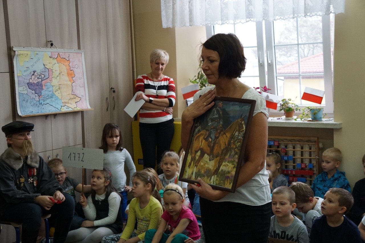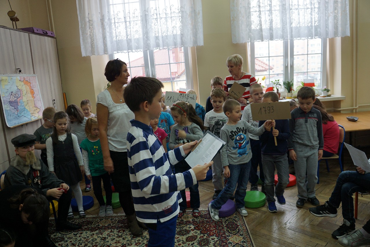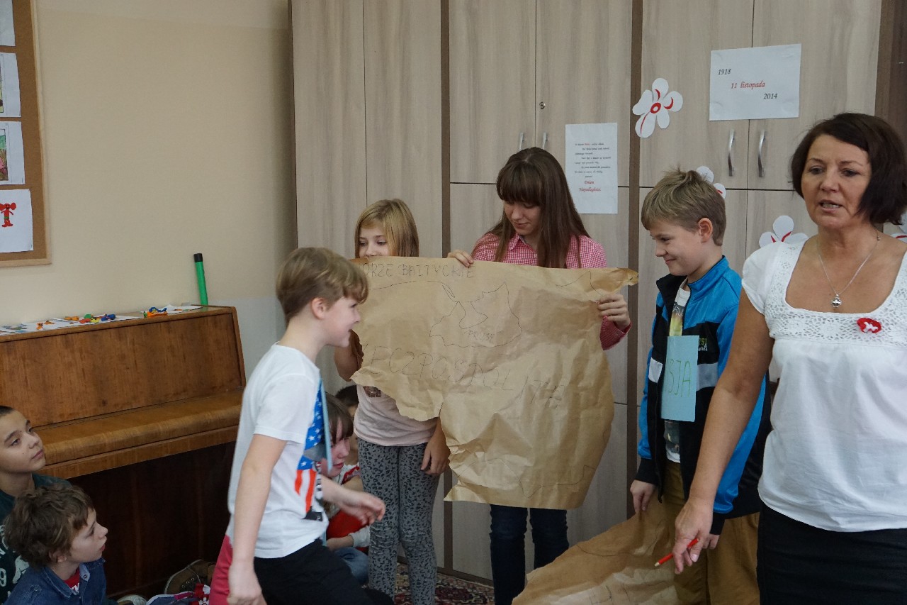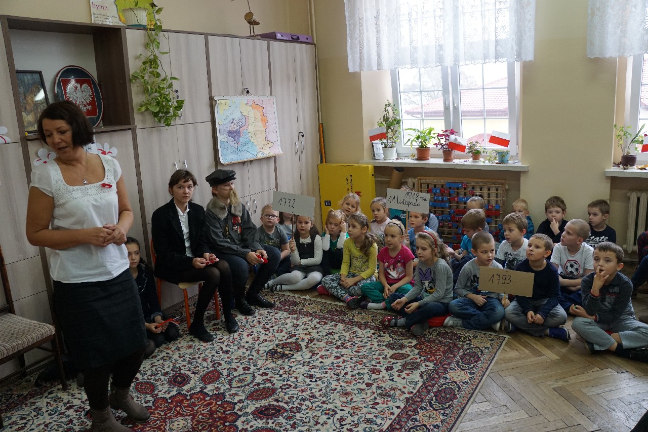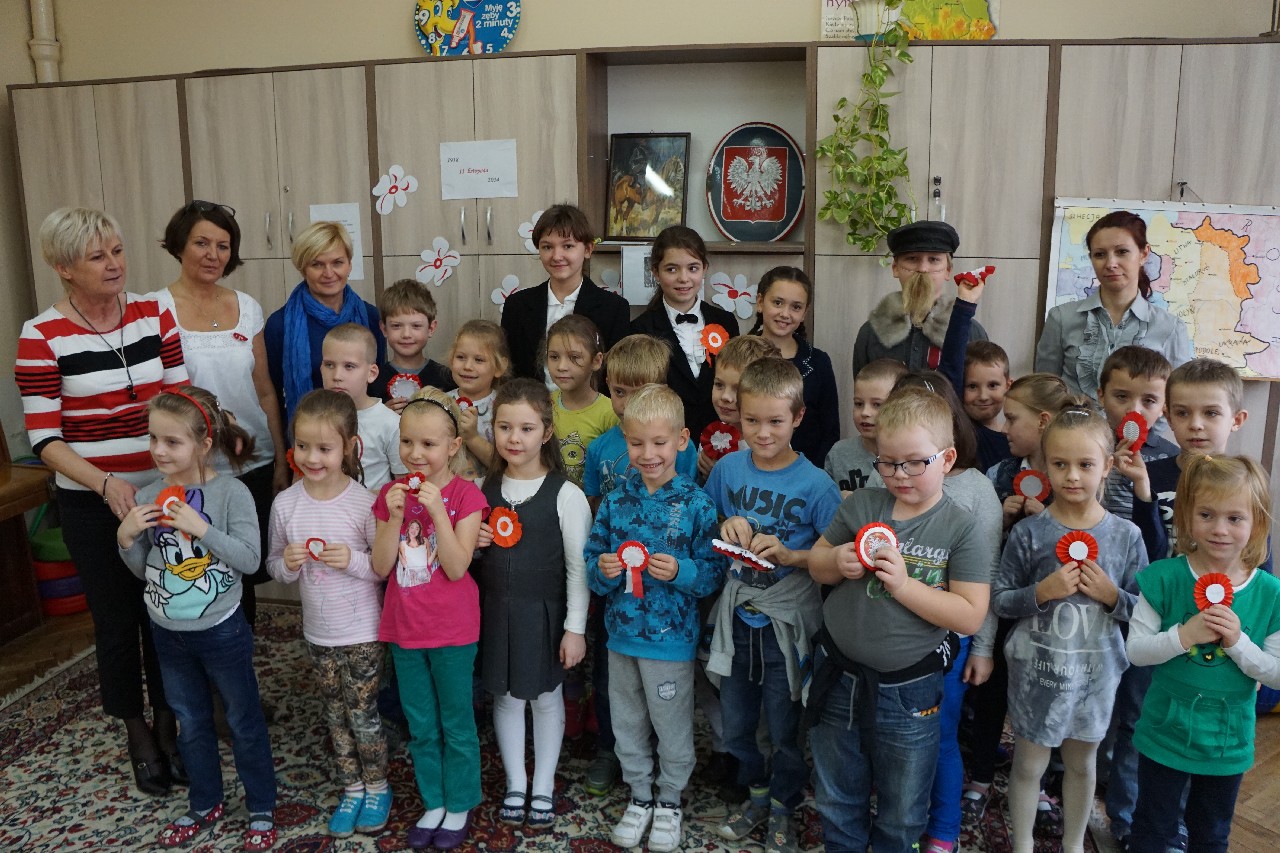 Dnia 12 listopada 2014 roku klasa 4d i 5e razem z panią Bożeną Mielczarek odwiedziły pierwszaków z klasy 1e, których opiekunem jest pani Elżbieta Frasunkiewicz. Celem spotkania było zapoznanie pierwszoklasistów ze znaczeniem Narodowego Święta Niepodległości, które obchodzimy 11 listopada. W wspólnych zajęciach uczestniczyły również pani wicedyrektor Krystyna Morek, pani Elżbieta Nowak i rodzice.