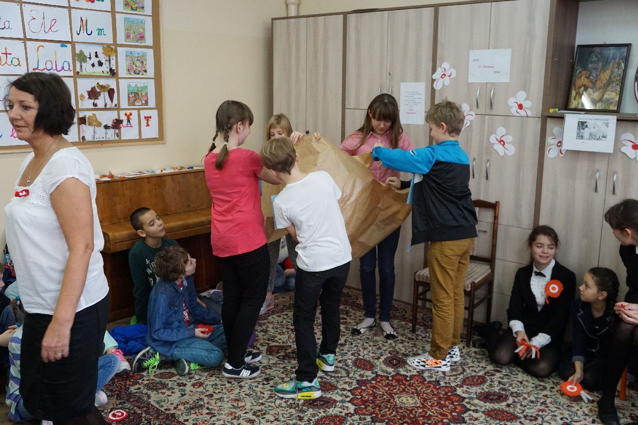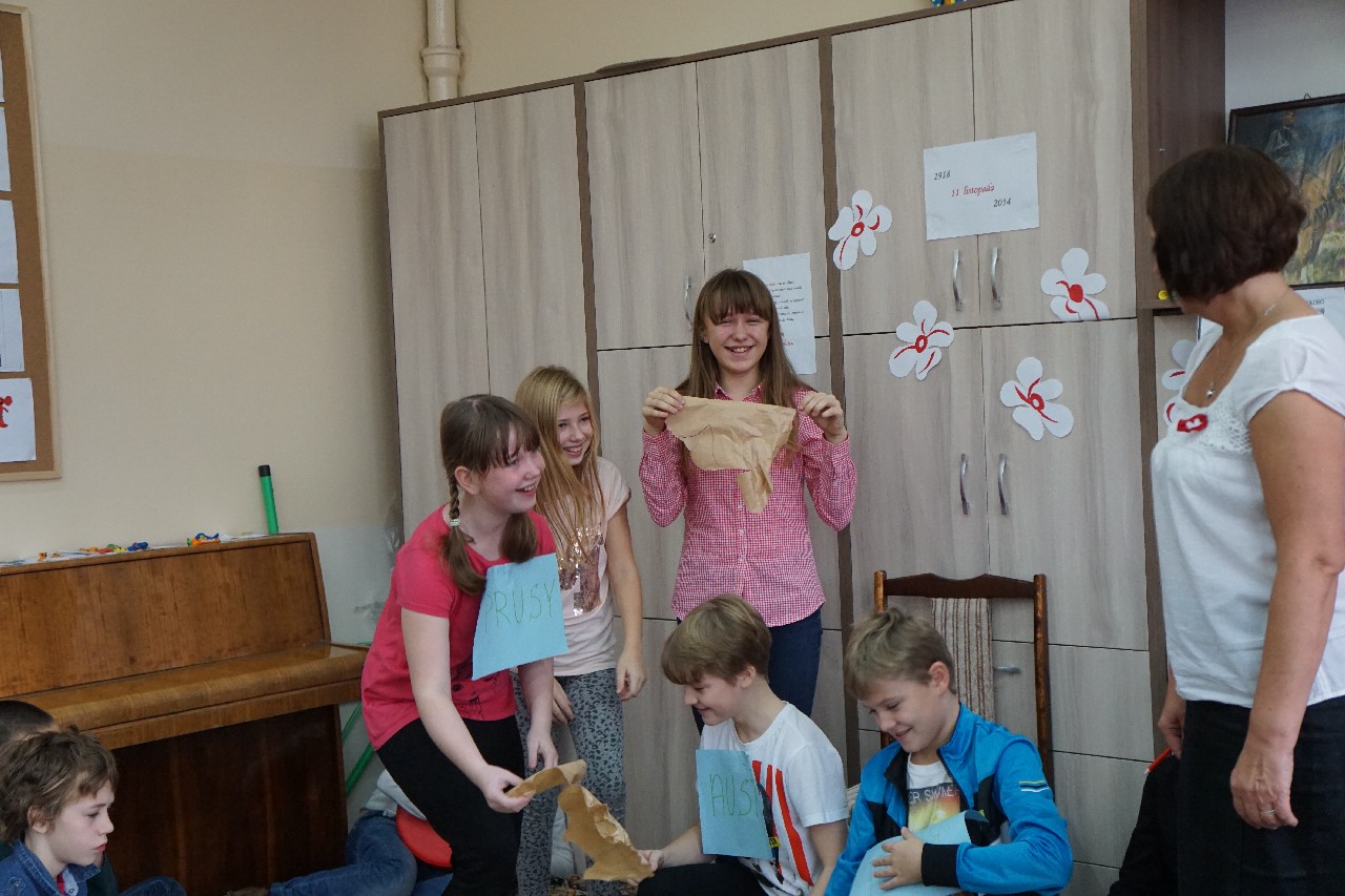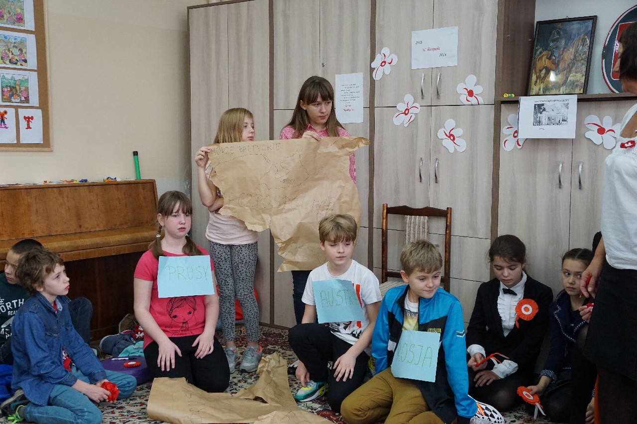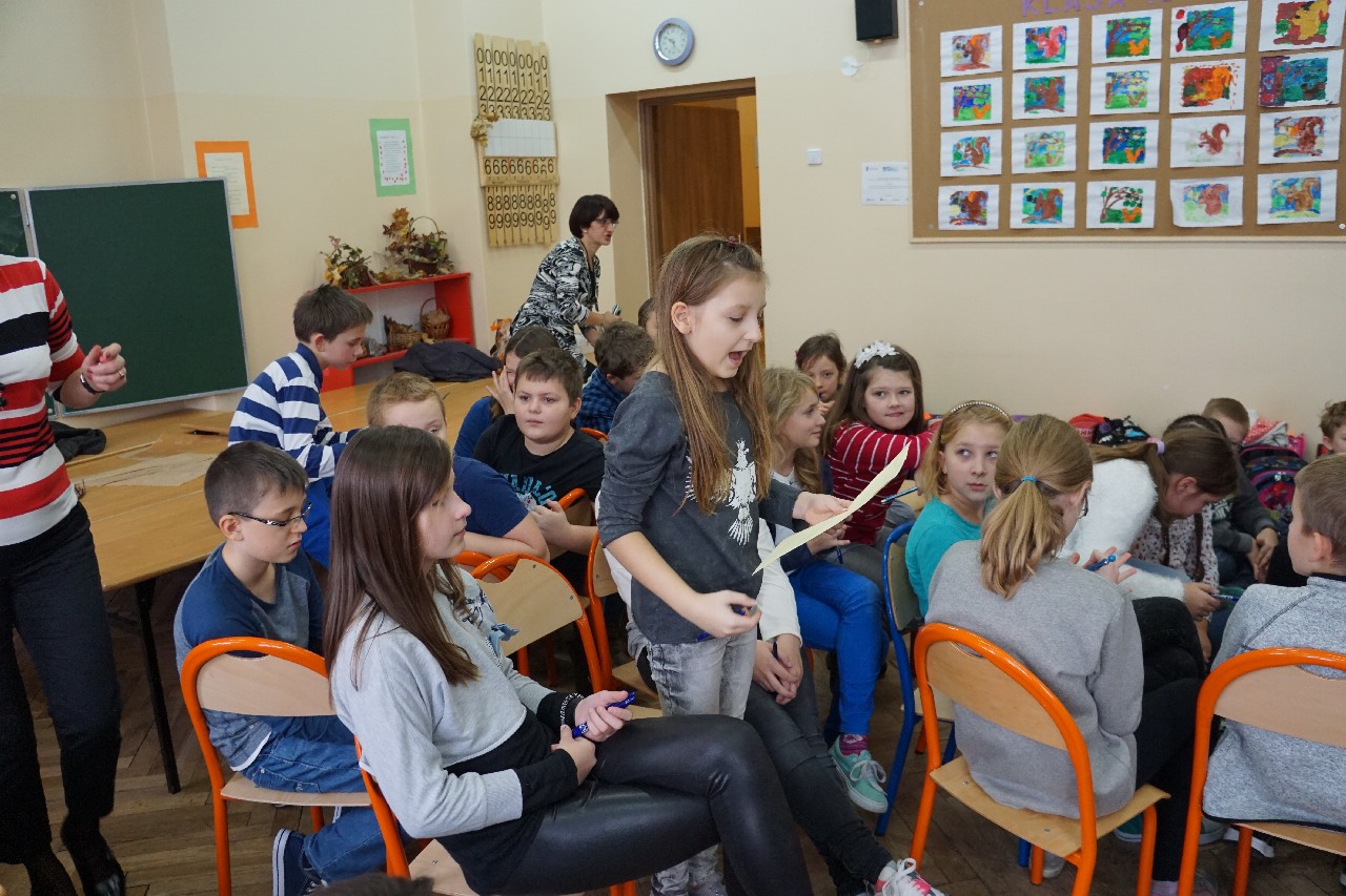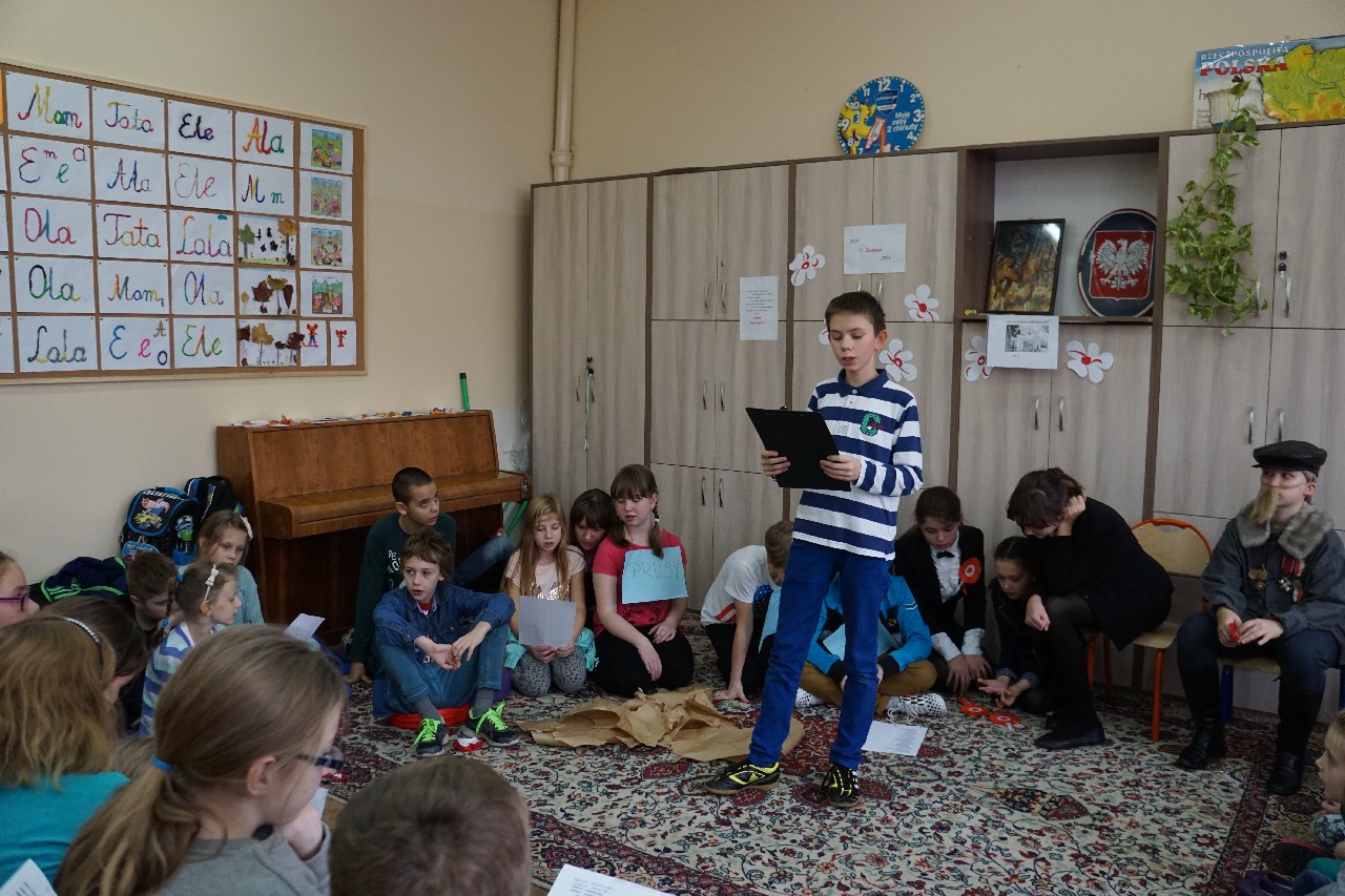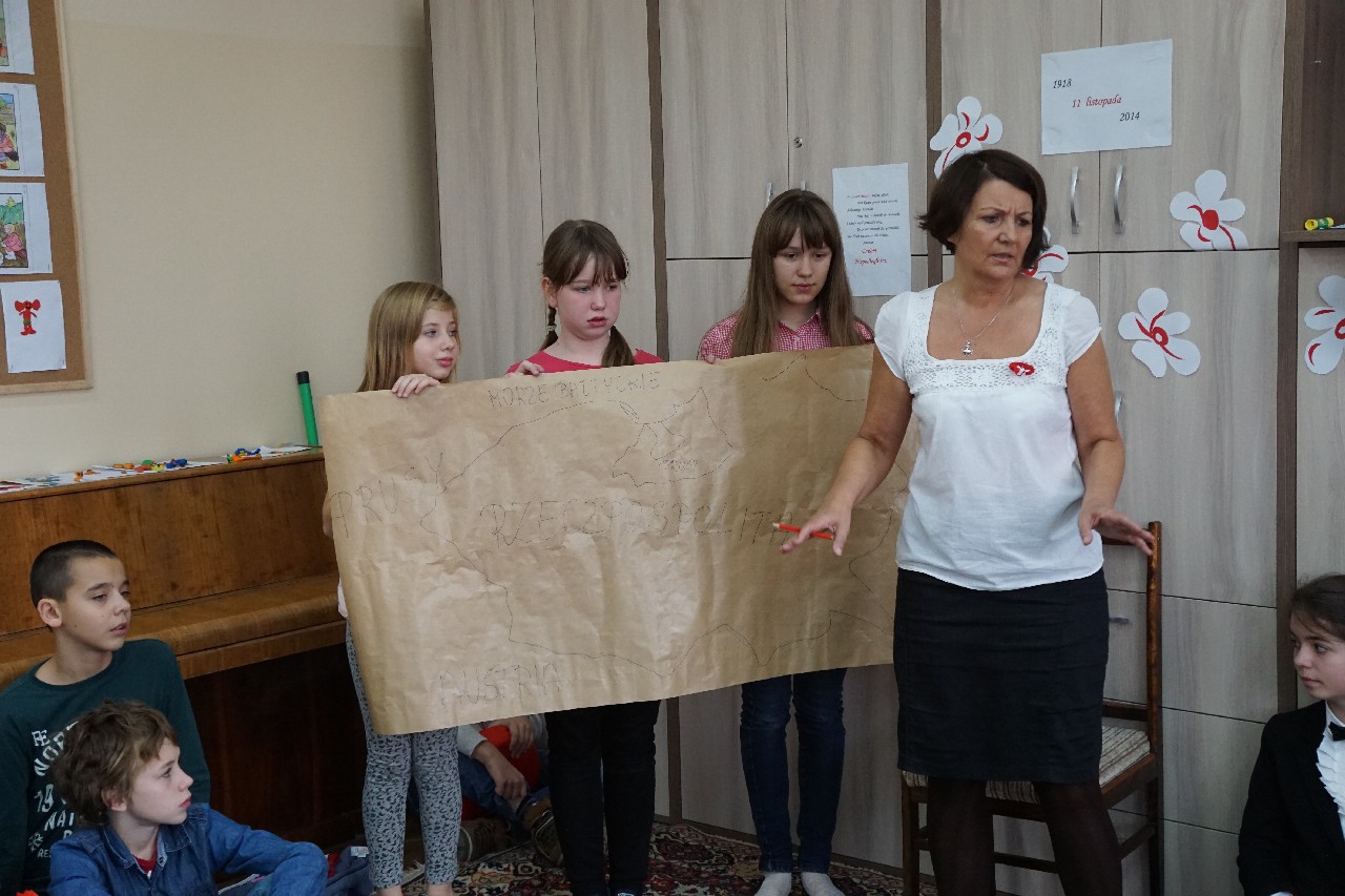 Dnia 12 listopada 2014 roku klasa 4d i 5e razem z panią Bożeną Mielczarek odwiedziły pierwszaków z klasy 1e, których opiekunem jest pani Elżbieta Frasunkiewicz. Celem spotkania było zapoznanie pierwszoklasistów ze znaczeniem Narodowego Święta Niepodległości, które obchodzimy 11 listopada. W wspólnych zajęciach uczestniczyły również pani wicedyrektor Krystyna Morek, pani Elżbieta Nowak i rodzice.