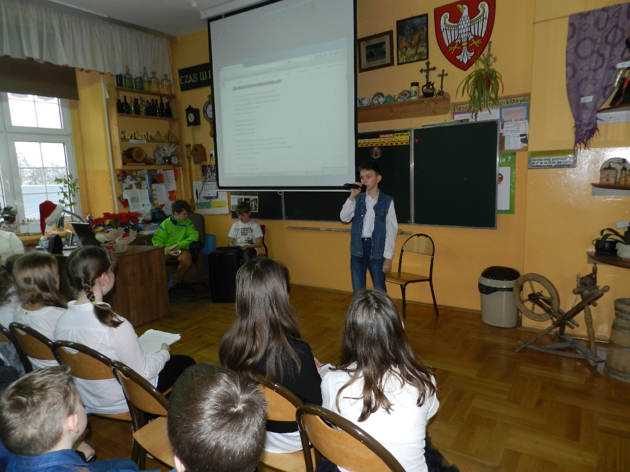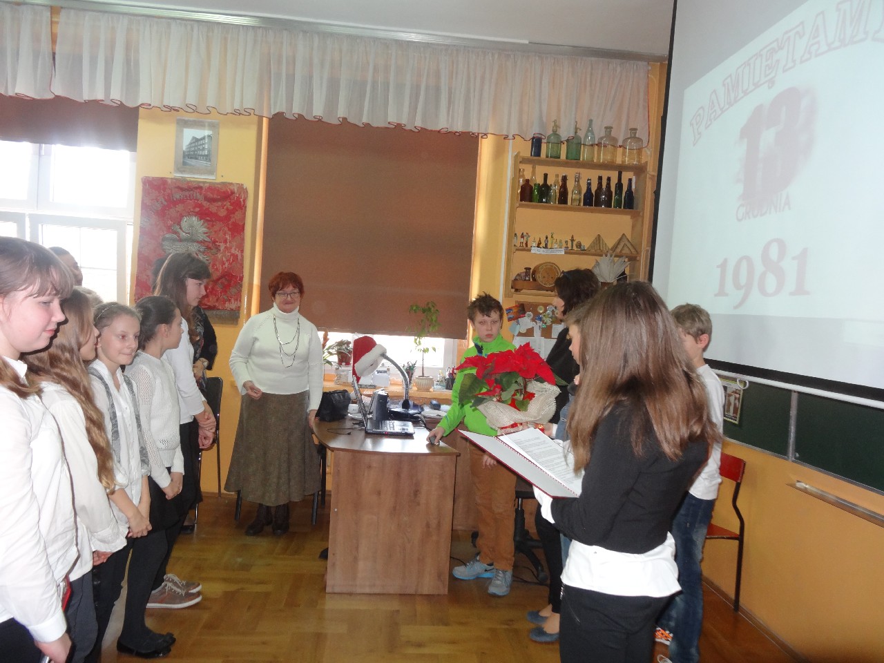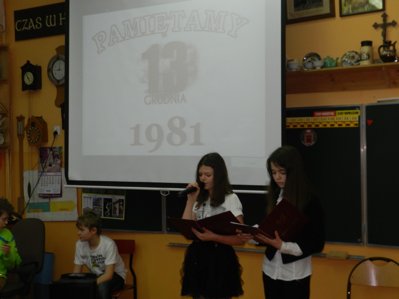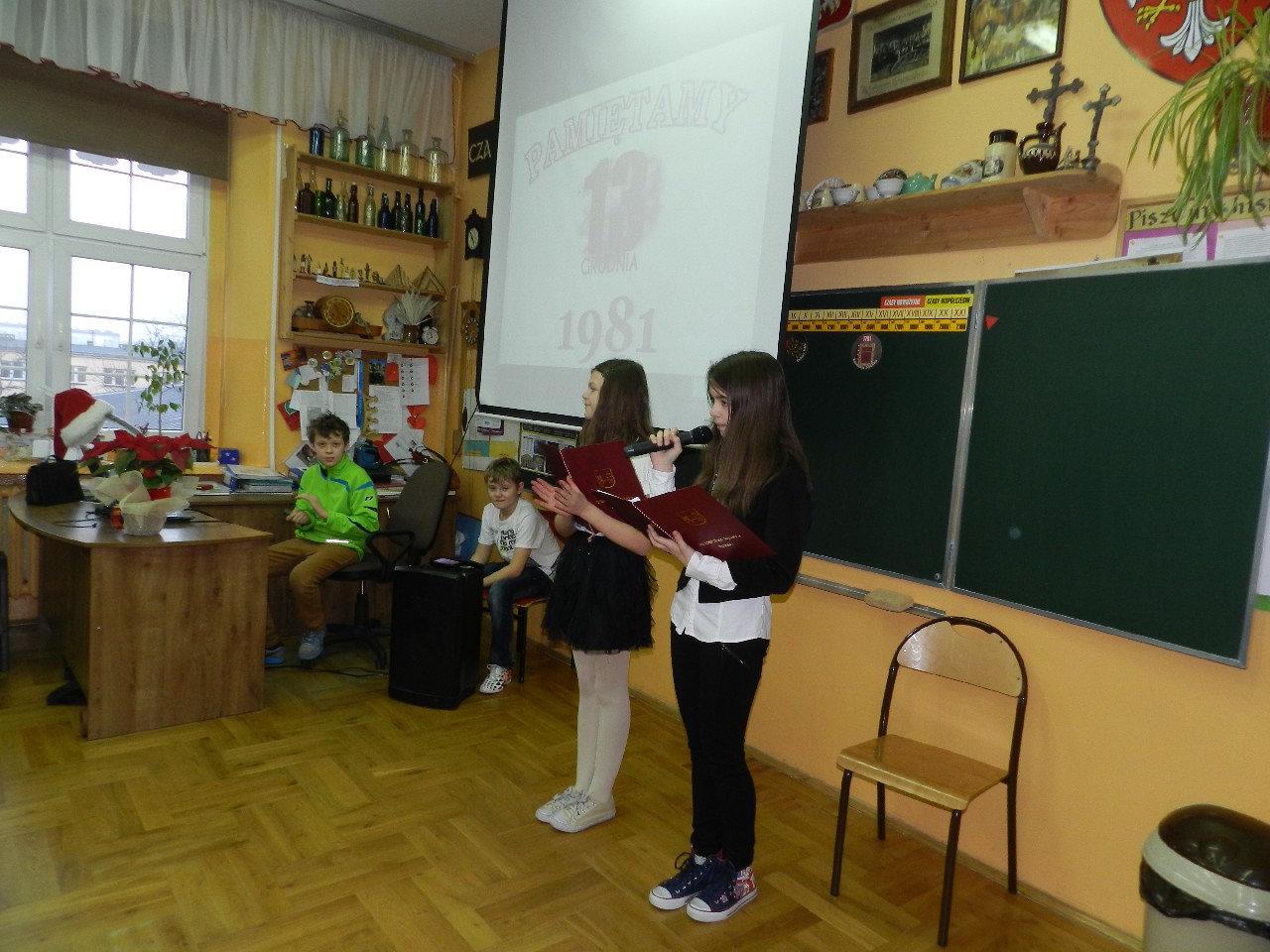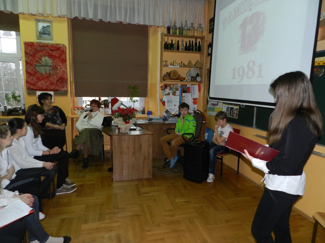 Dzięki naszej koleżance Weronice Dziamara poczuliśmy atmosferę dnia, w którym w Polsce wprowadzono stan wojenny. Nasza koleżanka, wcielając się w rolę swej rówieśniczki, bohaterki Pamiętnika z okresu stanu wojennego, przeczytała fragment pt.”Niedziela bez teleranka”13 grudnia 1981roku.