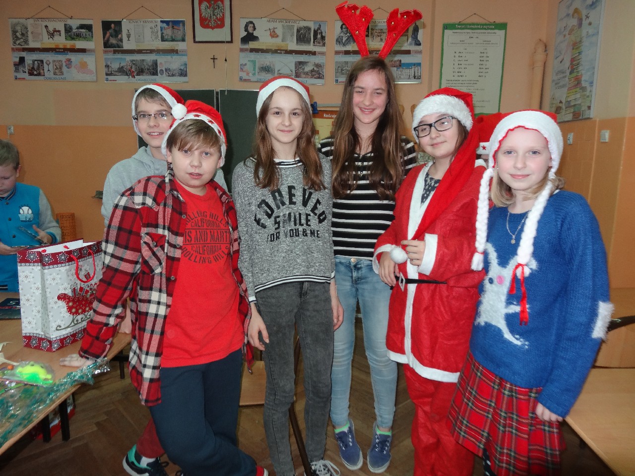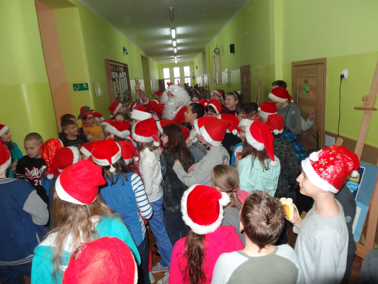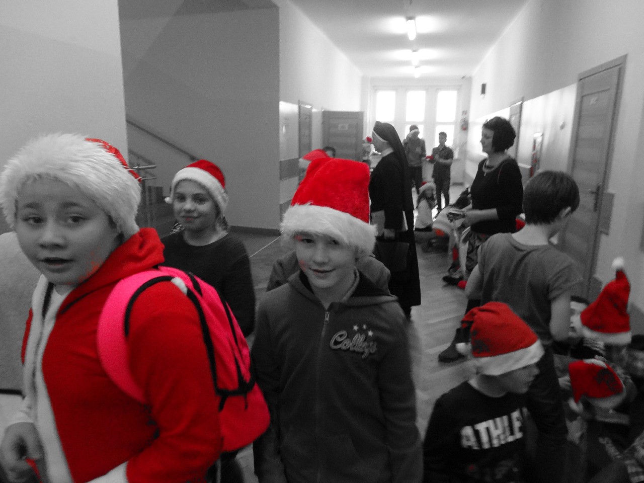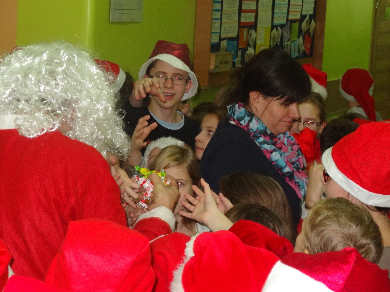 odwiedza nas prawdziwy Mikołaj z worem cukierków i rozdaje je uczniom, nie zważając, czy ktoś zasłużył bardziej czy mniej. O miłą atmosferę w tym dniu zadbali też uczniowie z sekcji rozrywki SU. Na przerwach można było posłuchać utworów wprowadzających nas w atmosferę nadchodzących świąt. W tym dniu mało kto nie posiadał czapki mikołajkowej, mieli je również nasi nauczyciele, co widać na wspólnej pamiątkowej fotografii.