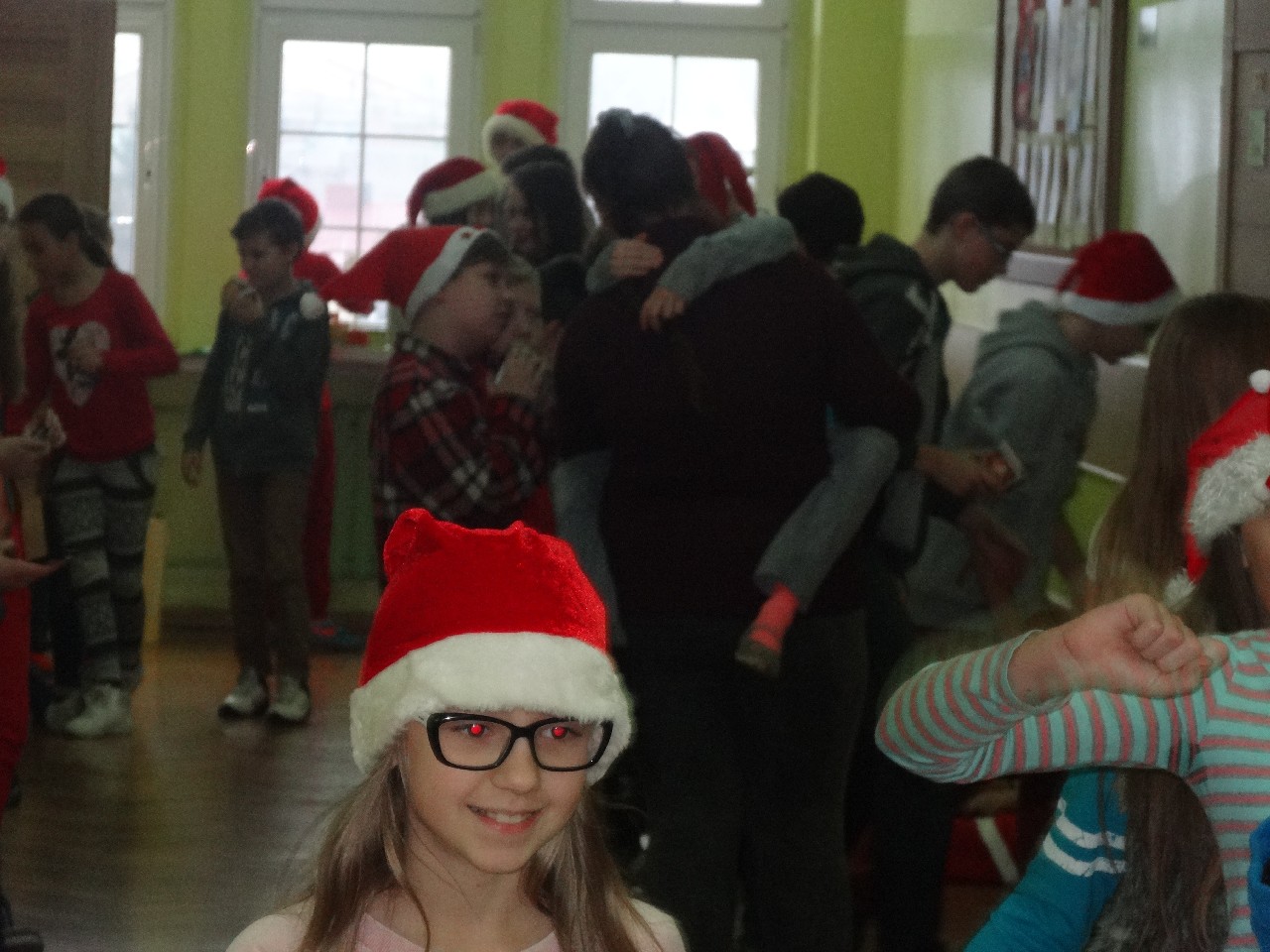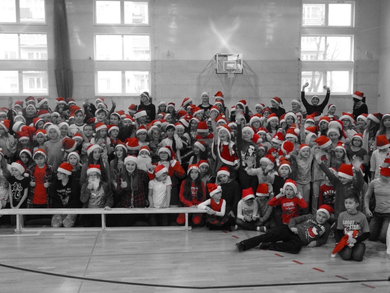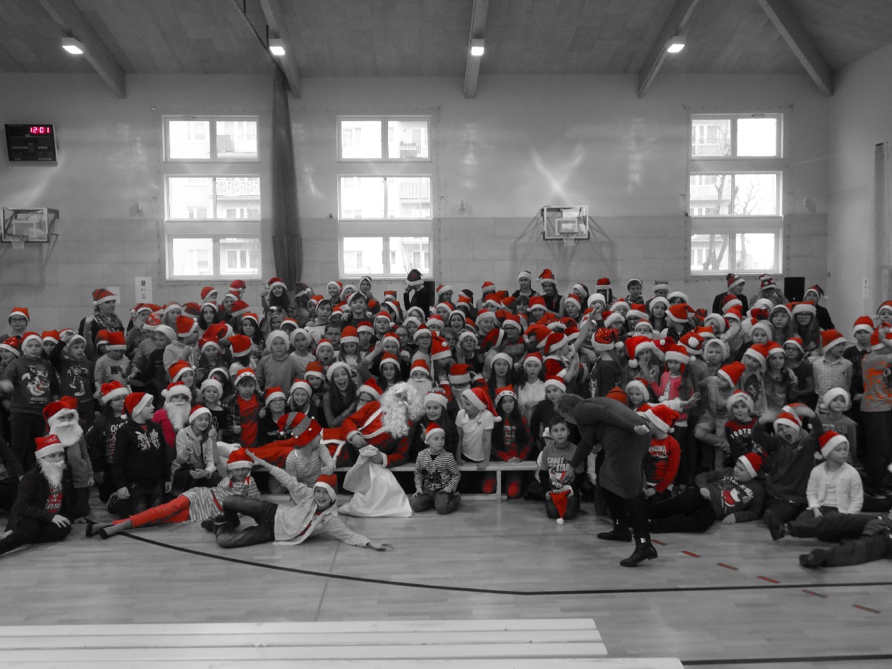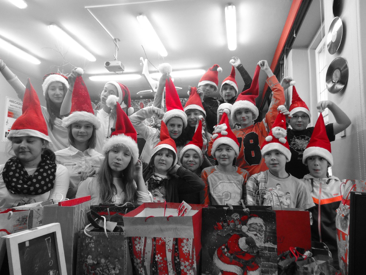 odwiedza nas prawdziwy Mikołaj z worem cukierków i rozdaje je uczniom, nie zważając, czy ktoś zasłużył bardziej czy mniej. O miłą atmosferę w tym dniu zadbali też uczniowie z sekcji rozrywki SU. Na przerwach można było posłuchać utworów wprowadzających nas w atmosferę nadchodzących świąt. W tym dniu mało kto nie posiadał czapki mikołajkowej, mieli je również nasi nauczyciele, co widać na wspólnej pamiątkowej fotografii.