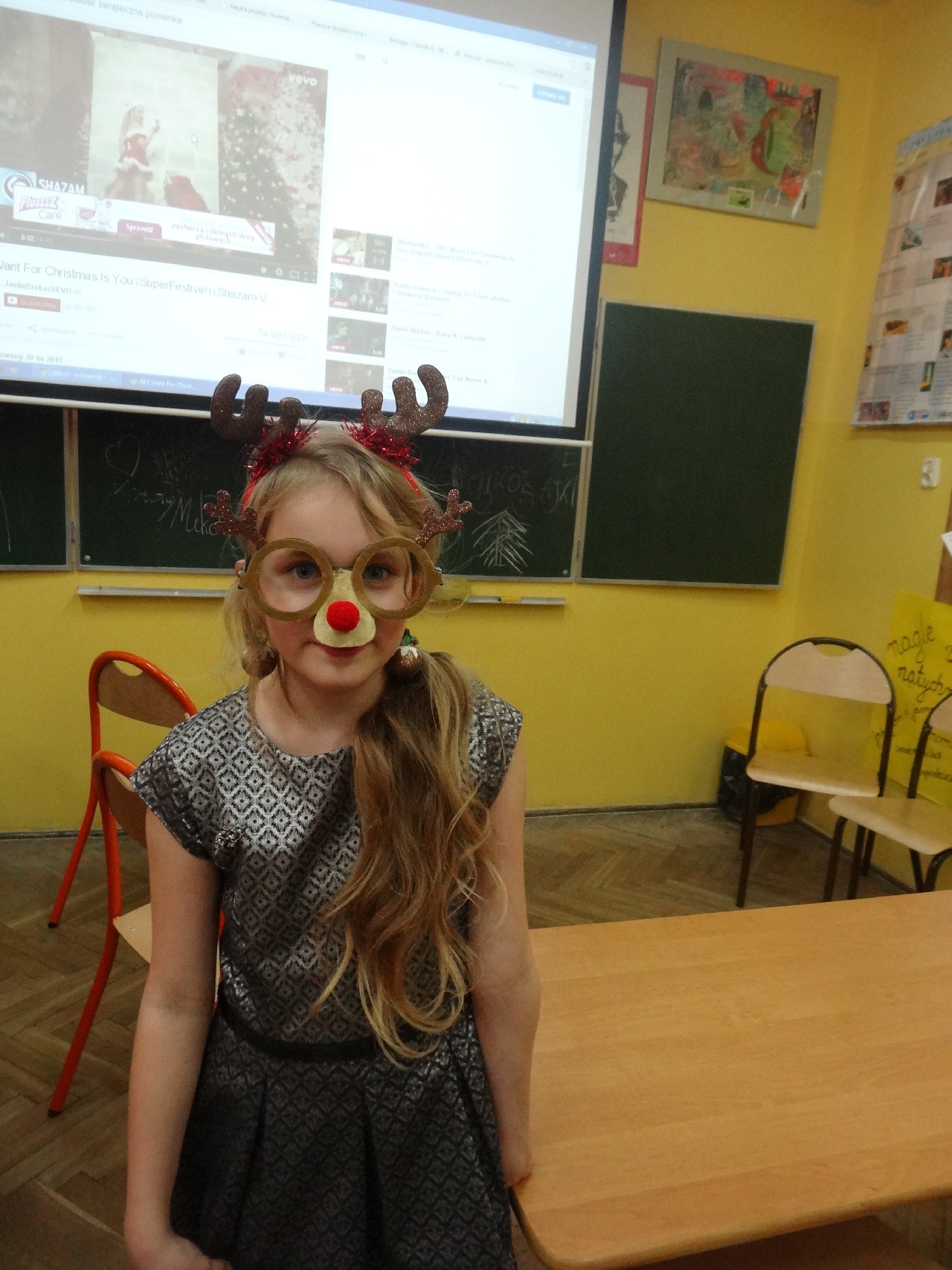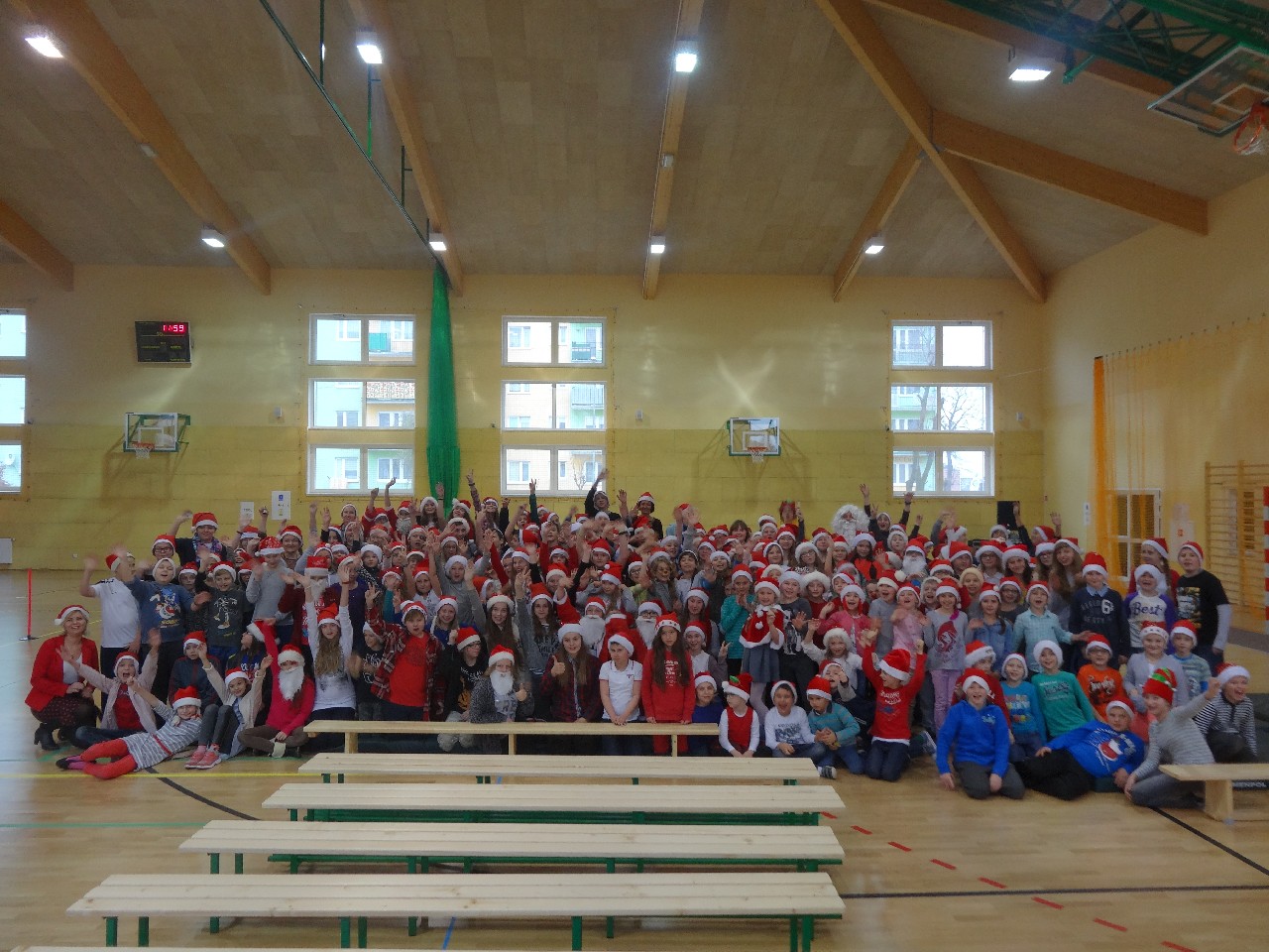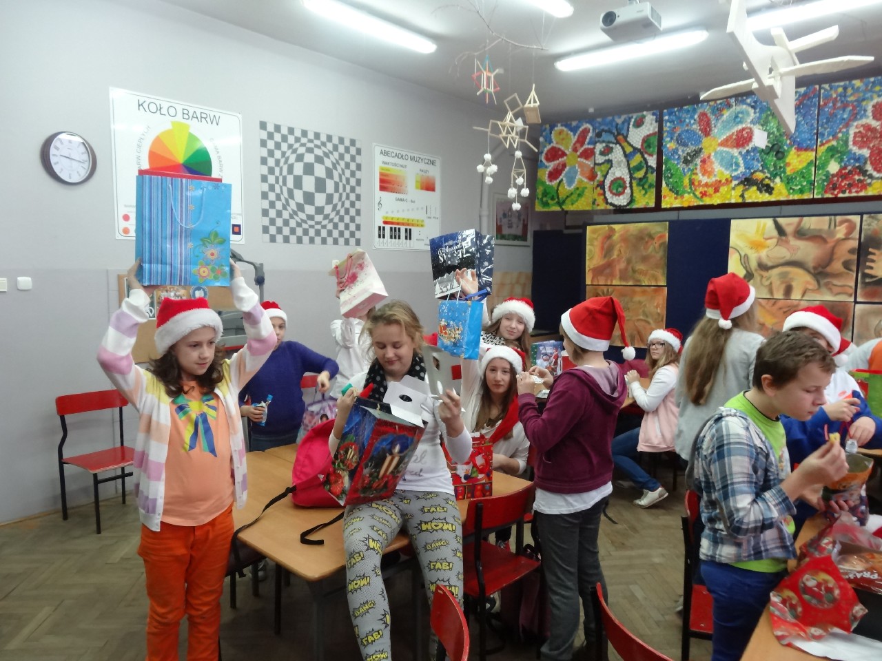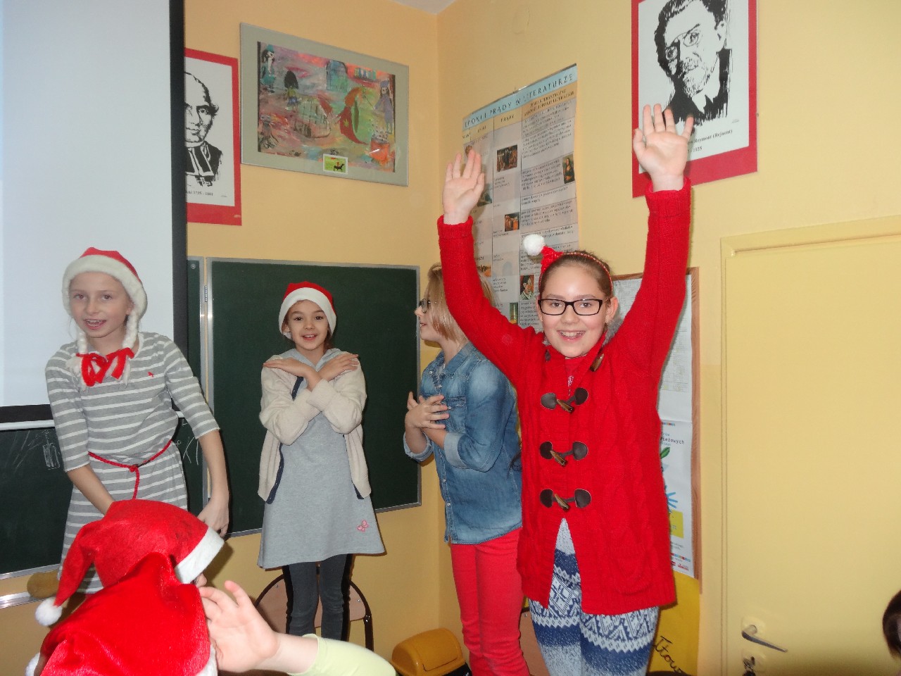 odwiedza nas prawdziwy Mikołaj z worem cukierków i rozdaje je uczniom, nie zważając, czy ktoś zasłużył bardziej czy mniej. O miłą atmosferę w tym dniu zadbali też uczniowie z sekcji rozrywki SU. Na przerwach można było posłuchać utworów wprowadzających nas w atmosferę nadchodzących świąt. W tym dniu mało kto nie posiadał czapki mikołajkowej, mieli je również nasi nauczyciele, co widać na wspólnej pamiątkowej fotografii.