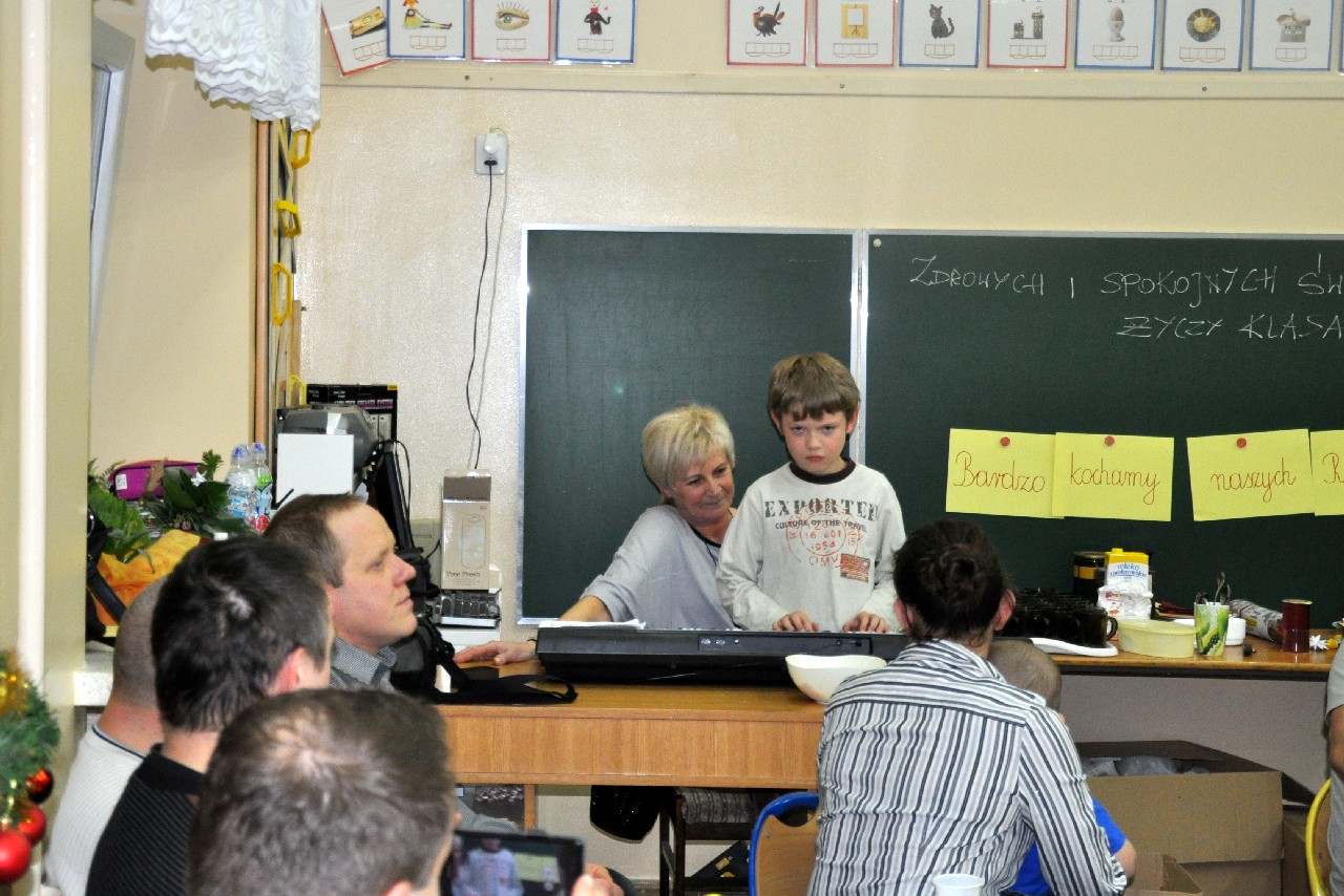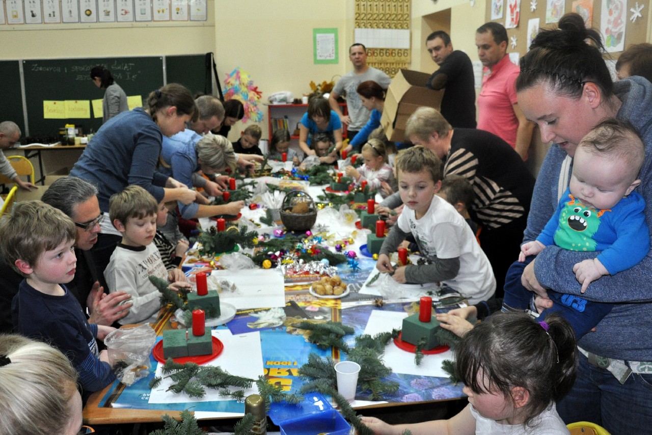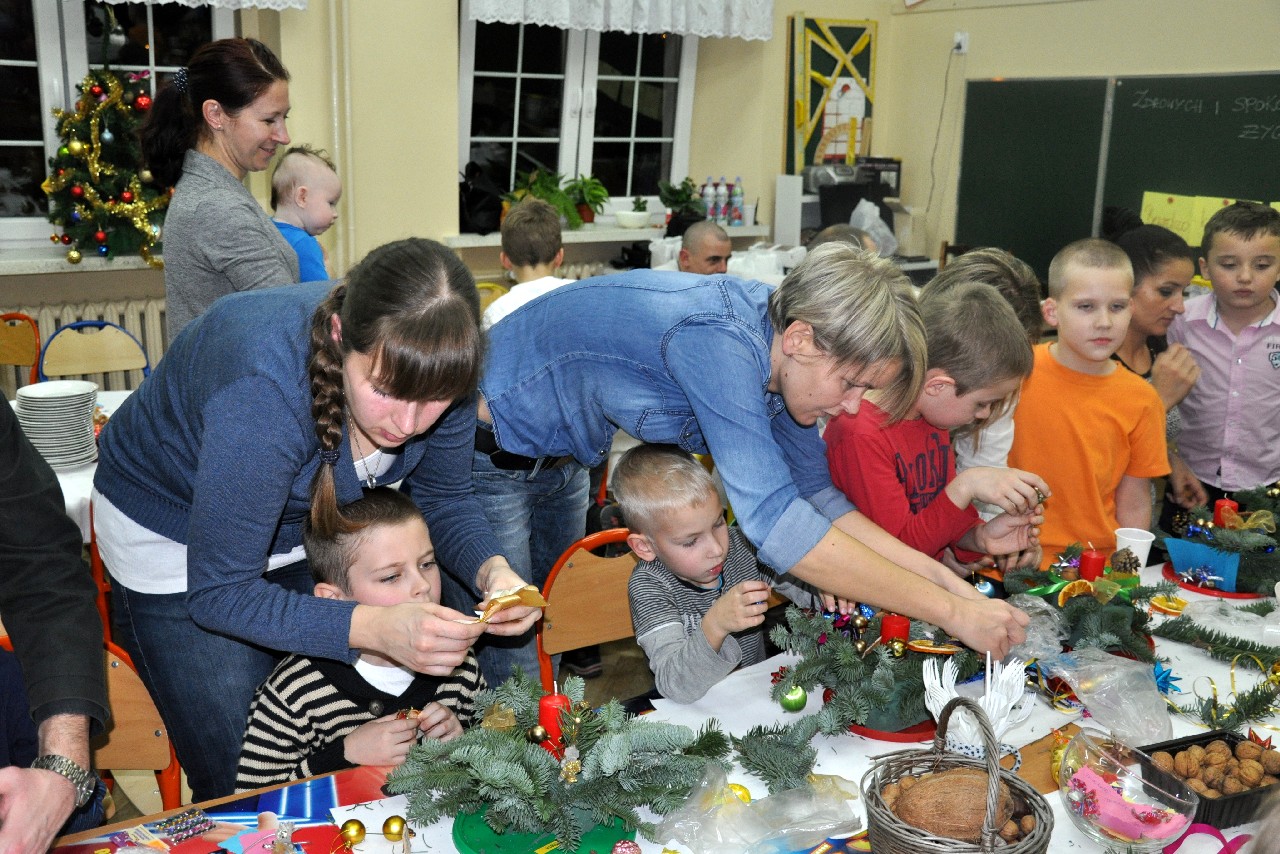 Dzieci wspólnie z rodzicami wykonały śliczne, pachnące stroiki, które potem przystrajały świąteczne stoły. Ozdabiały też lukrem pachnące pierniczki, malowały rajskie ptaki na choinkę. Wspólna praca dostarczyła wszystkim mnóstwo radości i zabawy; świetnie bawili się i „duzi i mali”. Tego wieczoru po raz pierwszy mieliśmy przyjemność posłuchać kolęd w wykonaniu ucznia Witka Sobczaka, który pięknie grał na keyboardzie. Spotkanie upłynęło w radosnej i przyjemnej atmosferze. Dziękujemy wszystkim rodzicom, którzy przyczynili się do tego, aby ten wieczór był magiczny i wyjątkowy… dziękujemy za Państwa obecność.