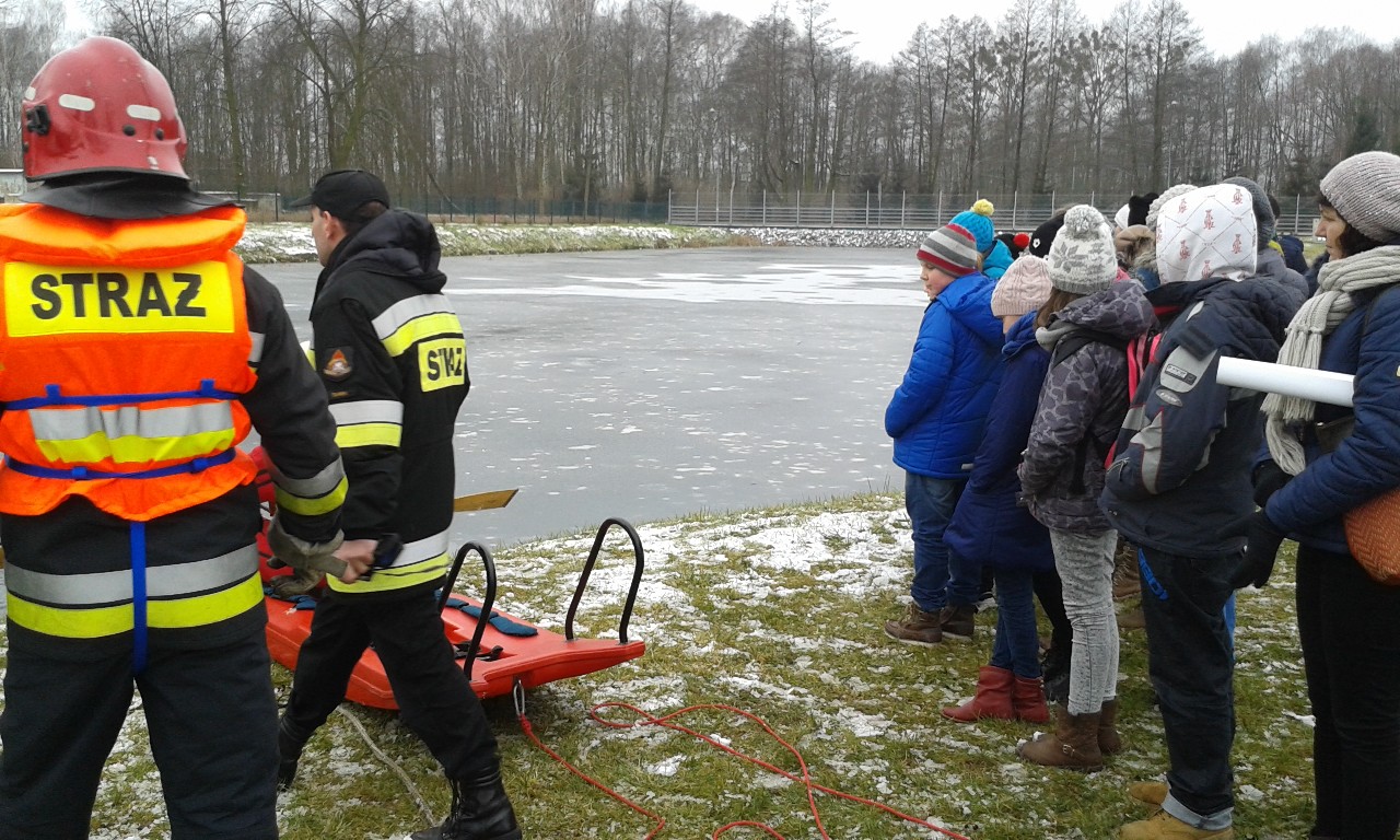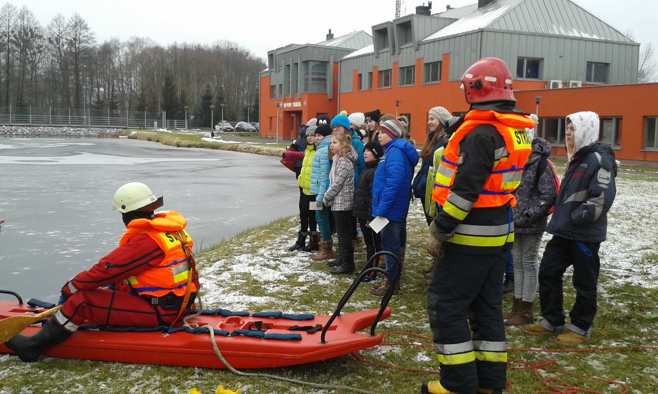 Państwowej Straży Pożarnej w Turku. Panowie strażacy wraz z przedstawicielami Policji przeprowadzili szkolenie na temat bezpieczeństwa podczas zbliżających się ferii zimowych. Policjanci omówili bezpieczne zachowanie w szkole, w domu oraz na drodze, natomiast strażacy edukowali nas w zakresie wyposażenia domów w czujniki tlenku węgla. Na koniec spotkania strażacy zaprezentowali nam praktyczne zagrożenia wiążące się z zachowaniem na cienkim lodzie oraz pokazem ratownictwa wodno – lądowego na zbiorniku wodnym na terenie Komendy.