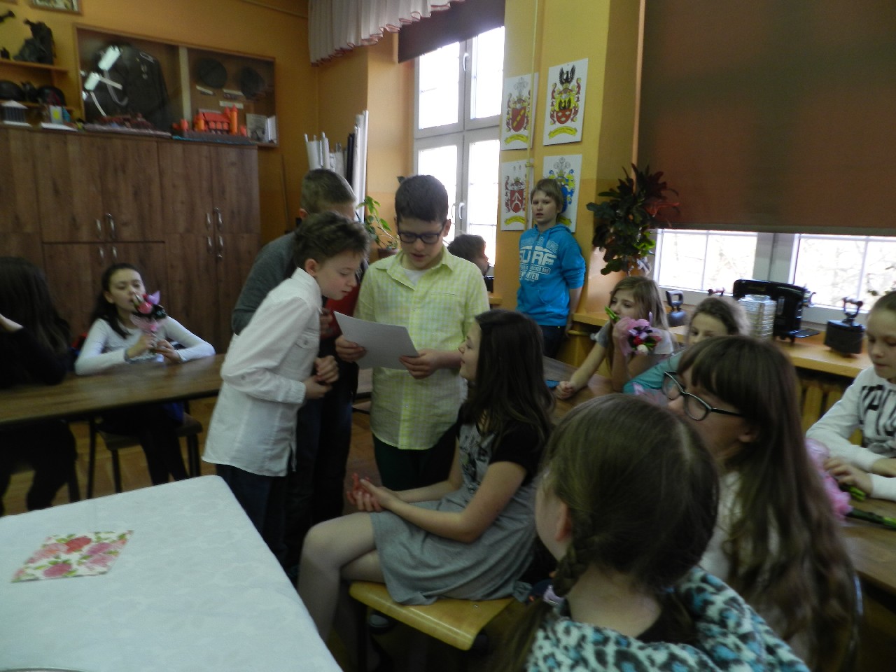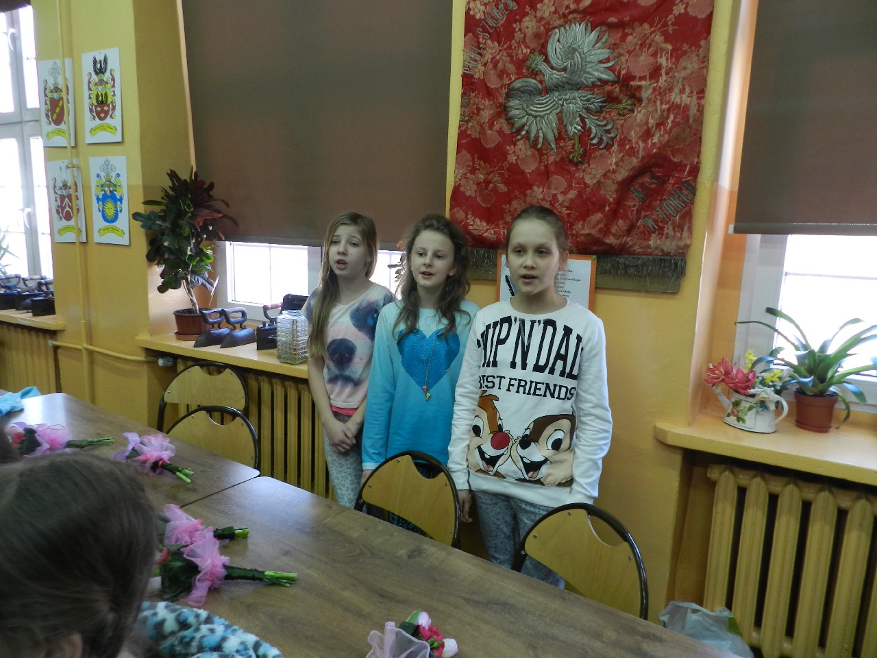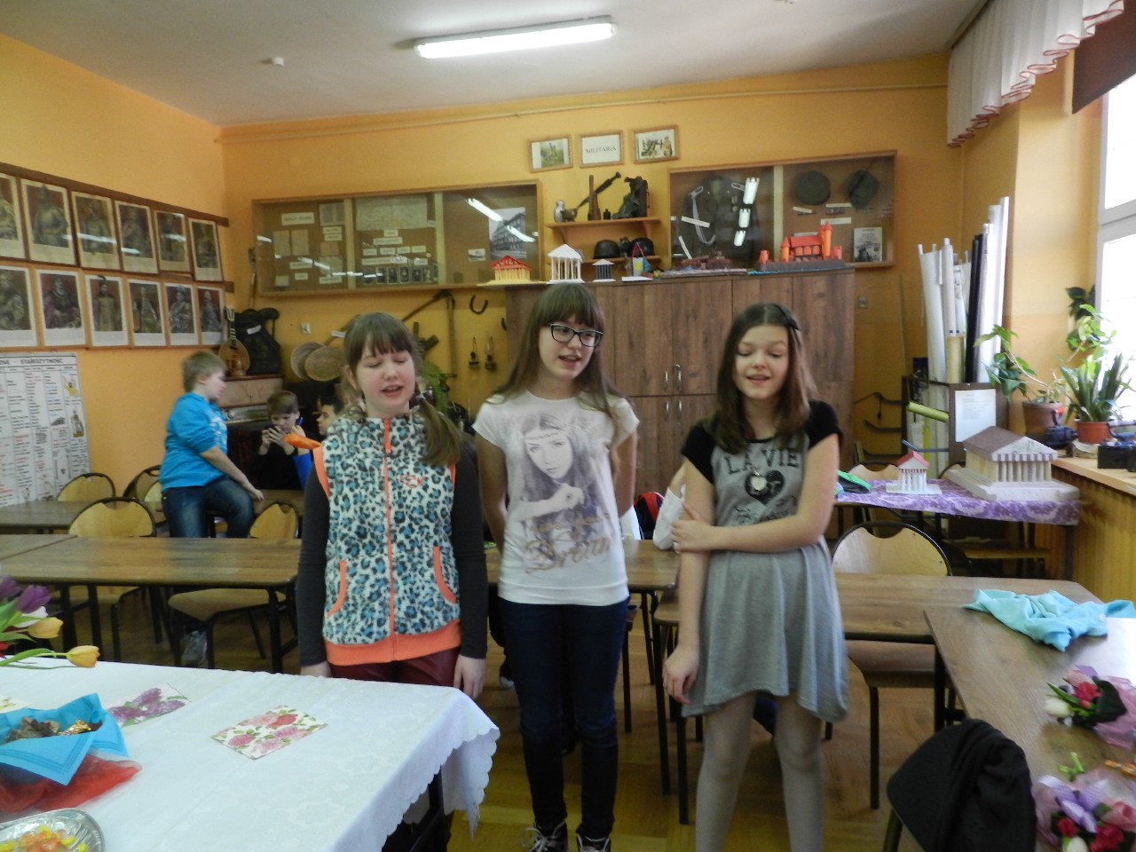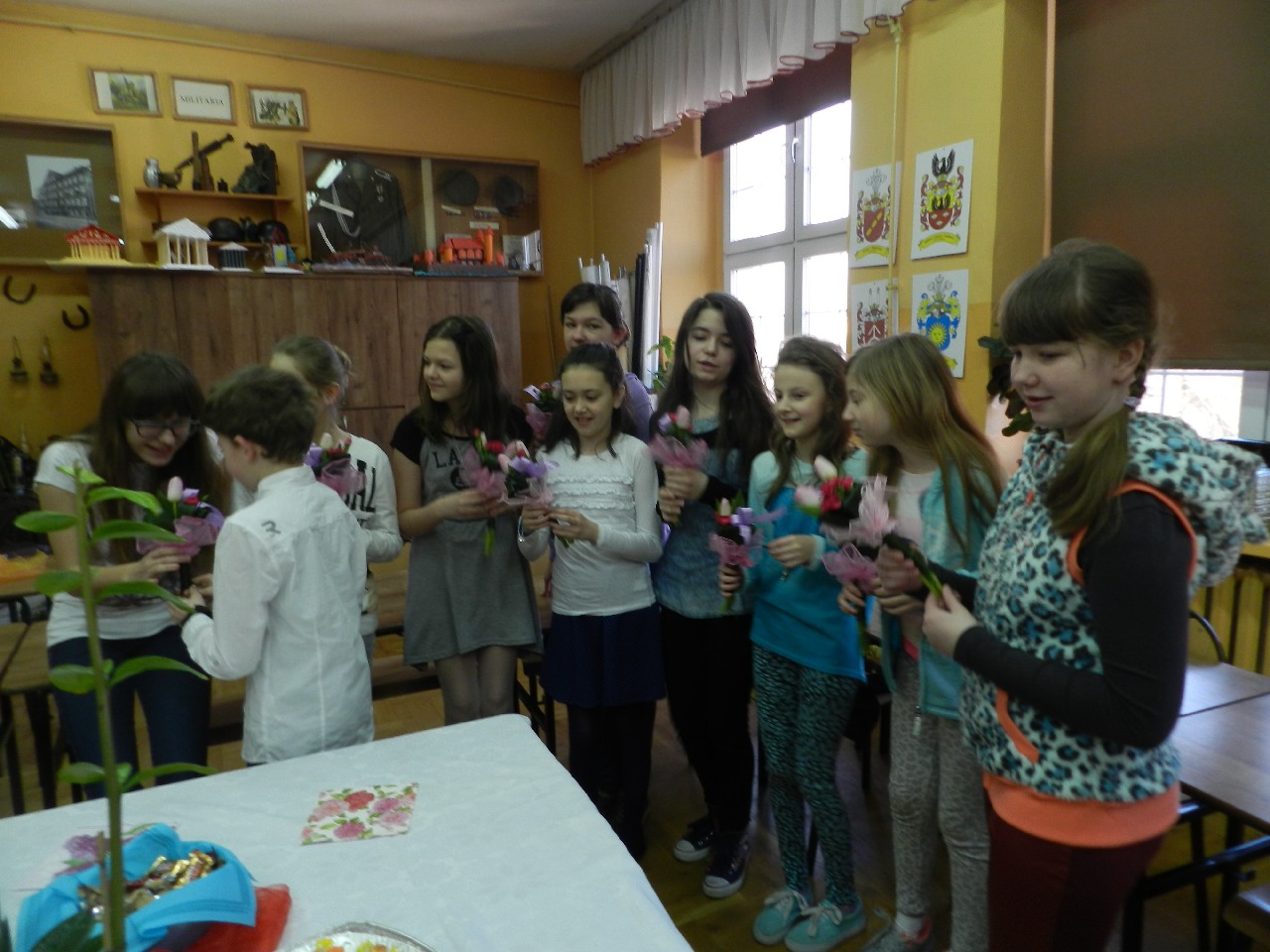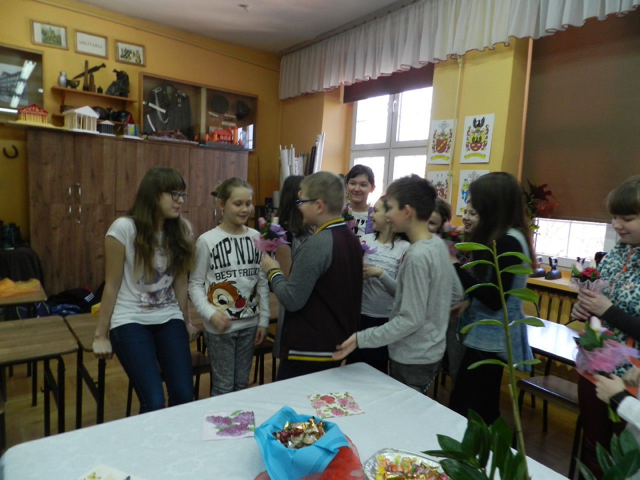 W poniedziałek 9 marca 2015 roku SU w naszej szkole zorganizował obchody Dnia Kobiet święta pań i dziewczynek. Na przerwach chłopcy z klasy 5e Aleks Walczykowski i Kacper Latuszewski zorganizowali koncert żywej muzyki. Również inni koledzy mogli złożyć życzenia lub napisać pozdrowienia na dużej laurce. Dziewczynkom bardzo się podobało czuły się w tym dniu wyróżnione i docenione.