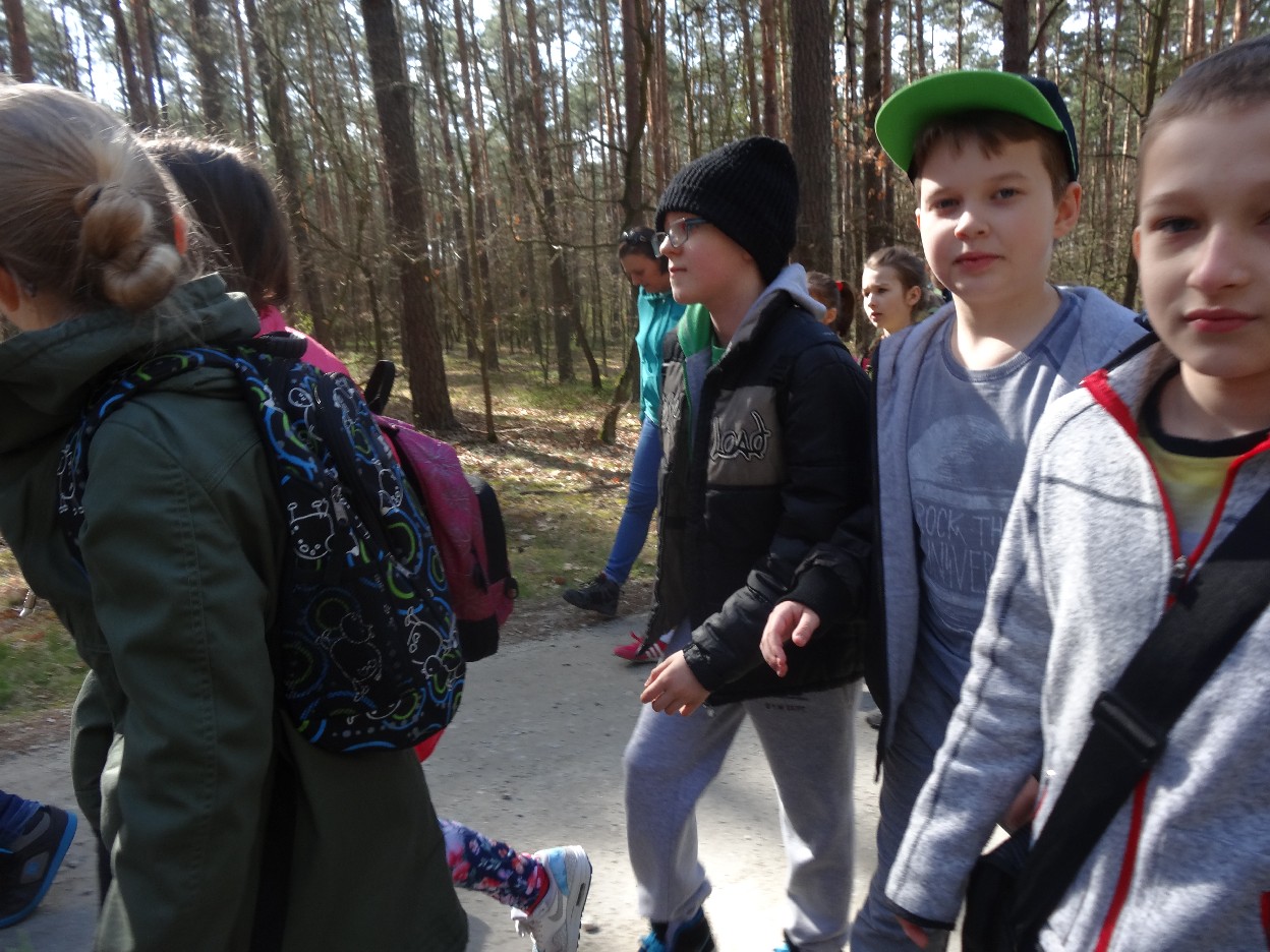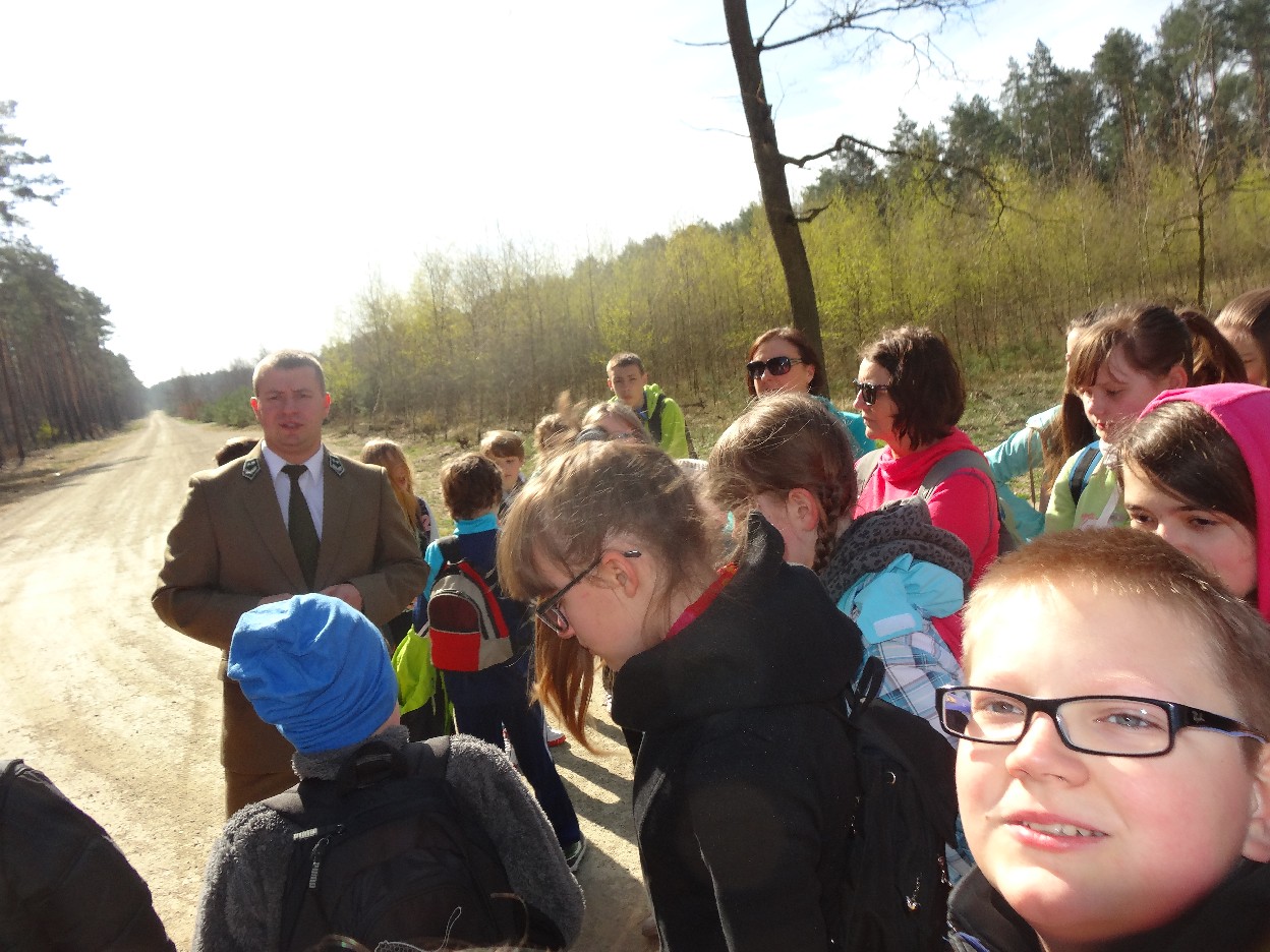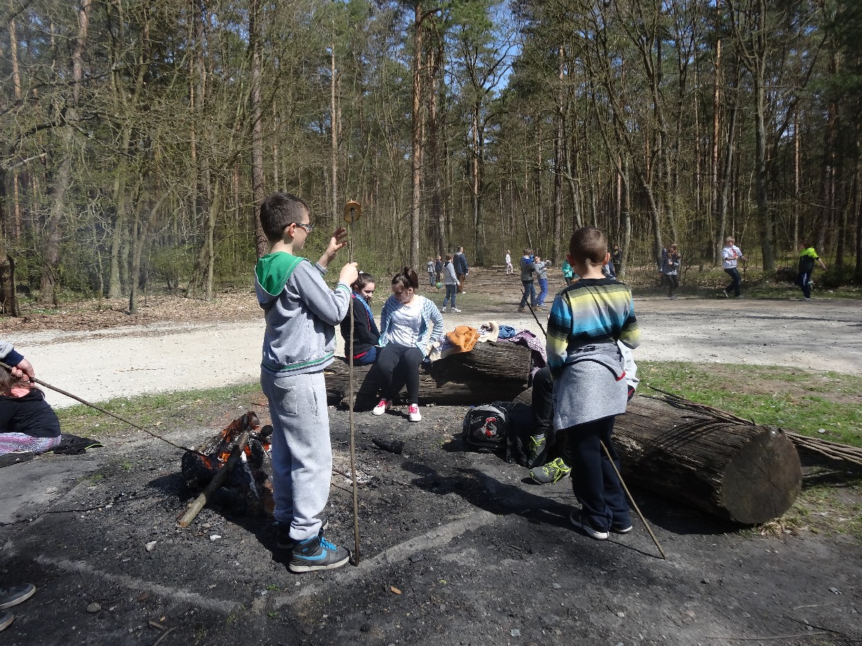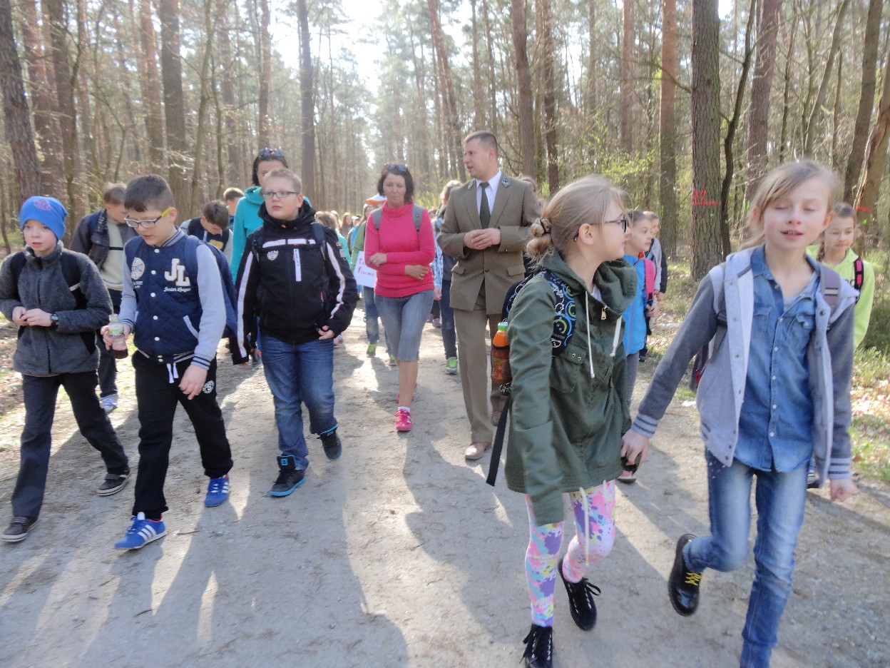 Wszyscy zebraliśmy się w szkole o godzinie 8:20, a dziesięć minut później wyruszyliśmy. Pogoda nam sprzyjała. Słońce świeciło, ale nie było zbyt gorąco. Dotarliśmy do lasu i odbyliśmy spacer po nim. Zadzieraliśmy w górę głowy, aby ujrzeć korony drzew. Z zaciekawieniem słuchaliśmy pana leśnika. Dowiedzieliśmy się, że ta duże rośliny doskonale chronią przed wiatrem. Samica sarny to koza, jelenia – łania. Obserwowaliśmy ptaki, przypatrywaliśmy się sadzonkom. Teraz wiemy co jest najlepszym lekarstwem na chore gardło. Po długim marszu dotarliśmy na polanę. Tam, w specjalnie przygotowanym miejscu odbyło się ognisko. Każdy upiekł kiełbaski, niektórzy nawet chleb czy bułki. Mieliśmy też czas na porozmawianie ze sobą, gry i zabawę. Około godziny 12:00 wyruszyliśmy z powrotem do szkoły. Zaszliśmy tam o 12:25. Po takim dniu w lesie każdy czuł się lepiej.