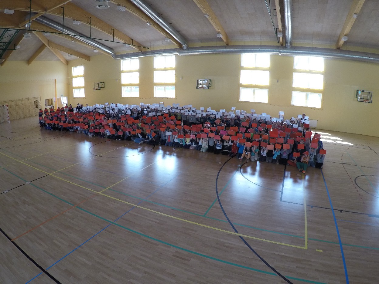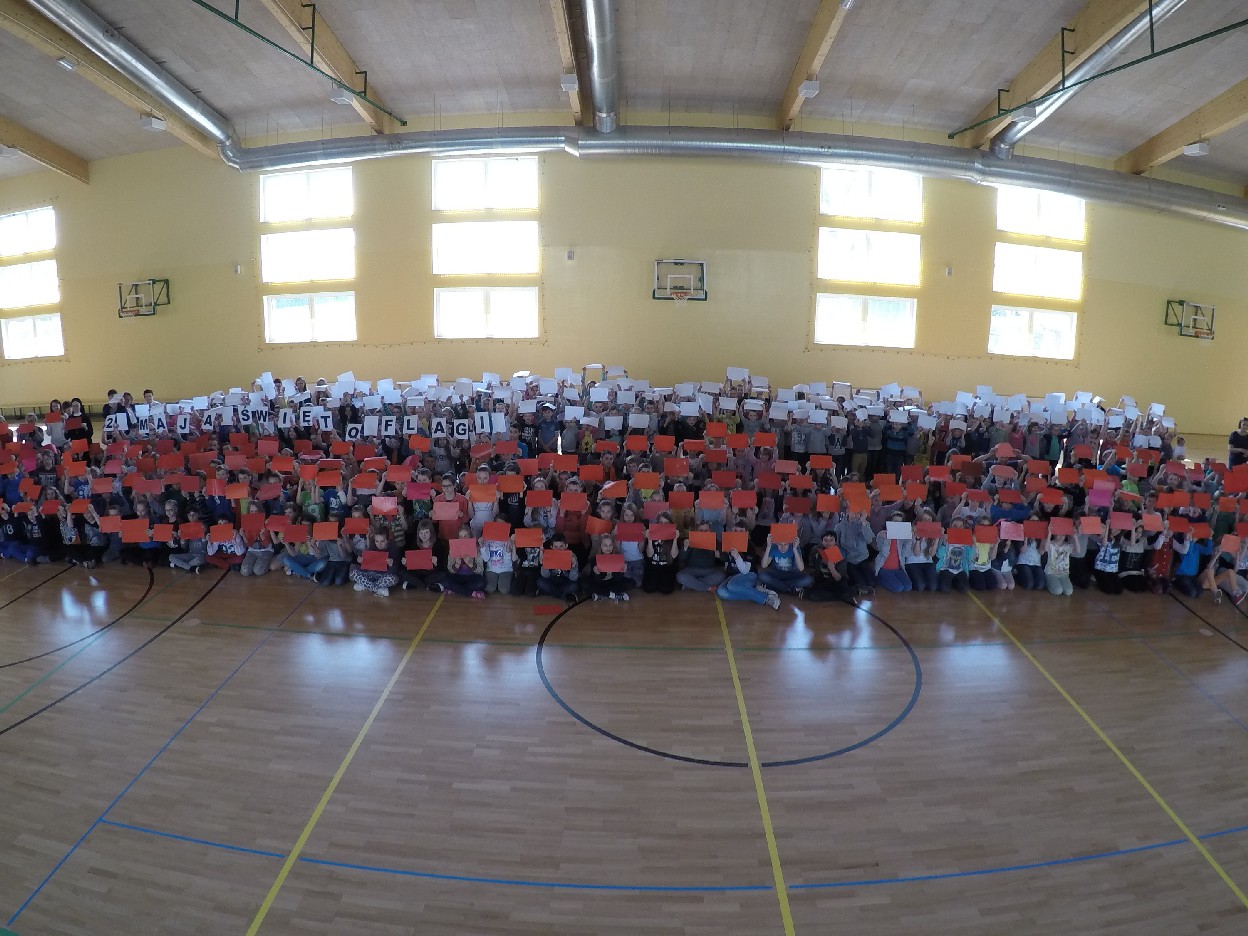 O godzinie 10.40 wszyscy uczniowie i nauczyciele zebrali się na hali sportowej. Na początku kolega z klasy 5e Wojtek Ślósarski odczytał tekst dotyczący powstania flagi Rzeczypospolitej Polskiej, z którego dowiedzieliśmy się od kiedy oficjalnie została przyjęta jako symbol narodowy, skąd wzięła się jej kolorystyka oraz wielu innych ciekawych rzeczy na jej temat. Następnie zaczęliśmy ustawiać się w żywą flagę. Uczniowie klas 1-3 trzymali w rękach kartki koloru białego, a klas 4-6 koloru czerwonego. Natomiast koledzy i koleżanki z klasy 5e trzymali napis Drugi maja Święto Flagi. Kiedy wszyscy unieśliśmy ręce do góry, tworząc flagę Rzeczypospolitej Polskiej, dron wzbił się w powietrze i zaczął robić pamiątkowe zdjęcia. Tego roku również udało nam się zrobić piękną, żywą flagę i pokazać w ten sposób, że szanujemy ją jako symbol naszego kraju. Po wykonaniu fotografii powróciliśmy do klas na lekcje.